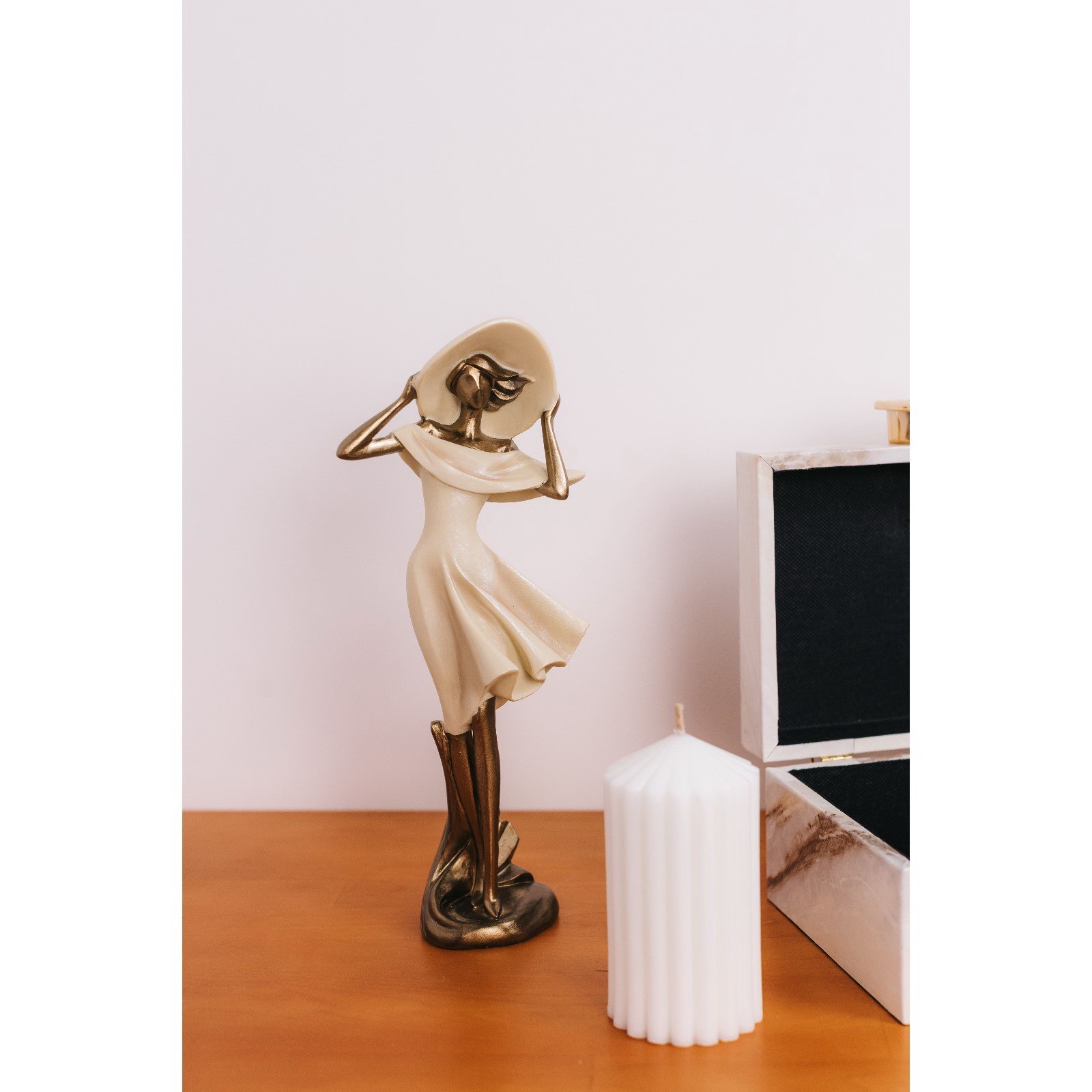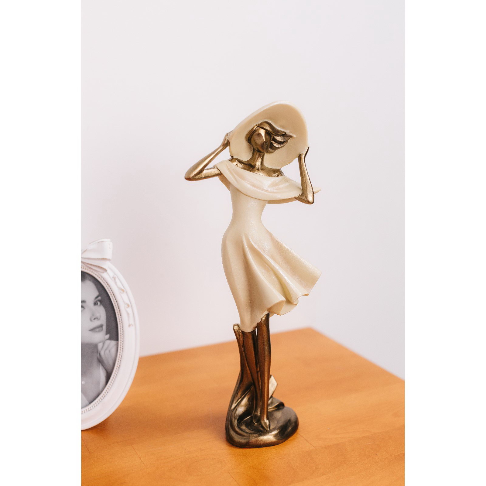 Фигура полистоун "Девушка в широкополой шляпе. Ветер", песочная с бронзой, 12.5x9.5x31 см, 9.5x12.5x31 см., Китай