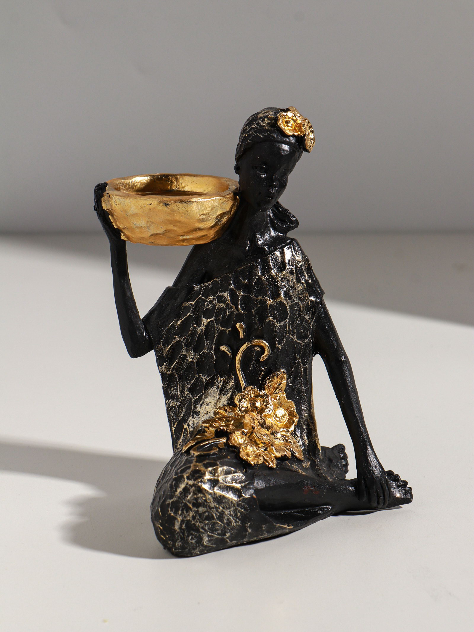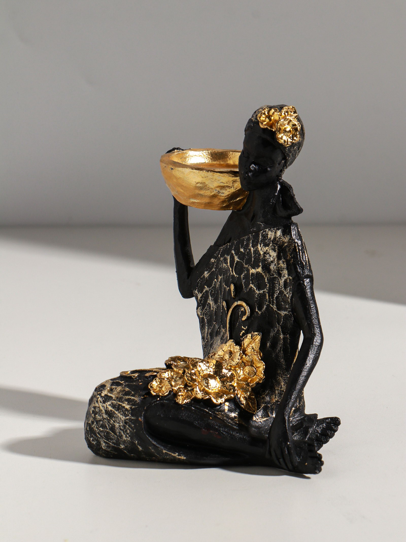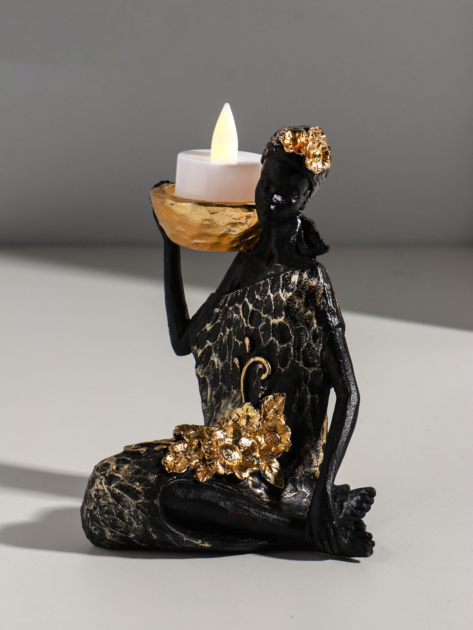 Фигурка-подсвечник на 1 свечу "Африканка в чёрном платье с цветами с золотом", полистоун, d=4.5 см, 11x13x16 см, 13x11x16 см., Китай