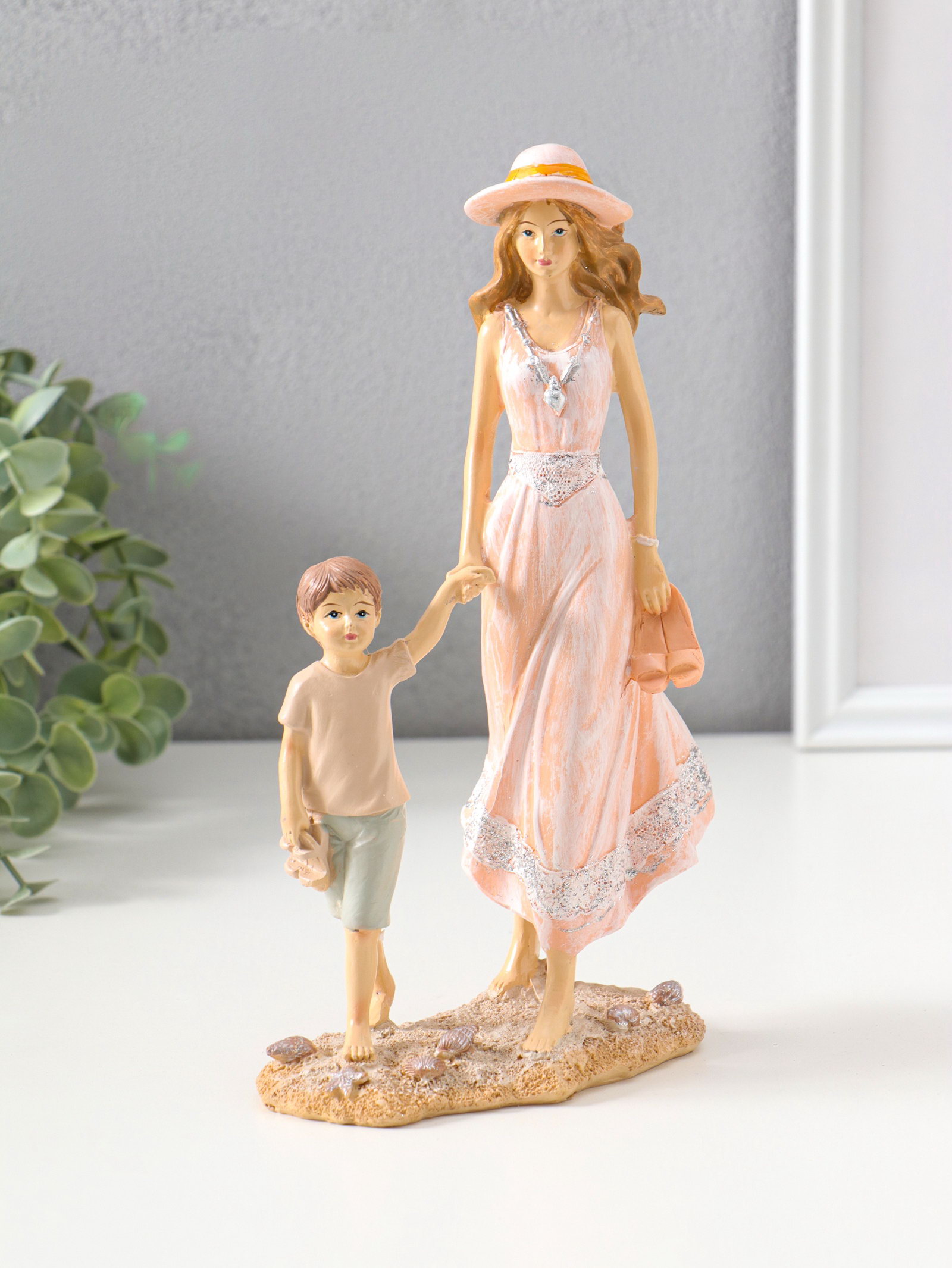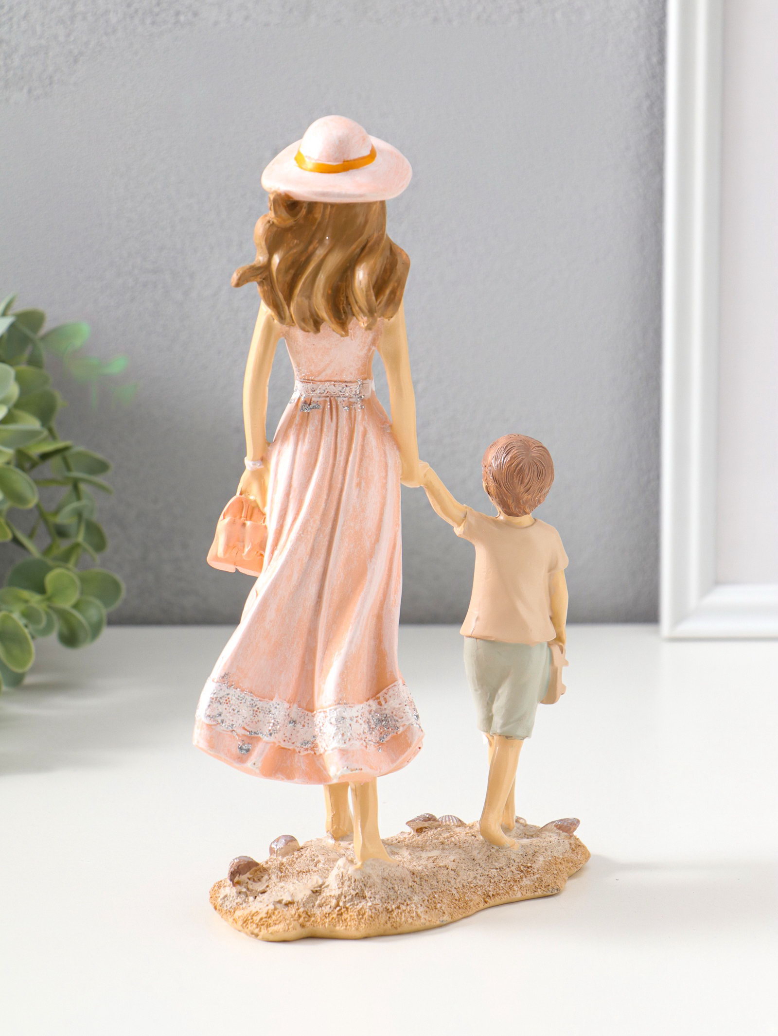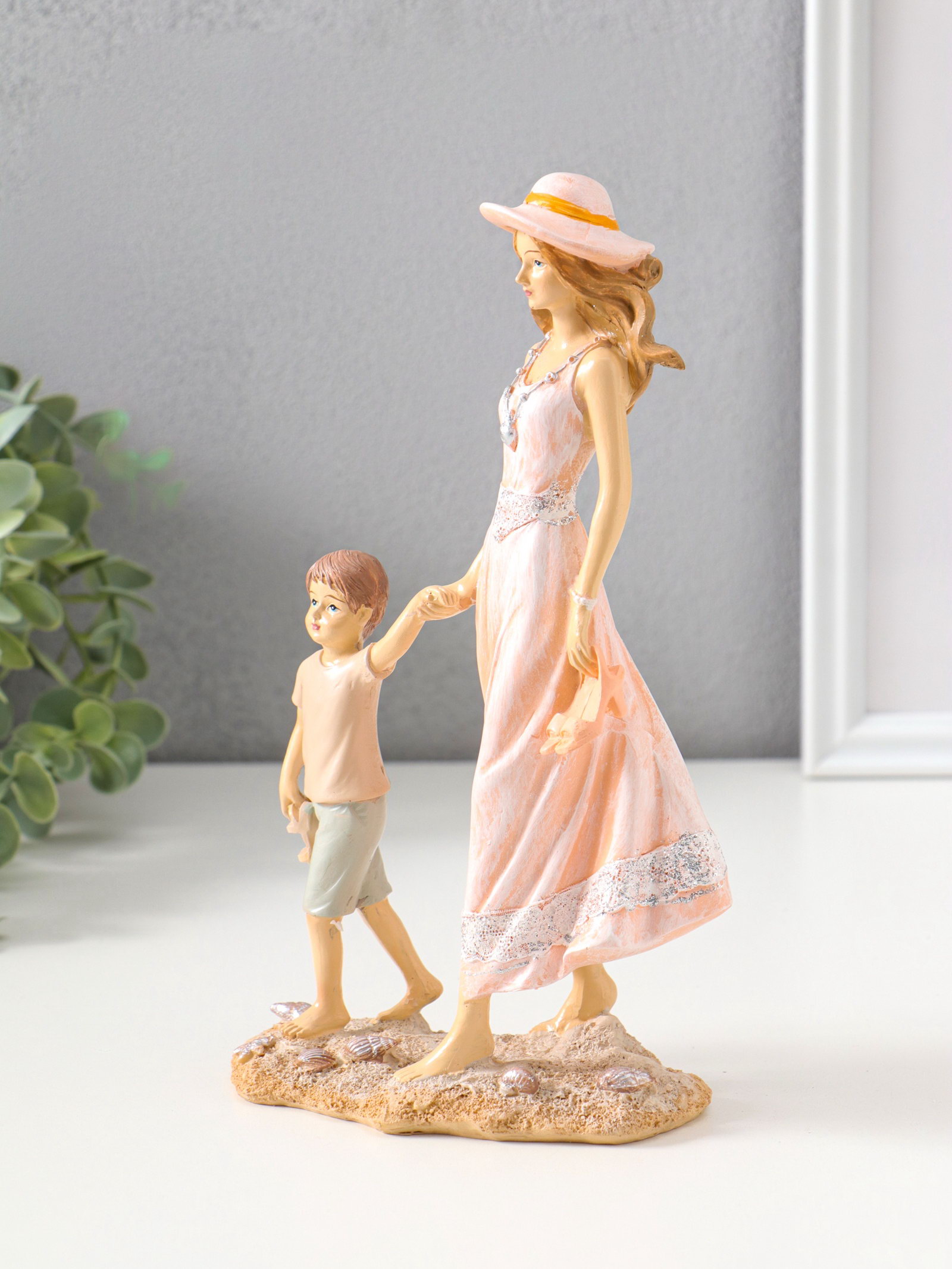 Фигура полистоун "Мама в розовом платье и шляпке гуляют с сыном по пляжу", 23.5 см, 7x14x23.5 см., Китай