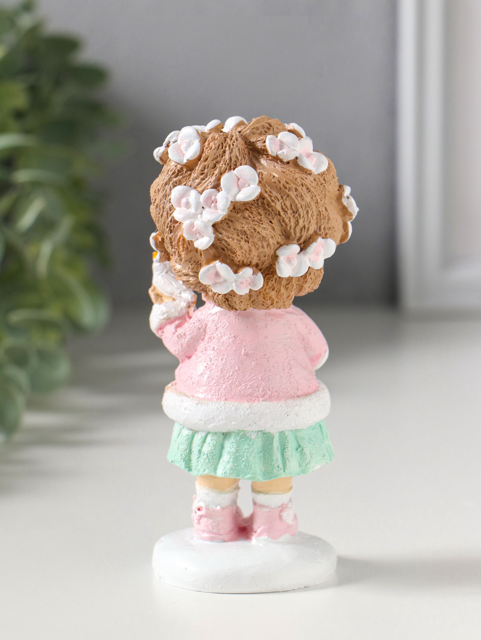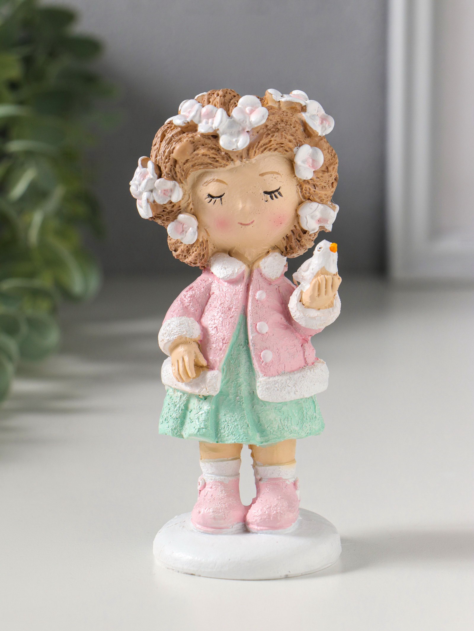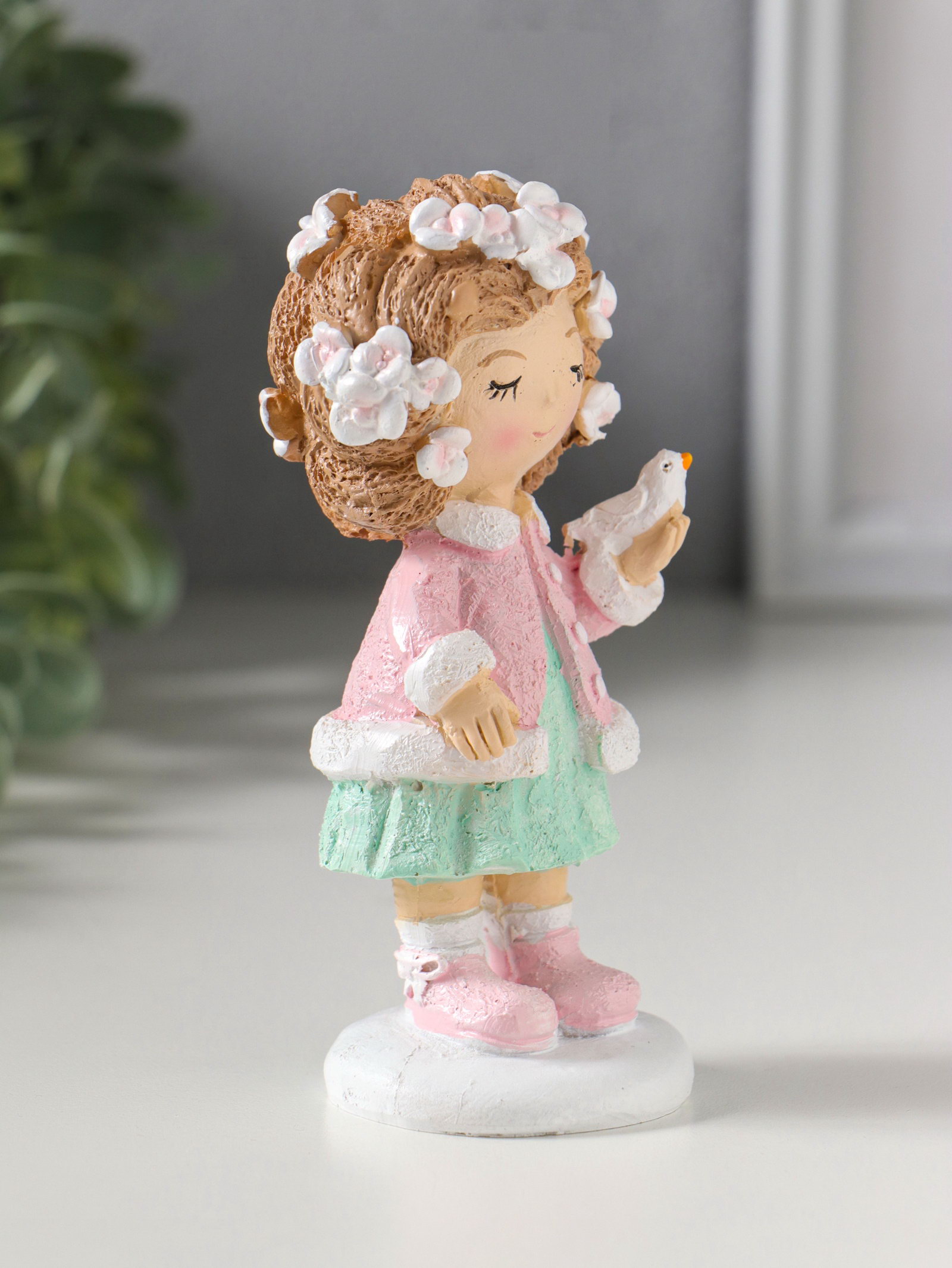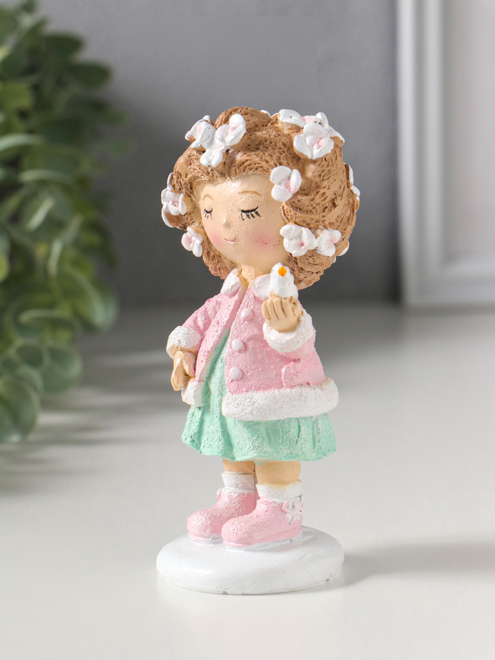 Фигурка полистоун "Малышка с цветами в волосах, с птичкой на ладони", 5.5x5.5x12 см, 5.5x5.5x12 см., Китай