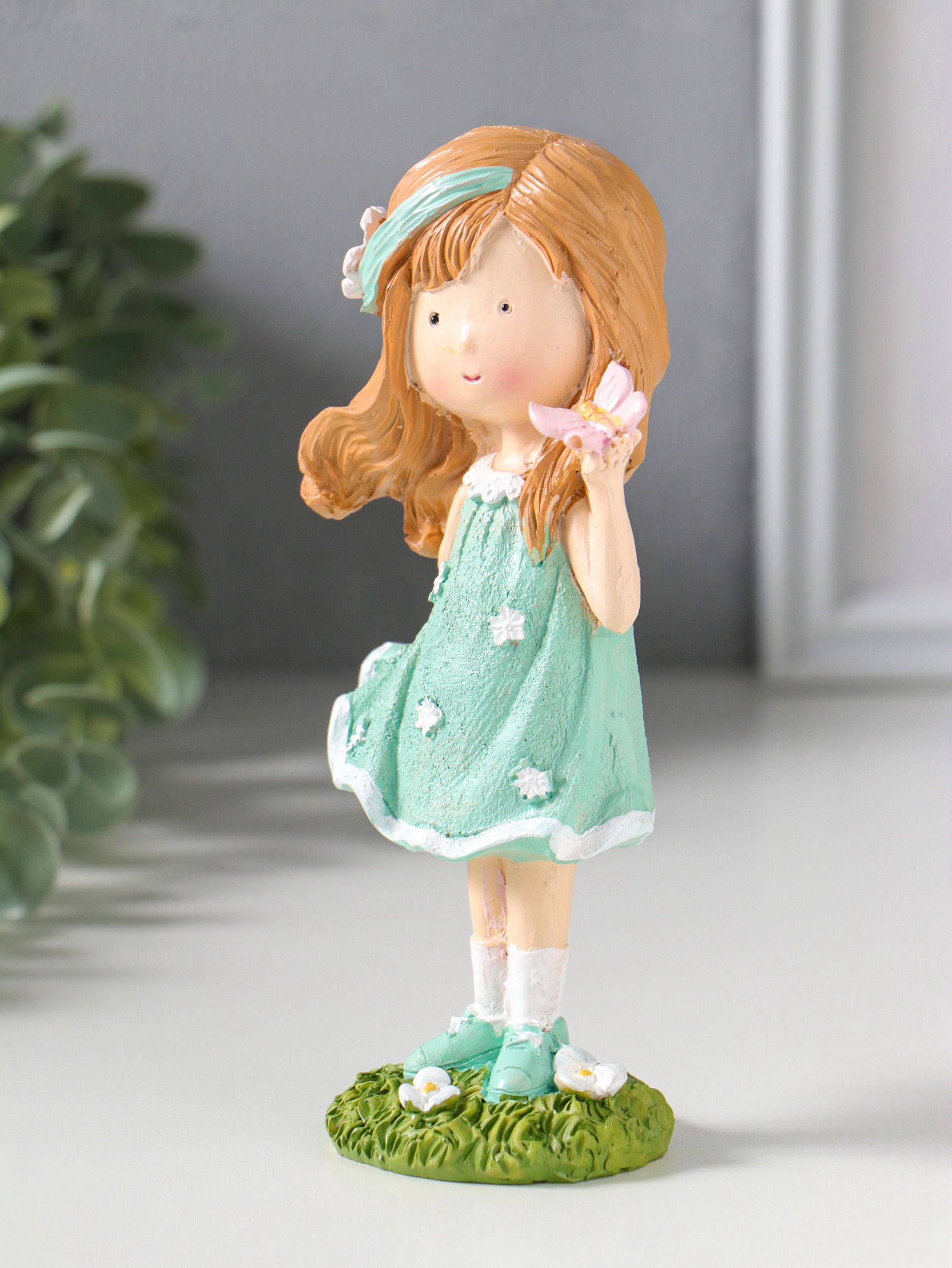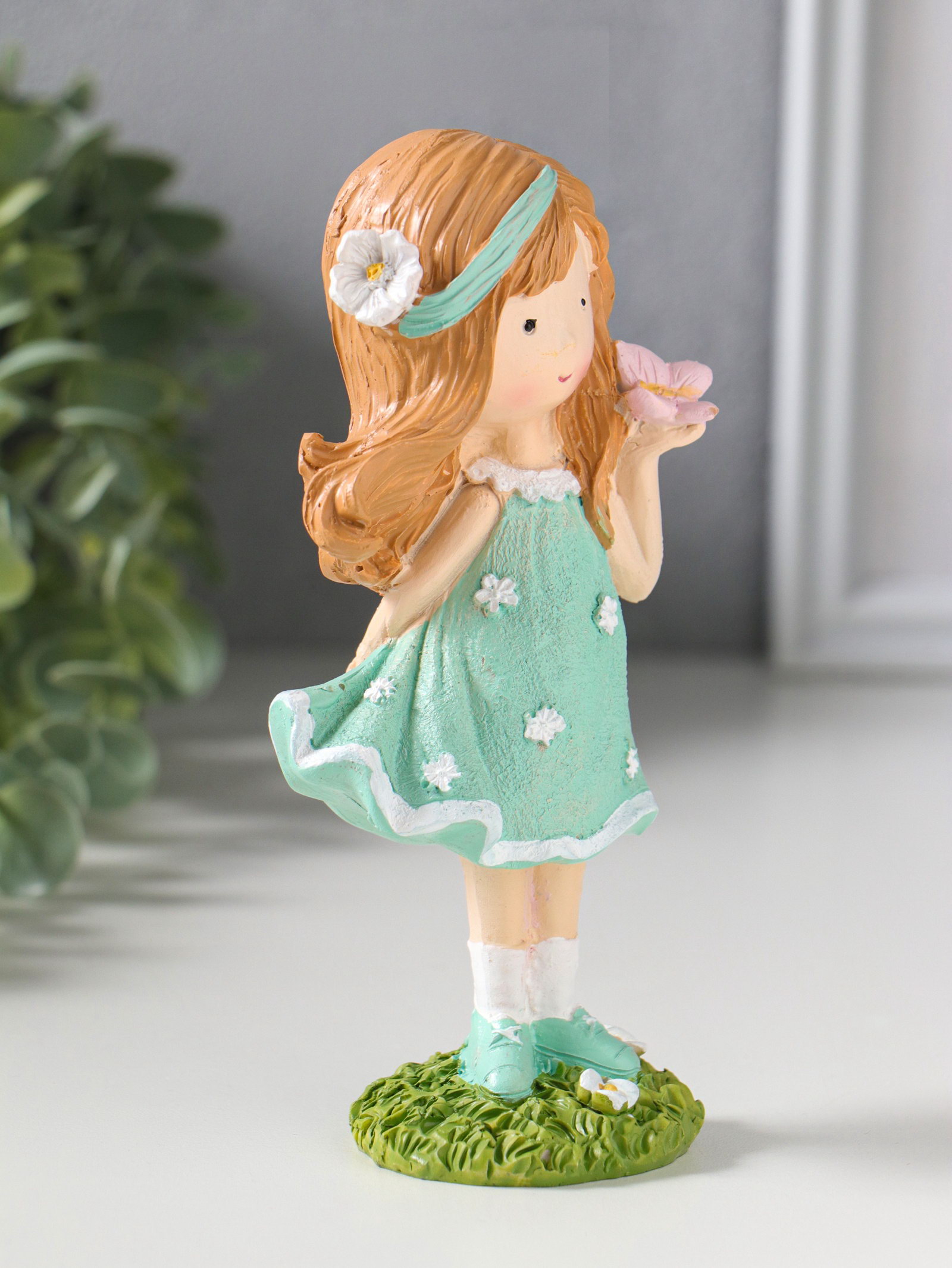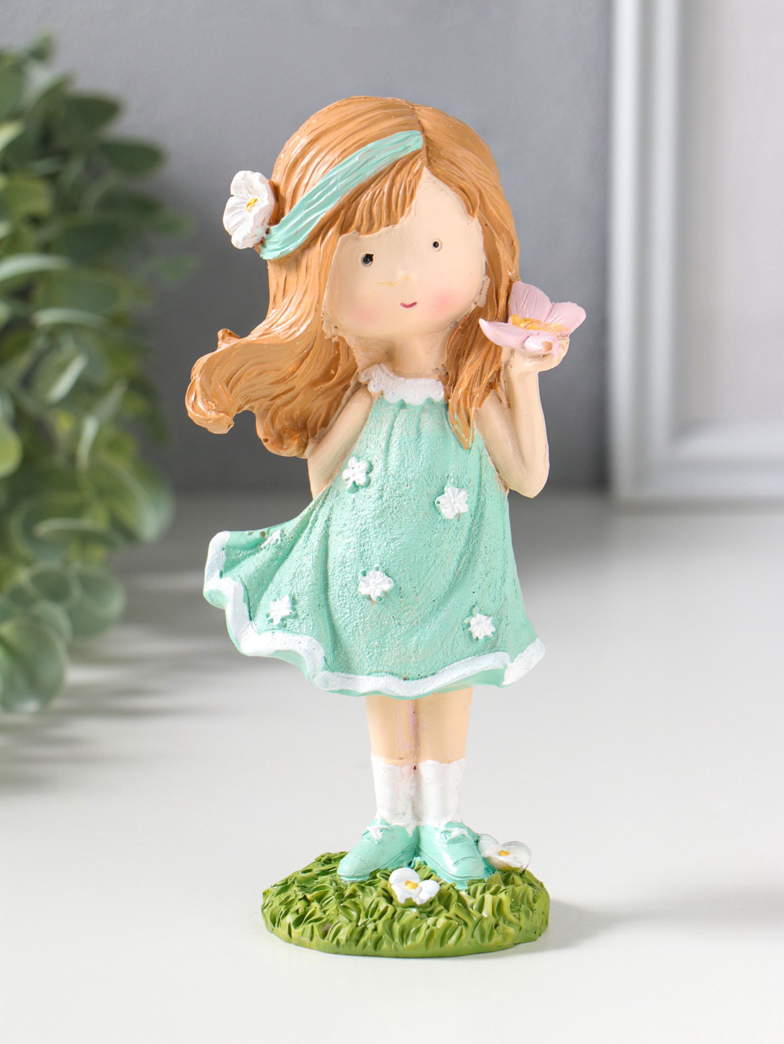 Фигурка полистоун "Малышка в зелёном платье с цветами, с бабочкой на ладони", 7.5x5x15.5 см, 5x7.5x15.5 см., Китай
