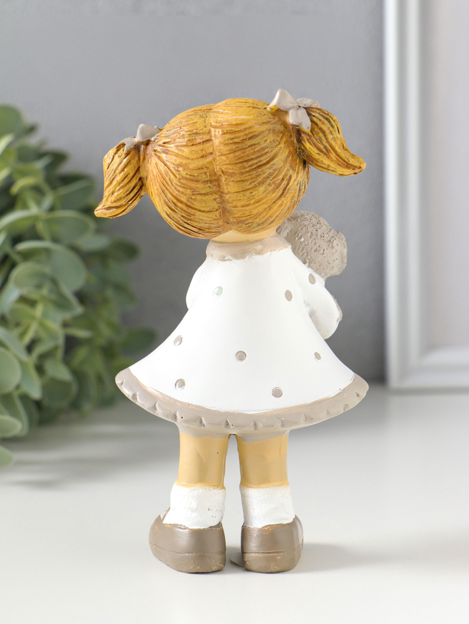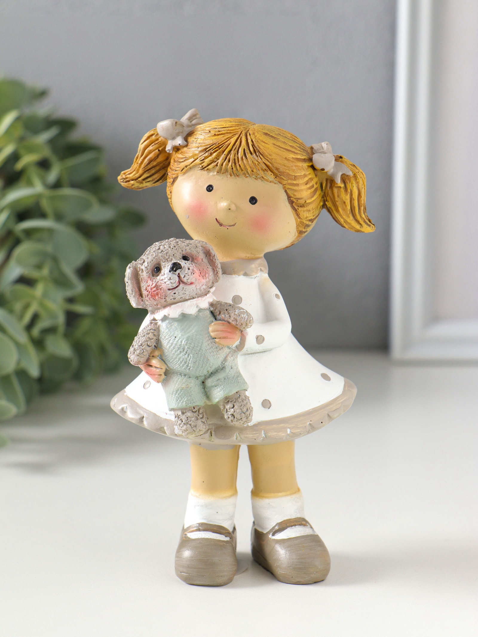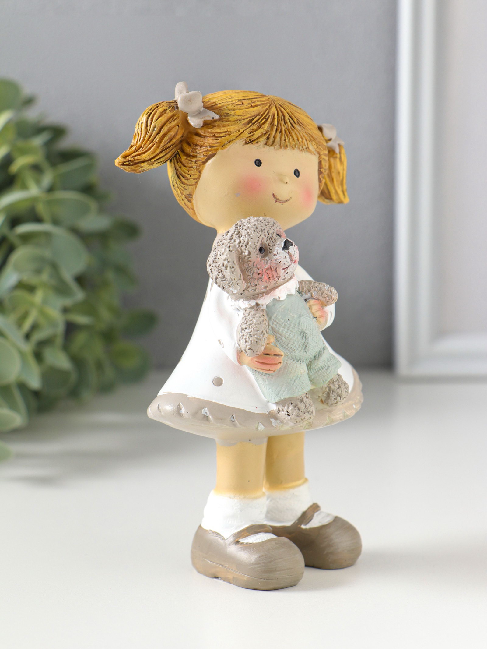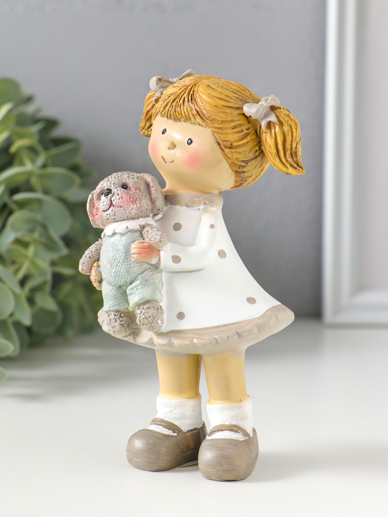 Сувенир полистоун "Девочка с хвостиками в белом платье в горох, с щенком" 8.5х5.5х13 см, 5.5x8.5x13 см., Китай