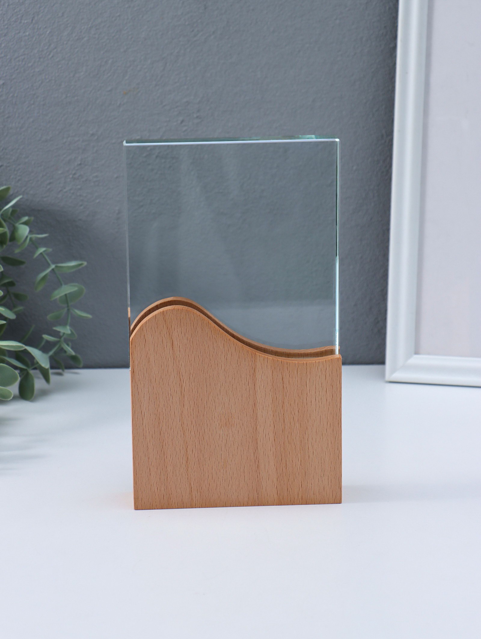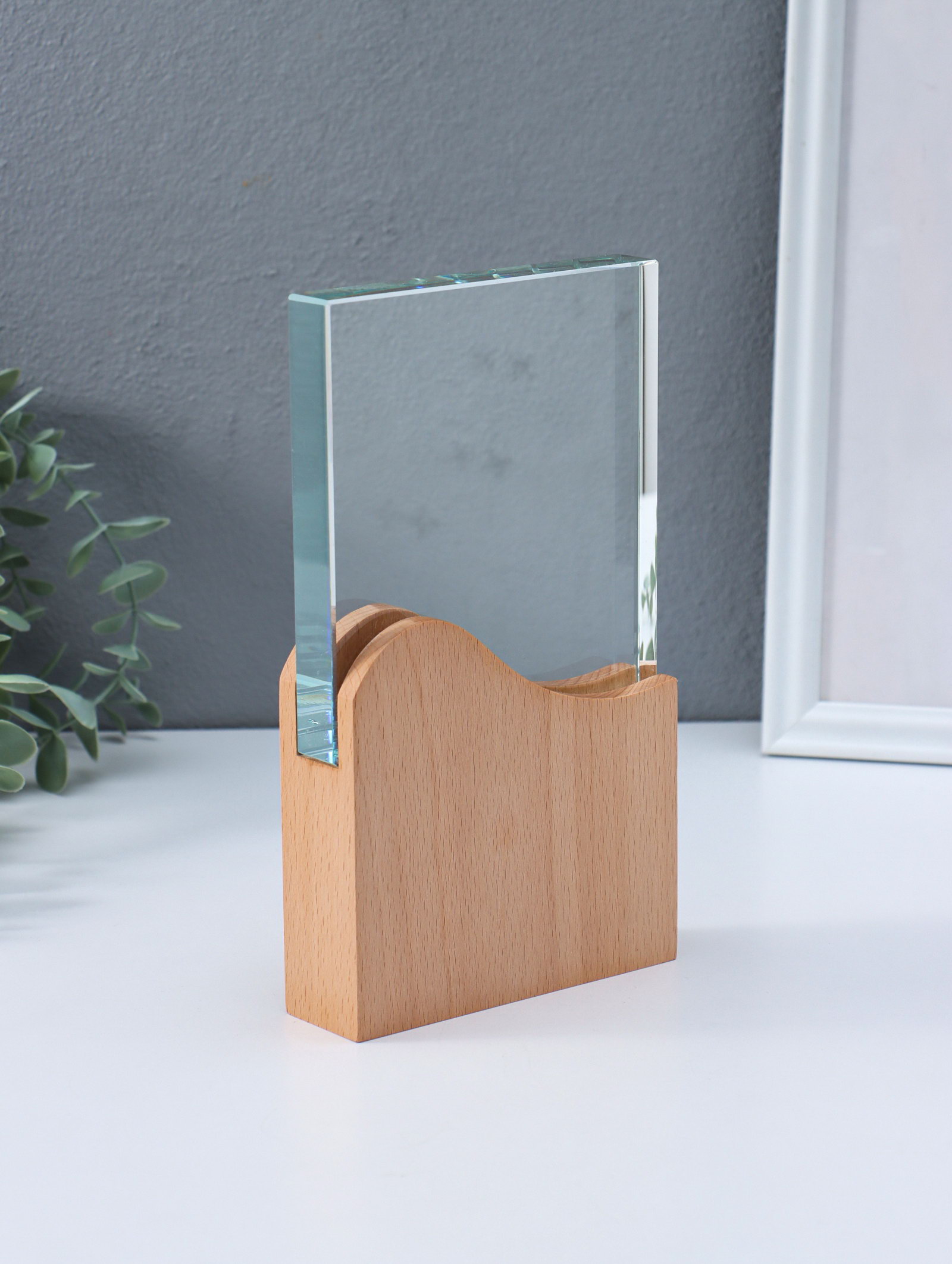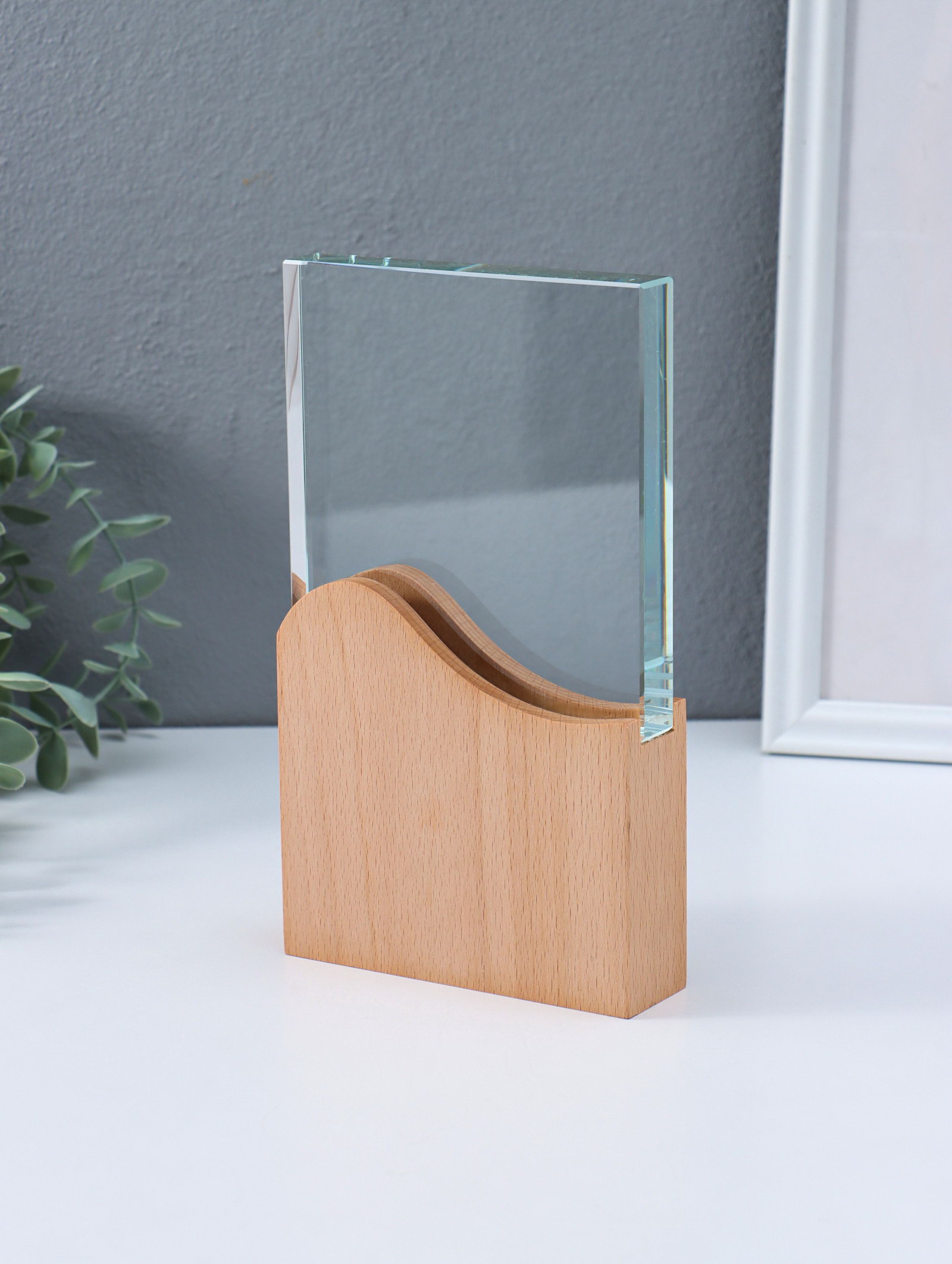 Наградная фигура стела "Волна", верх 12.3x12.2 см; низ 12.3x12 см, стекло, дерево, 3.5x12x21.3 см, 12x3.5x21.3 см., Китай