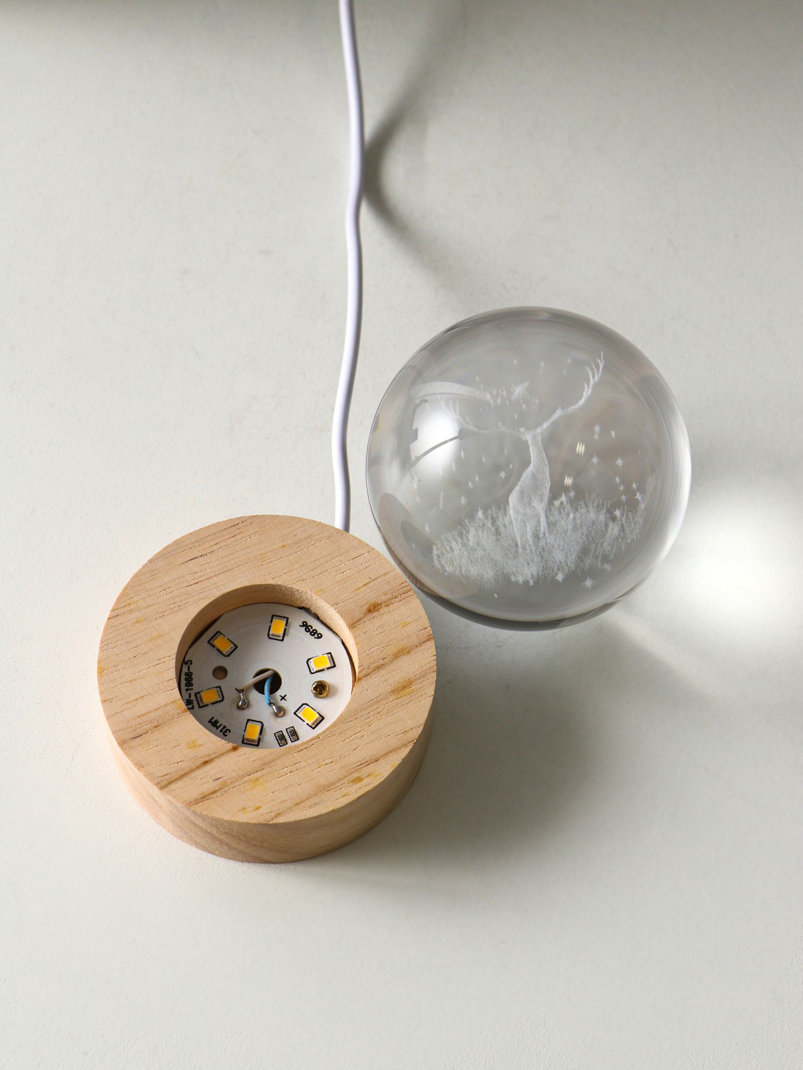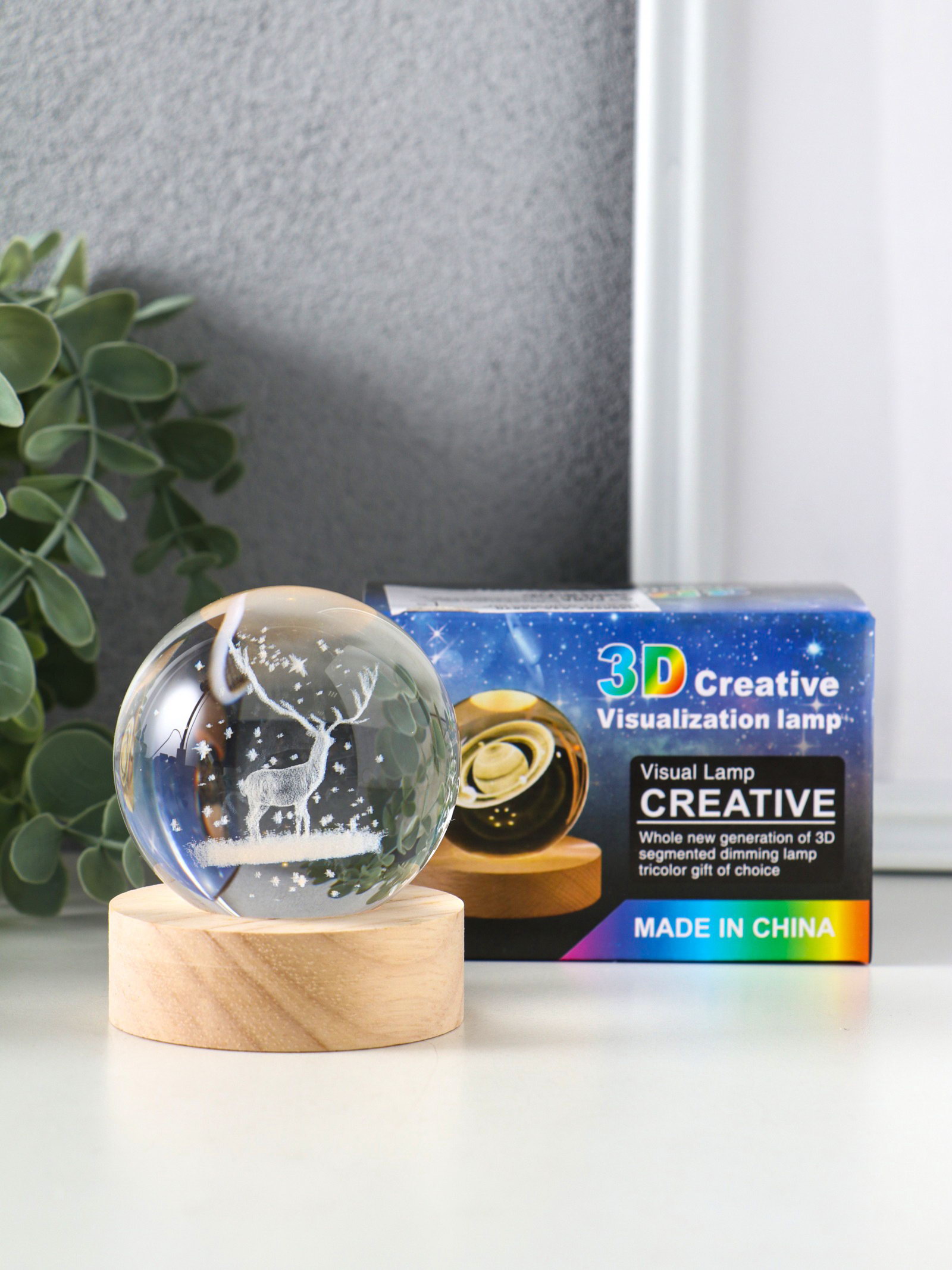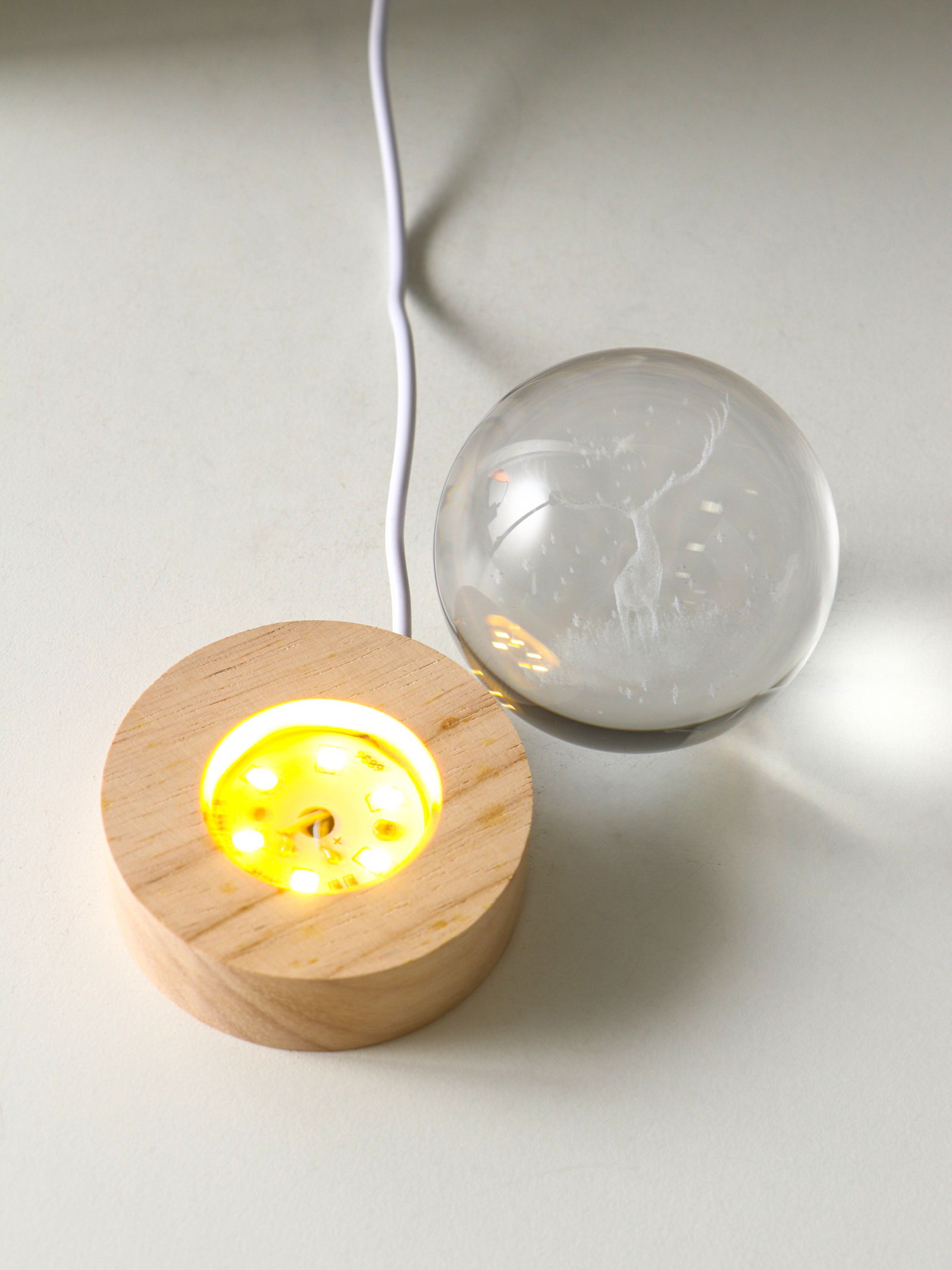 Световая фигурка стекло "Шар. Голограмма: Олень и птицы", d=6 см, подставка дерево, USB, 6.5x6.5x7.5 см, 6.5x6.5x7.5 см., Китай