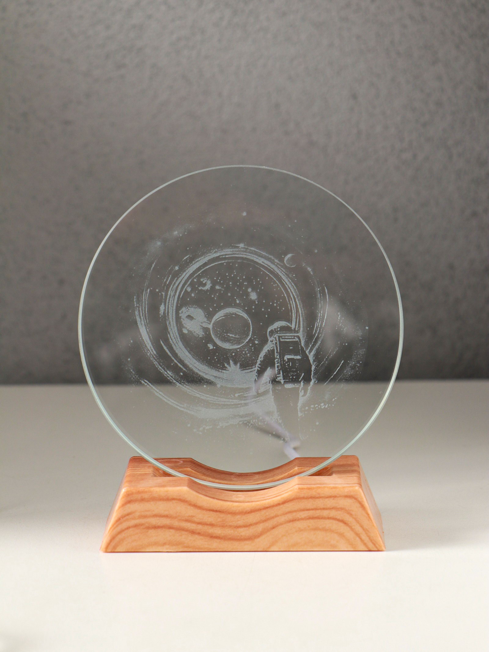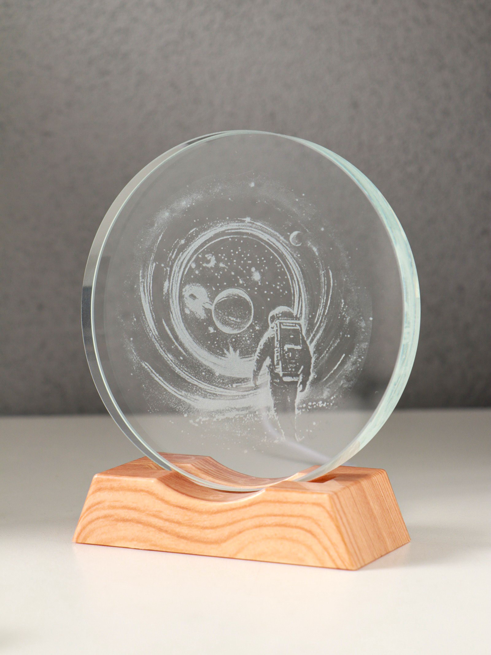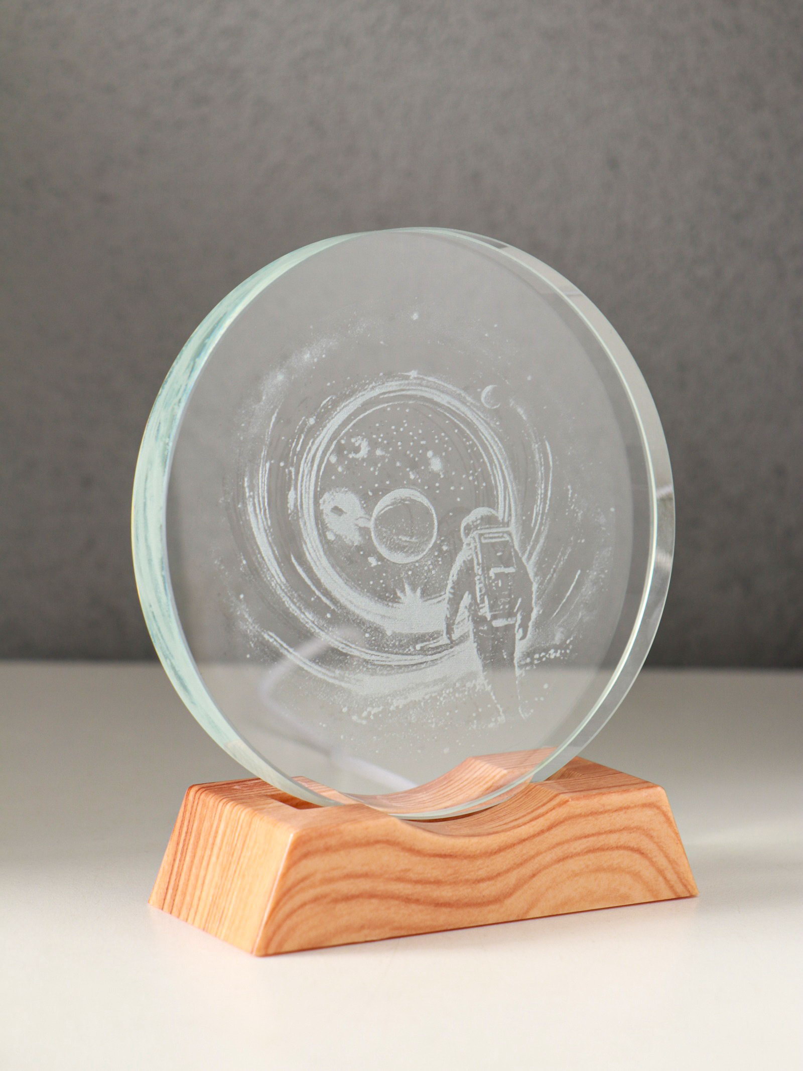 Световая фигурка стекло "Диск. Голограмма: Высадка космонавта на луну", 5xLED, d=10 см, USB, 10x4x11.4 см, 4x10x11.4 см., Китай