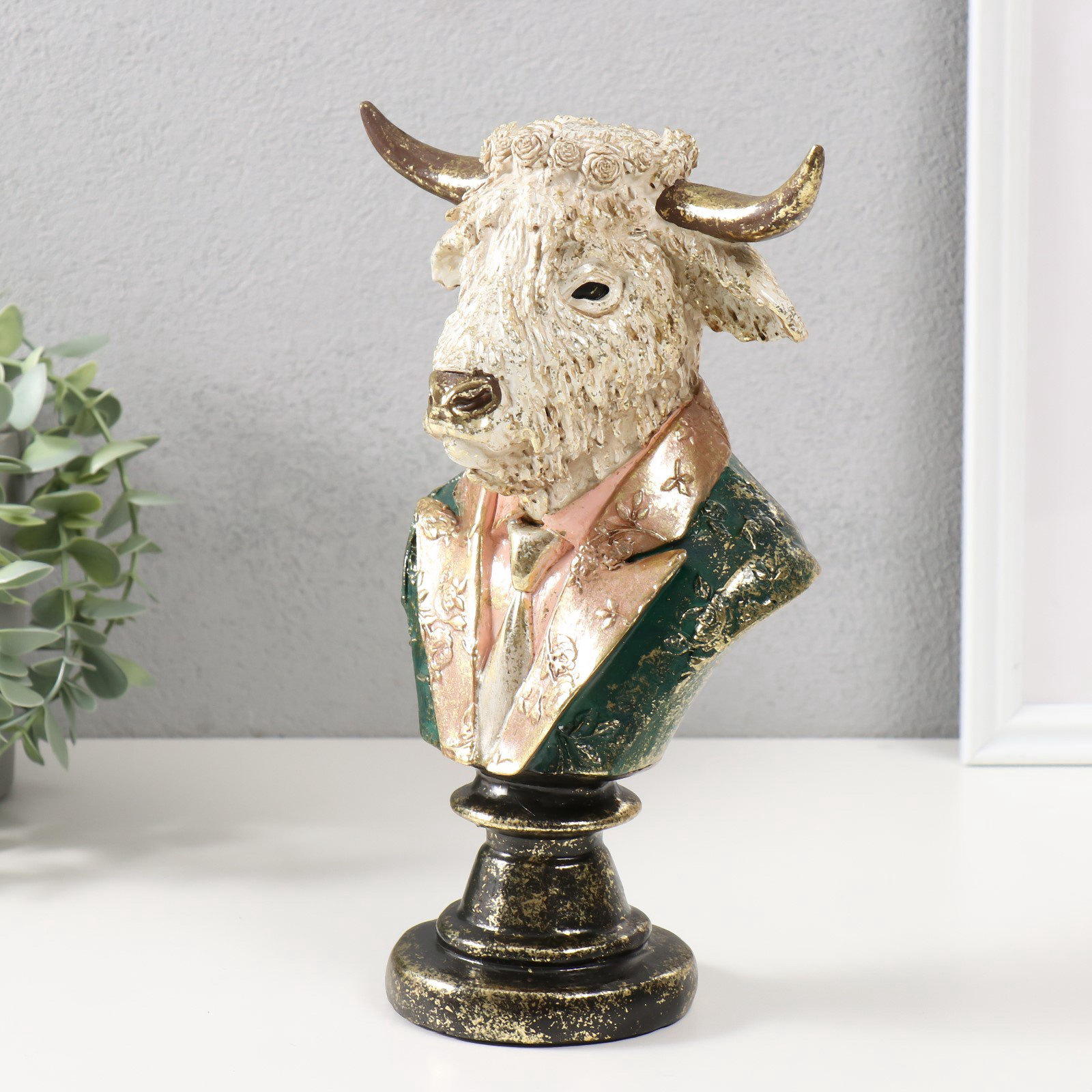 Тематика праздника: Профессиональные праздники, Универсальная тематика Размер упаковки: 16.5 x 22.5 x 30.5 см. Цвет: Разноцветный Высота, см: 25 Одноцветный: Нет Форма фигуры: Корова, бык Тематика: Животный мир Символ года: Нет Покрытие: Краска Персонажи: Корова, бык Набор: Нет tnved: 3926400000 tnved: 3926400000 Этот бюст белого бизона в деловом костюме выразительный арт-объект для кабинета или оригинальный подарок для ценителя нестандартного дизайна. Фигура сочетает мощную природную символику с ироничной деталью элегантным пиджаком и галстуком. Изделие выполнено из полистоуна, материала, передающего тонкую проработку фактуры шерсти и ткани. Особенности