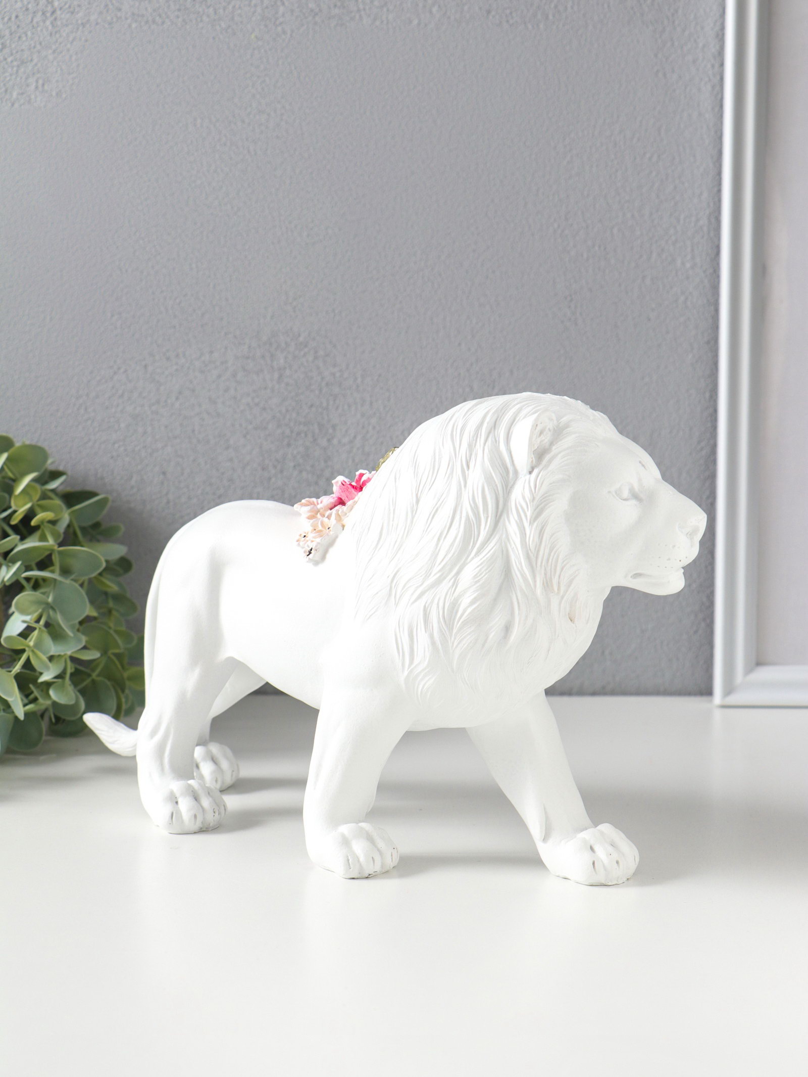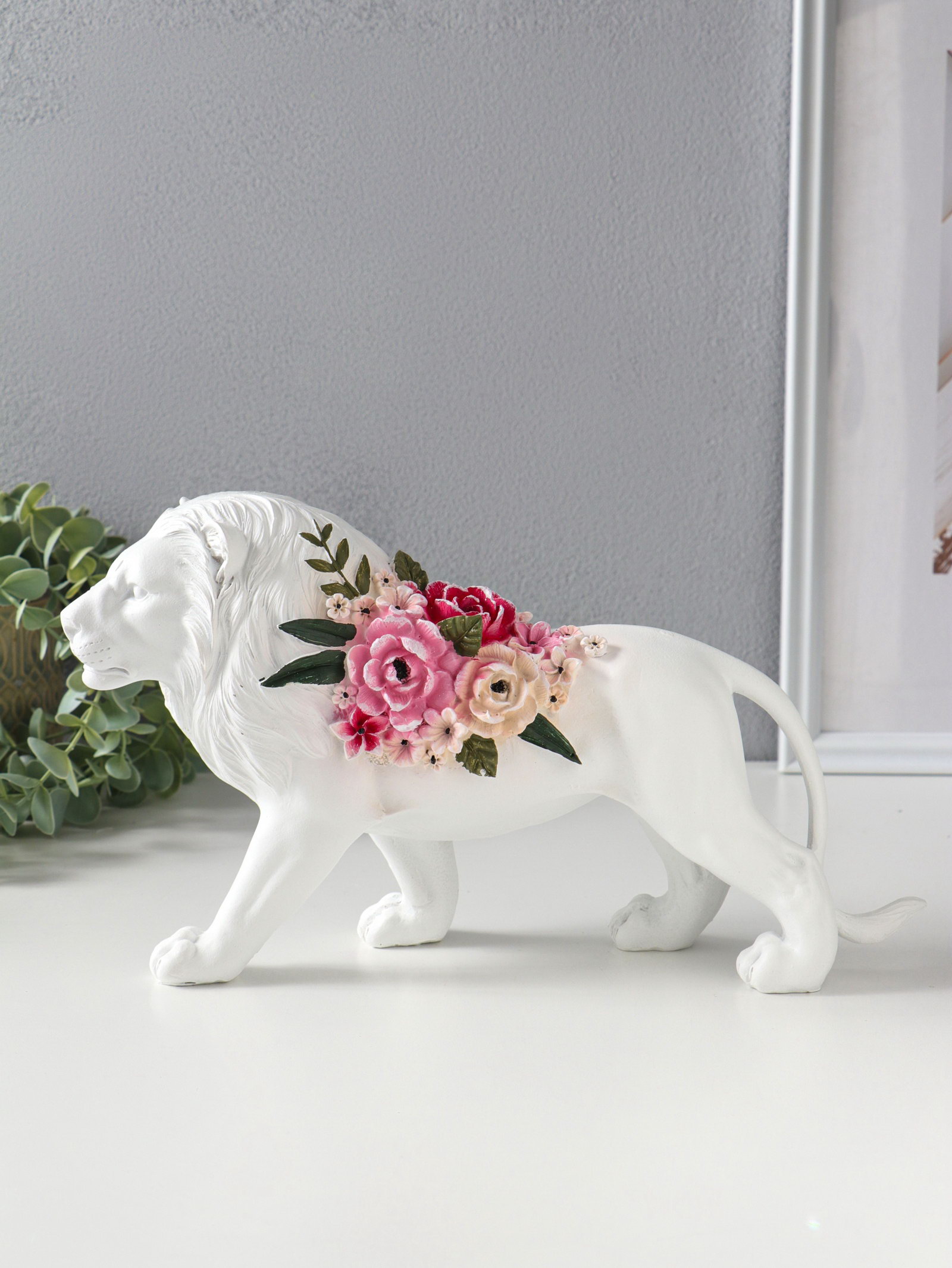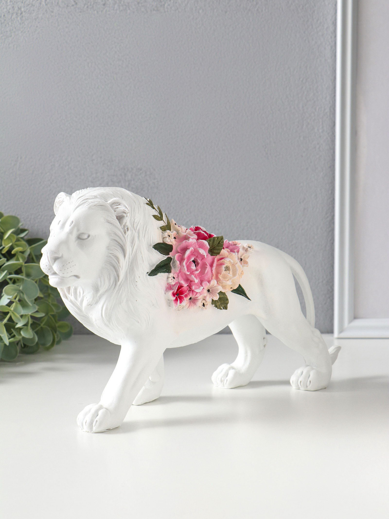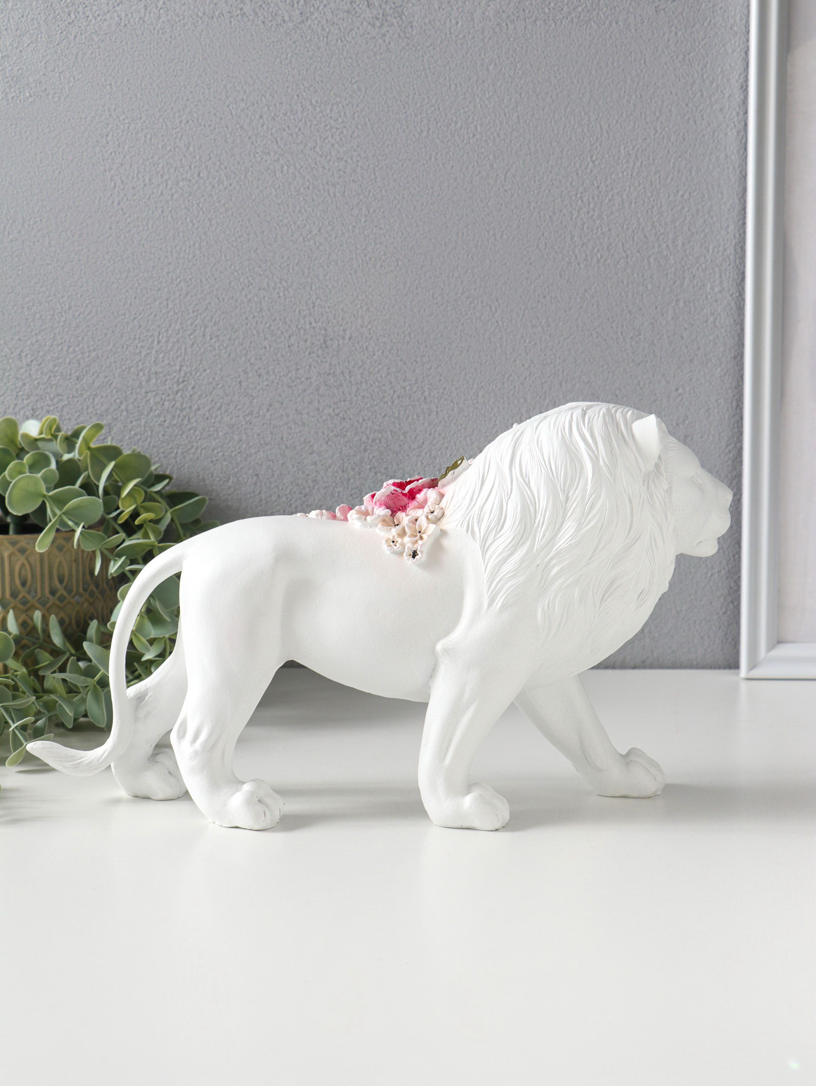 Сувенир полистоун "Белый лев в розовых цветах" 30х8.5х17 см, 8.5x30x17 см., Китай