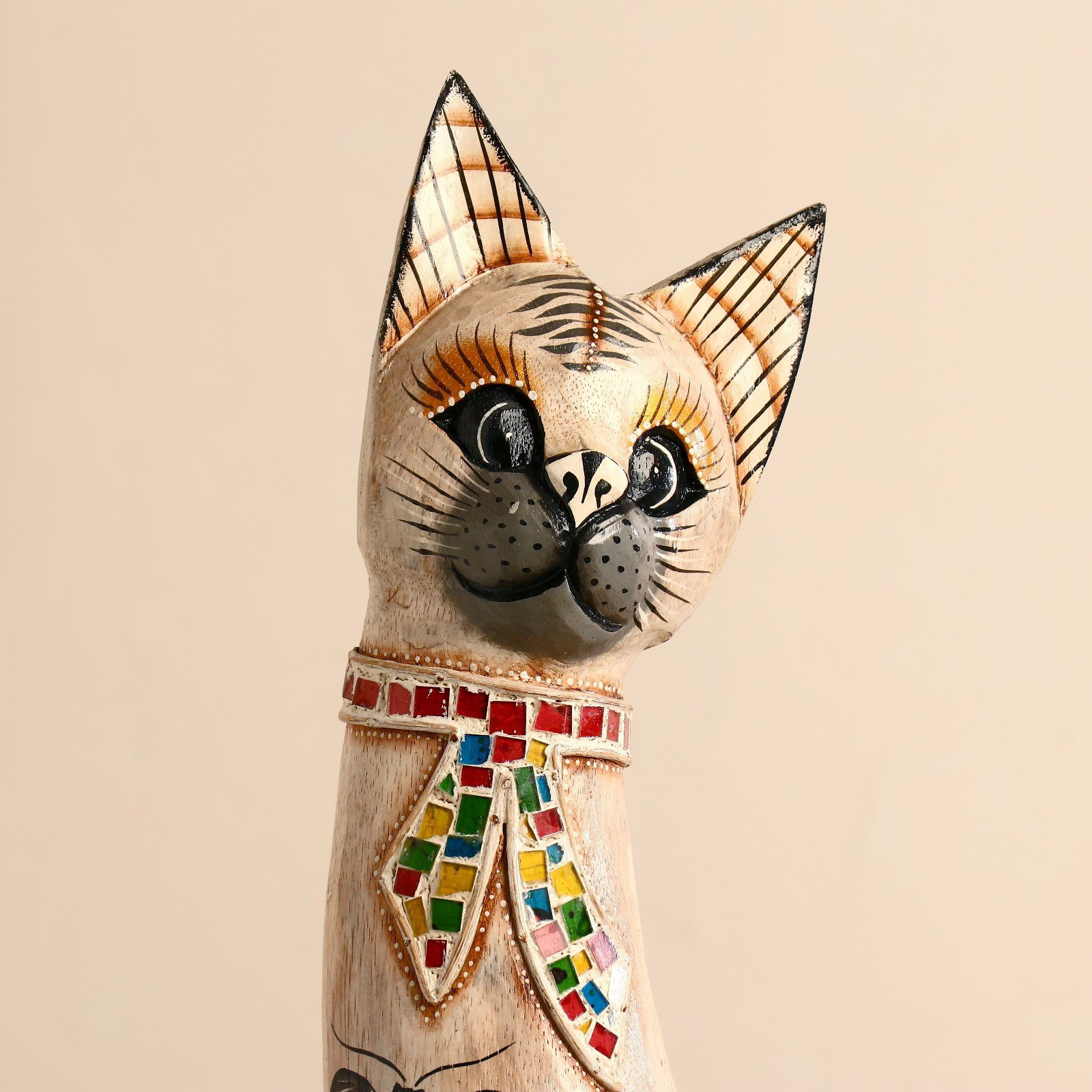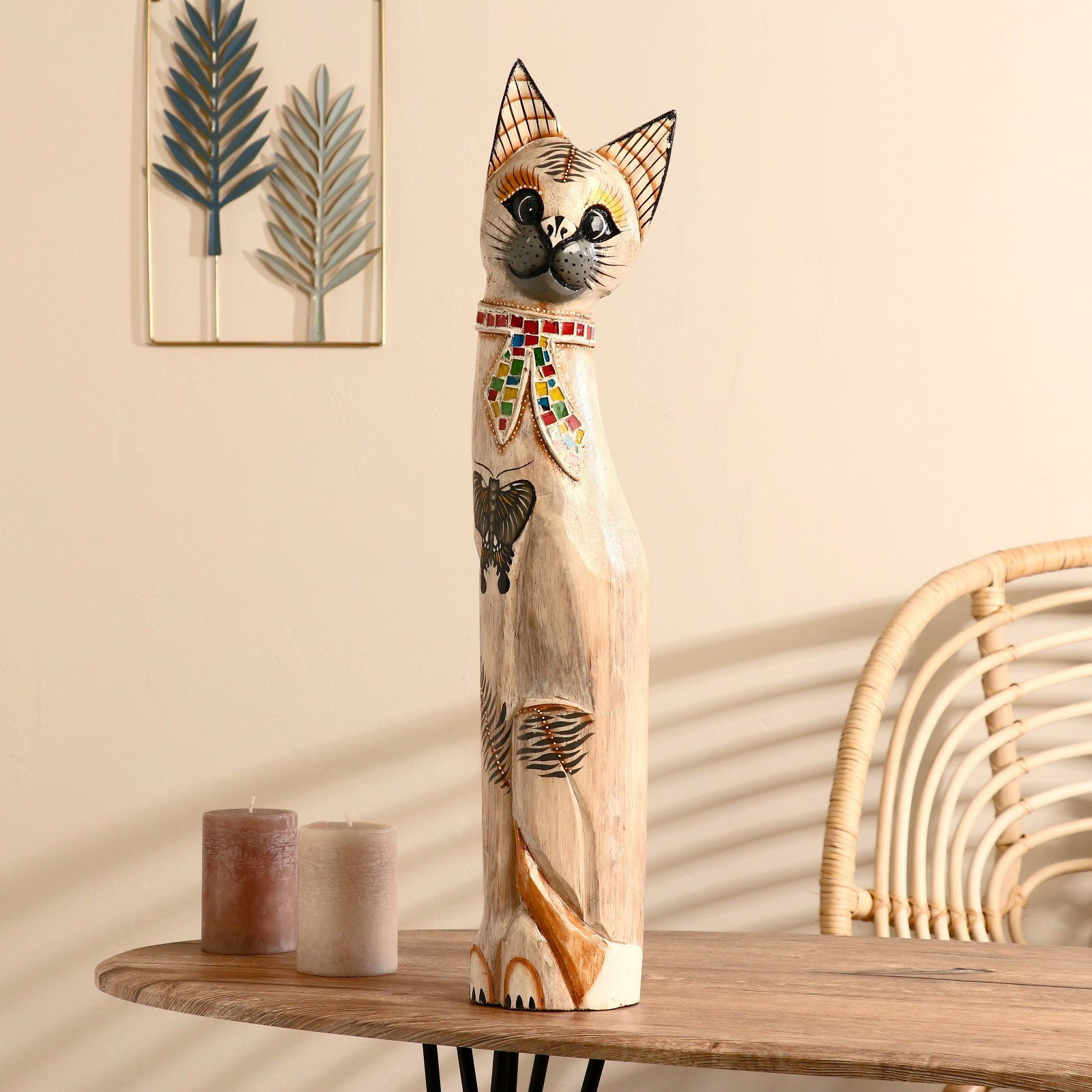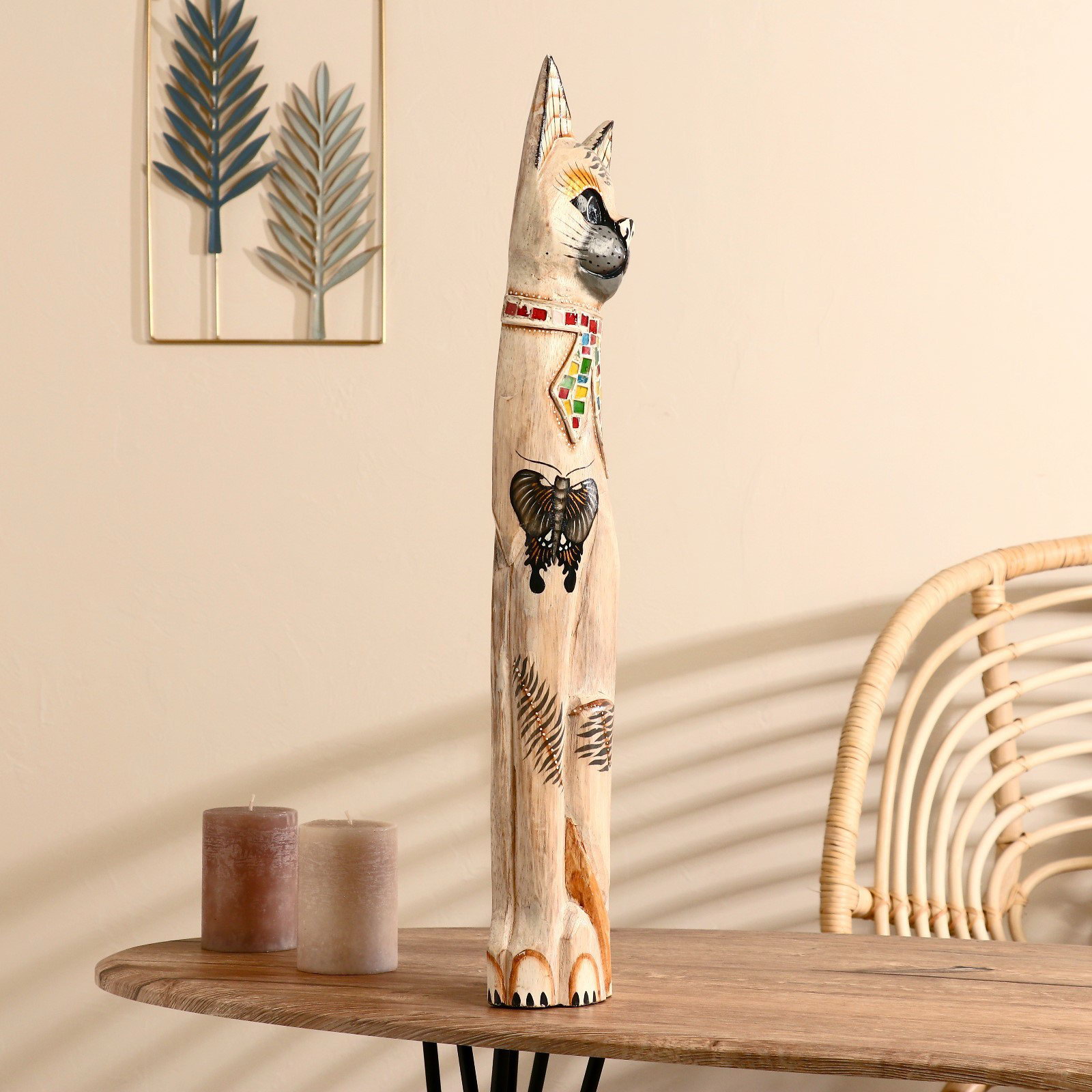 Сувенир дерево "Кошка с бабочкой и бантом из мозаики" белая 60х12х6 см, 12x6x60 см., Индонезия