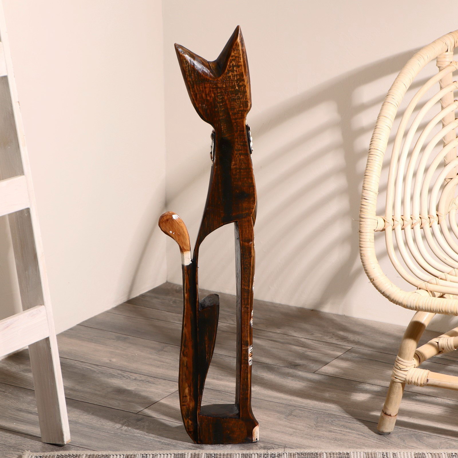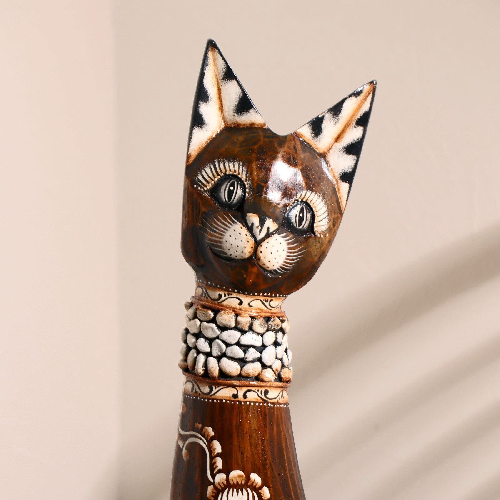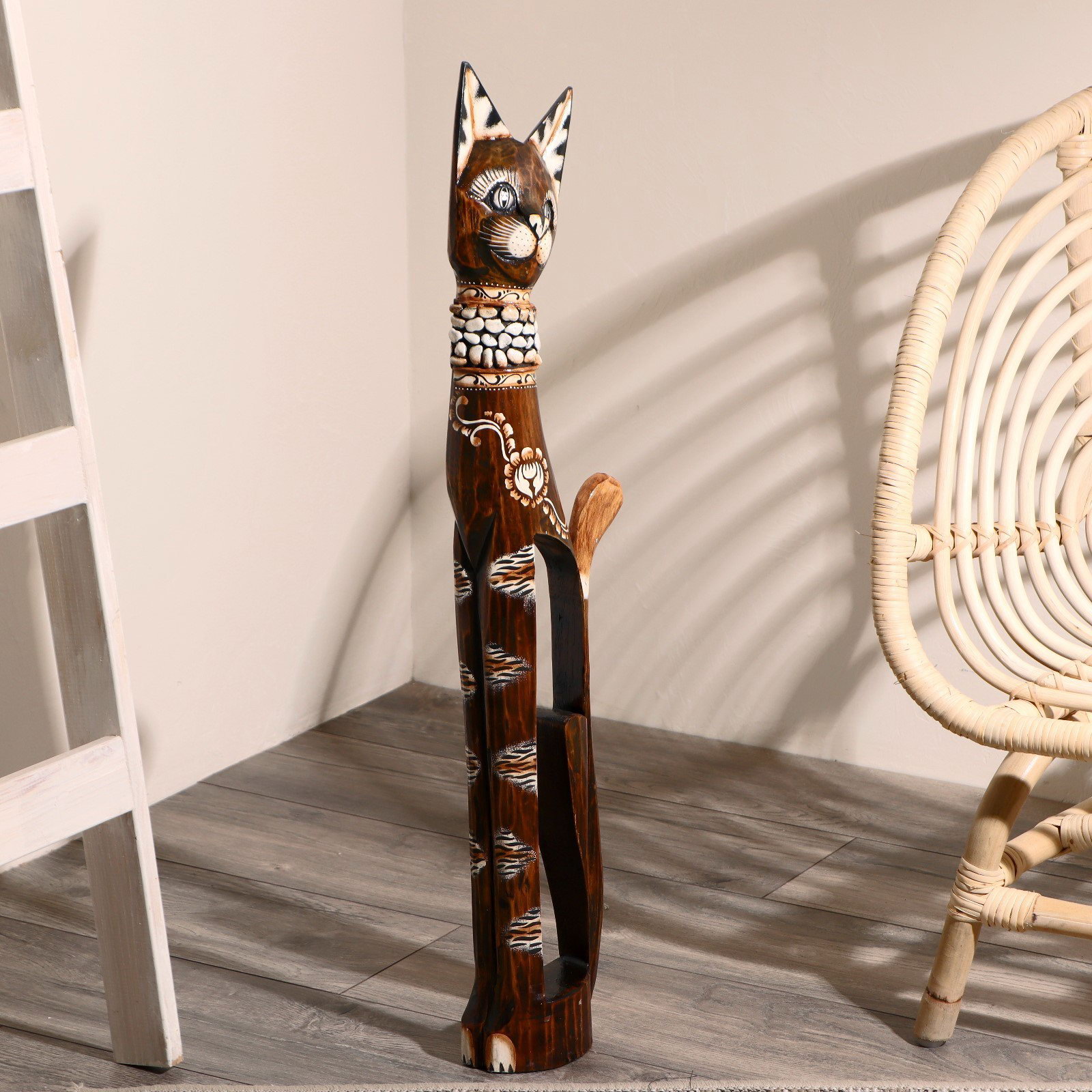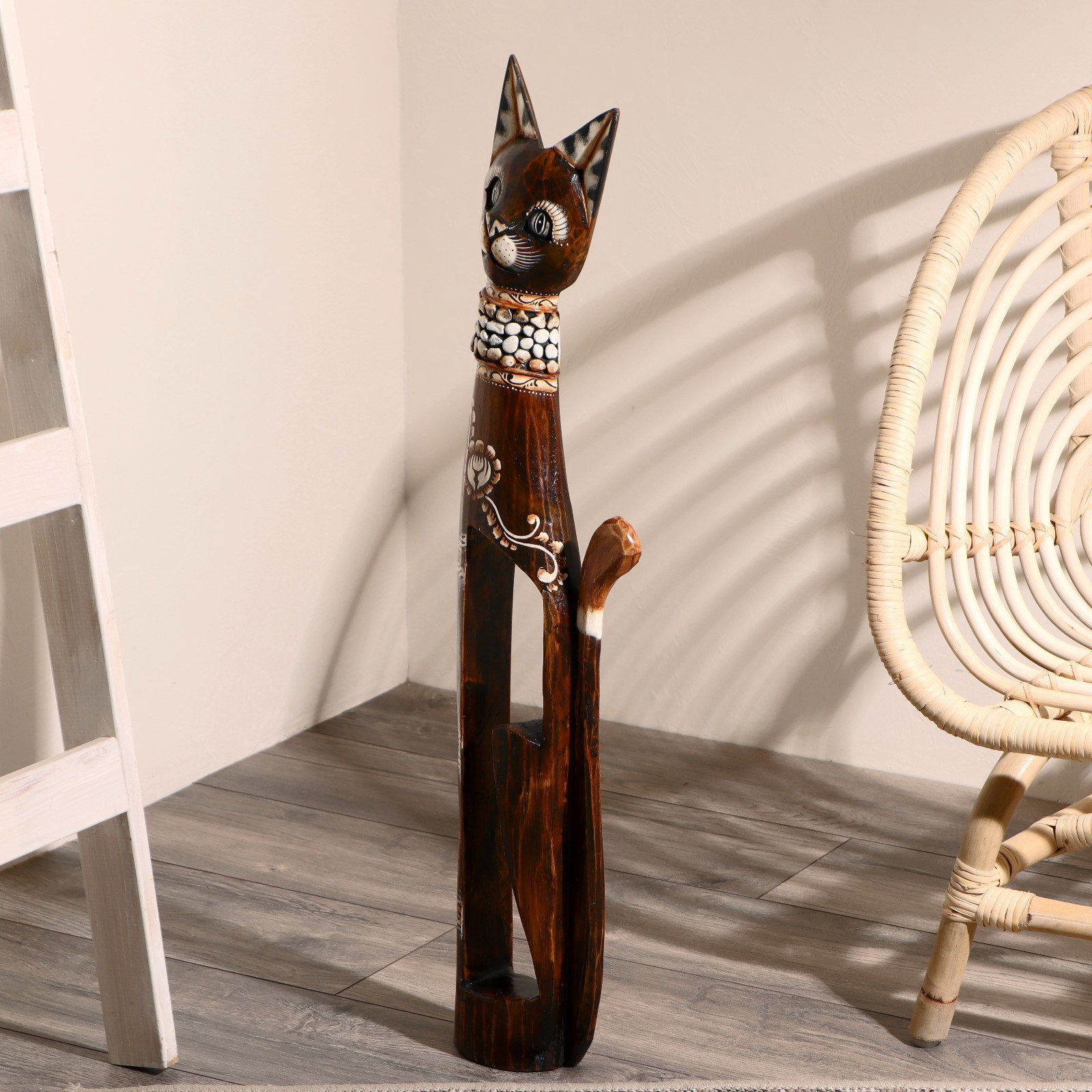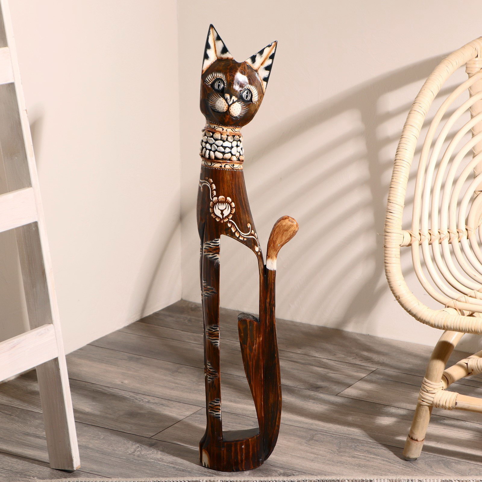 Сувенир "Кошка в ошейнике из камней и с расписным цветком", 80x13x7 см, дерево, 13x7x80 см., Индонезия