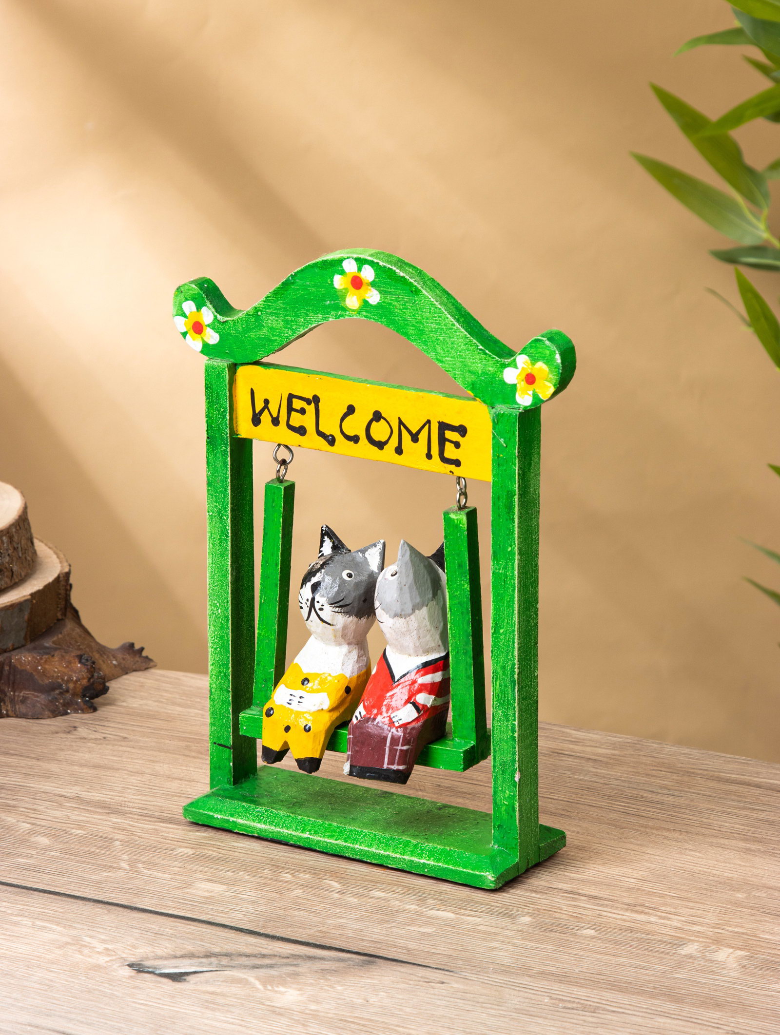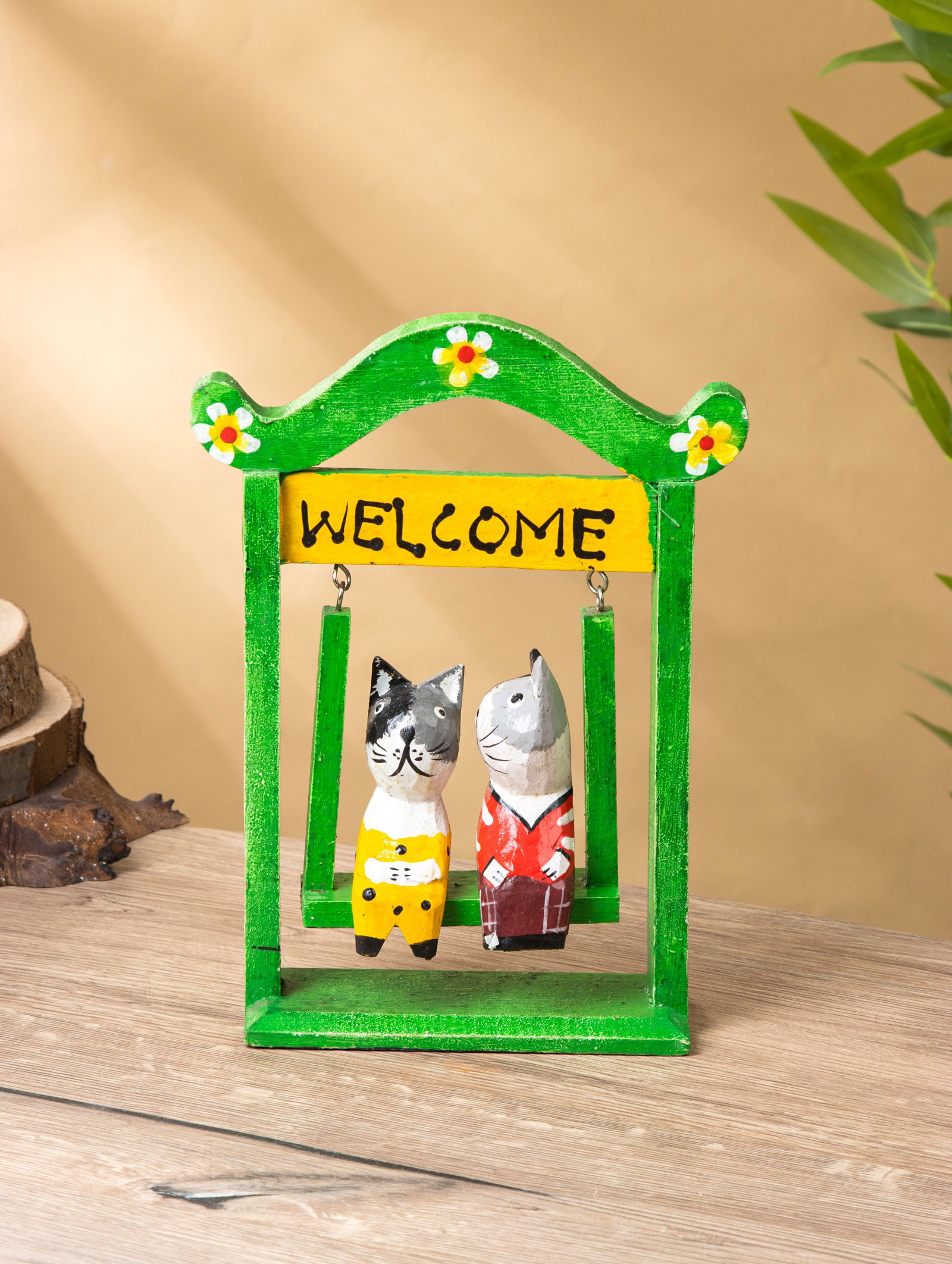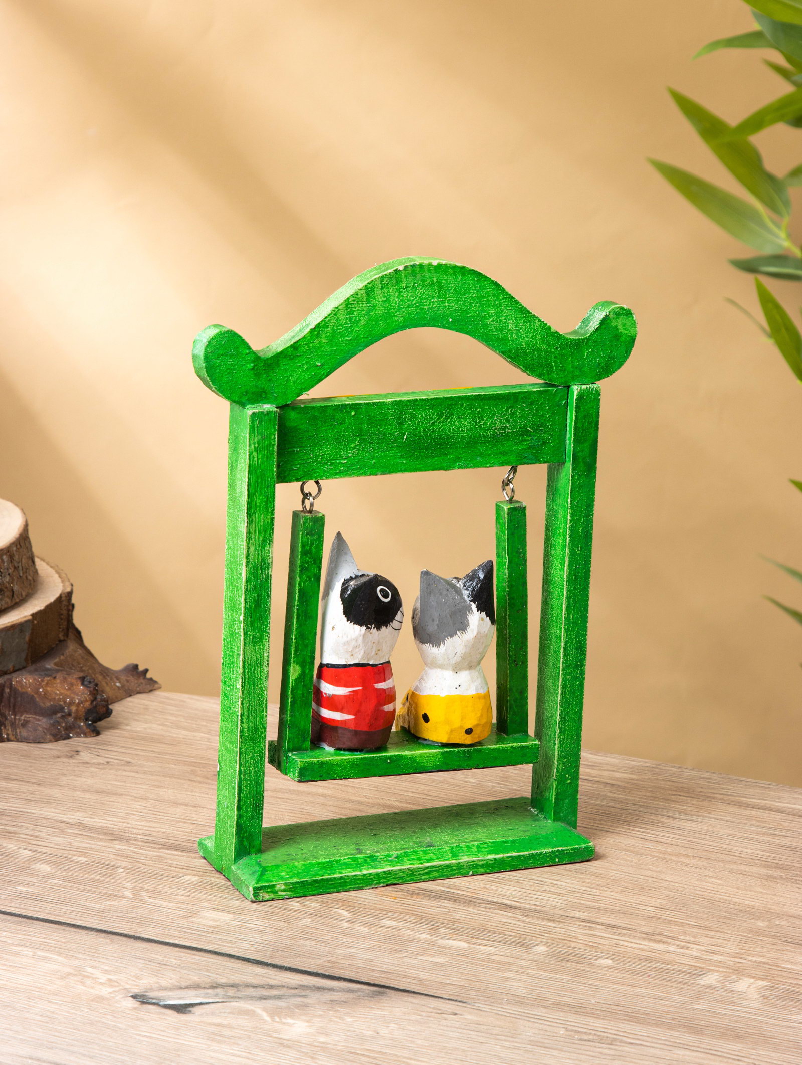 Сувенир интерьерный "Кошечки на качелях", 15x7x25 см, дерево, зелёный, 7x15x25 см., Индонезия