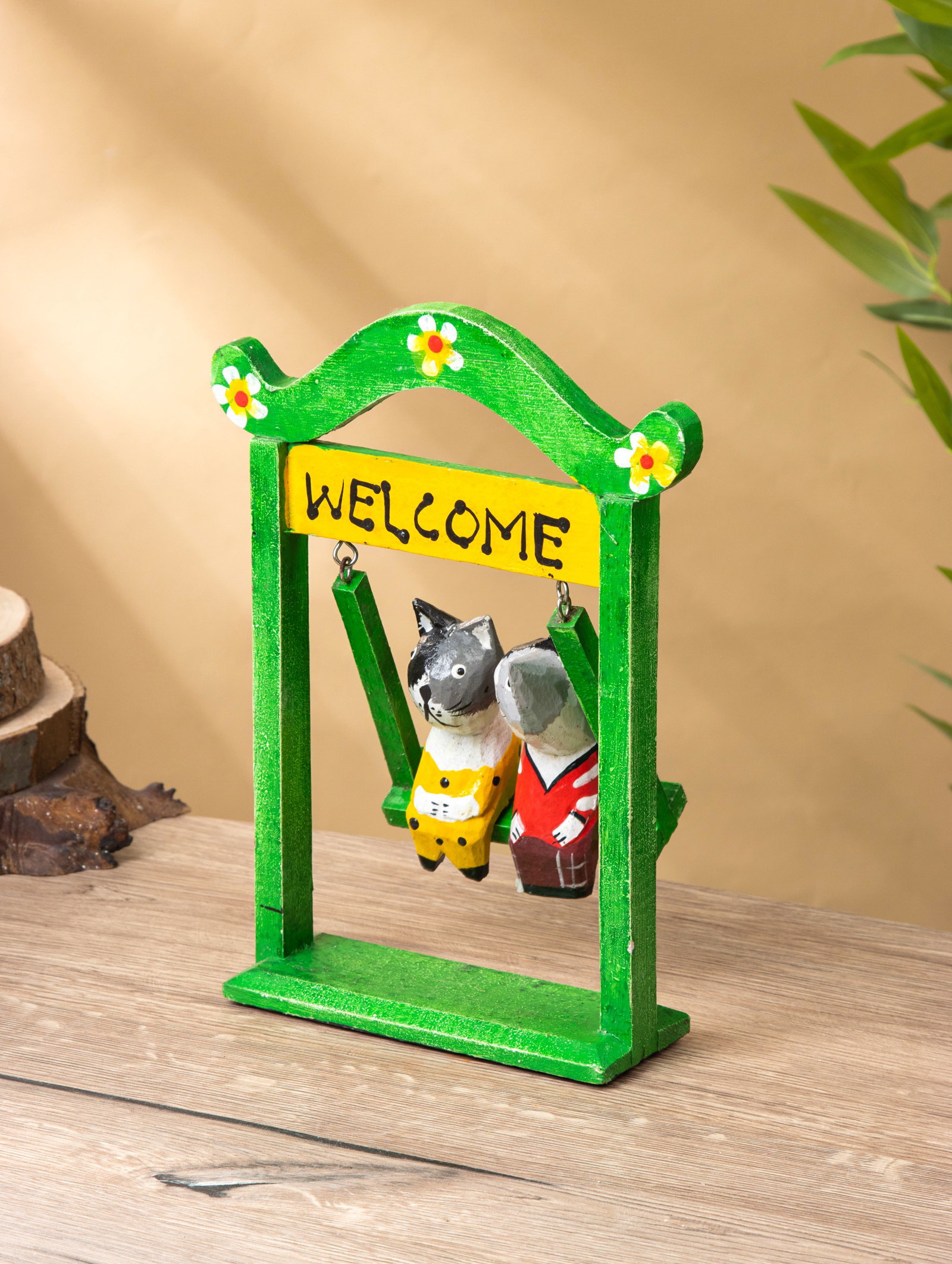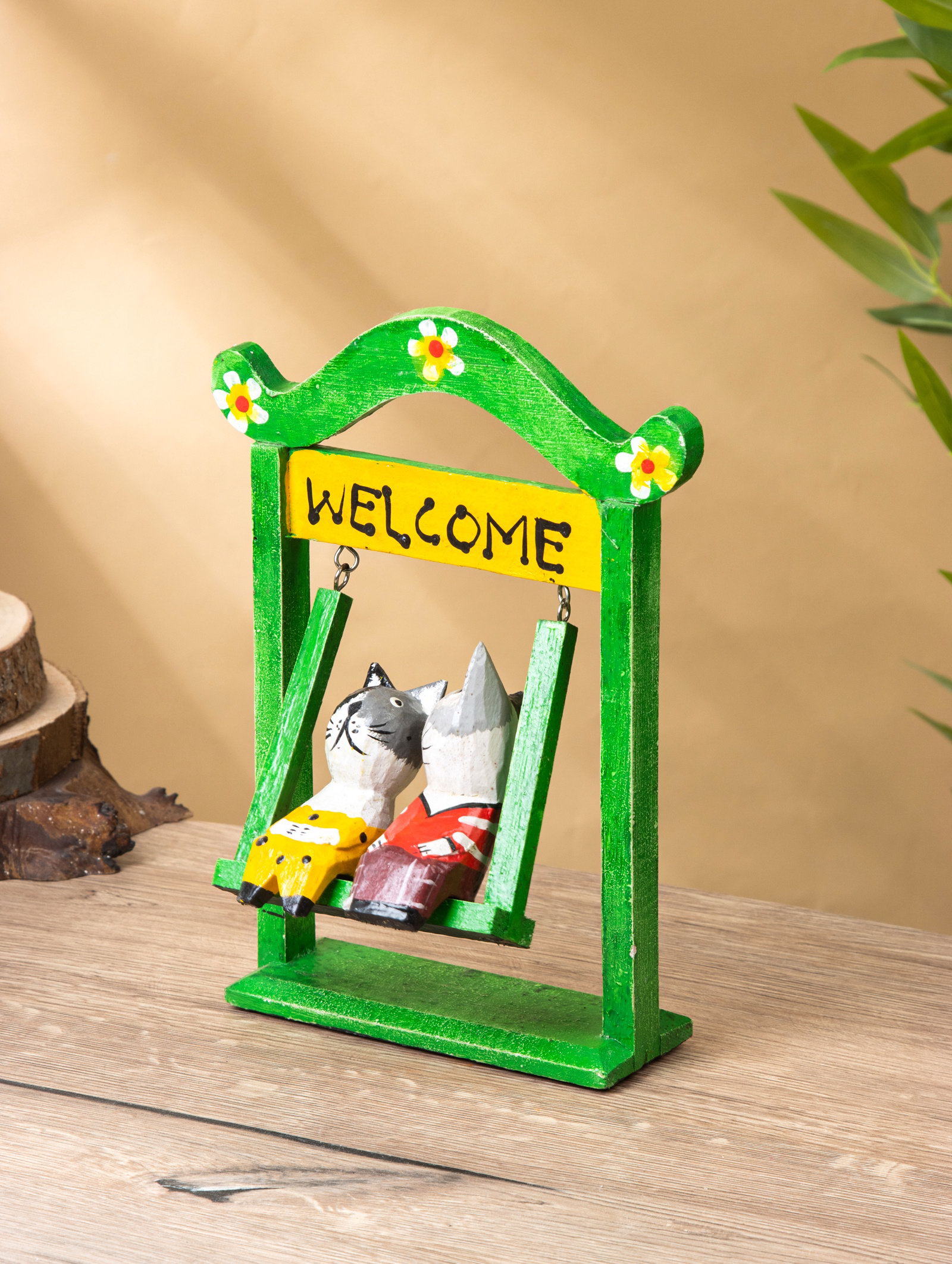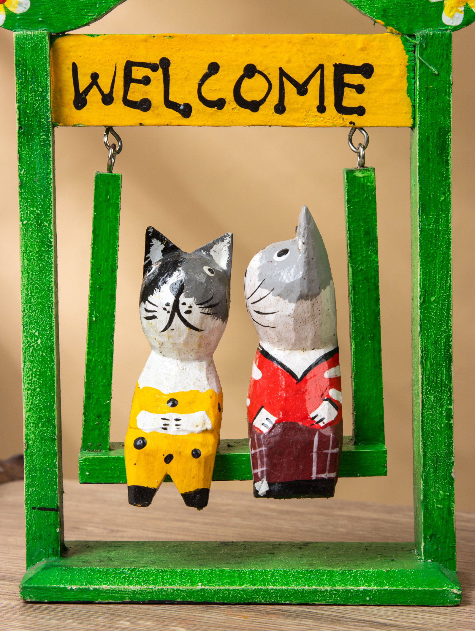 Сувенир интерьерный "Кошечки на качелях", 15x7x25 см, дерево, зелёный, 7x15x25 см., Индонезия