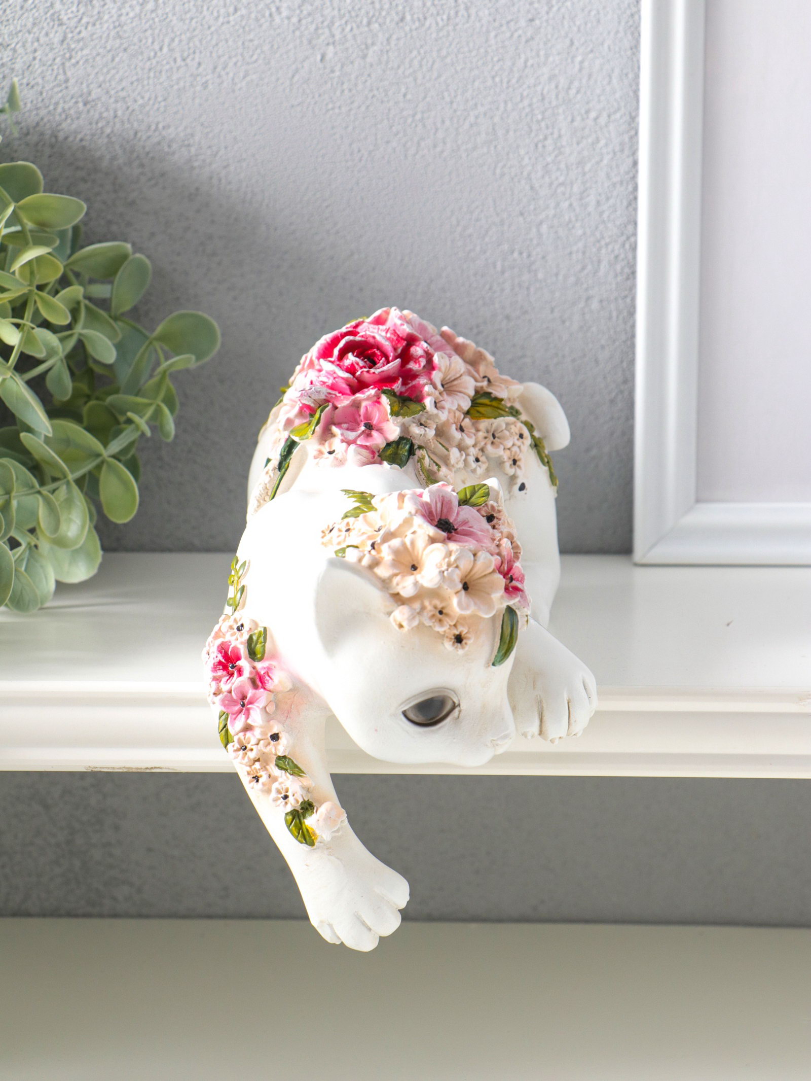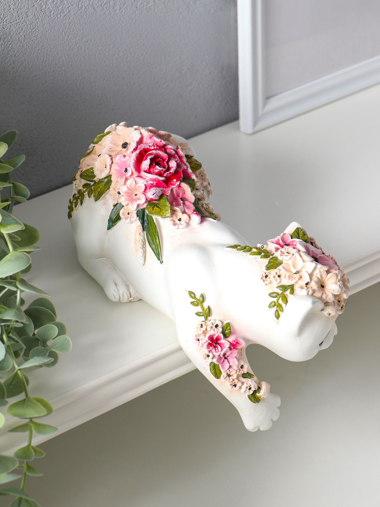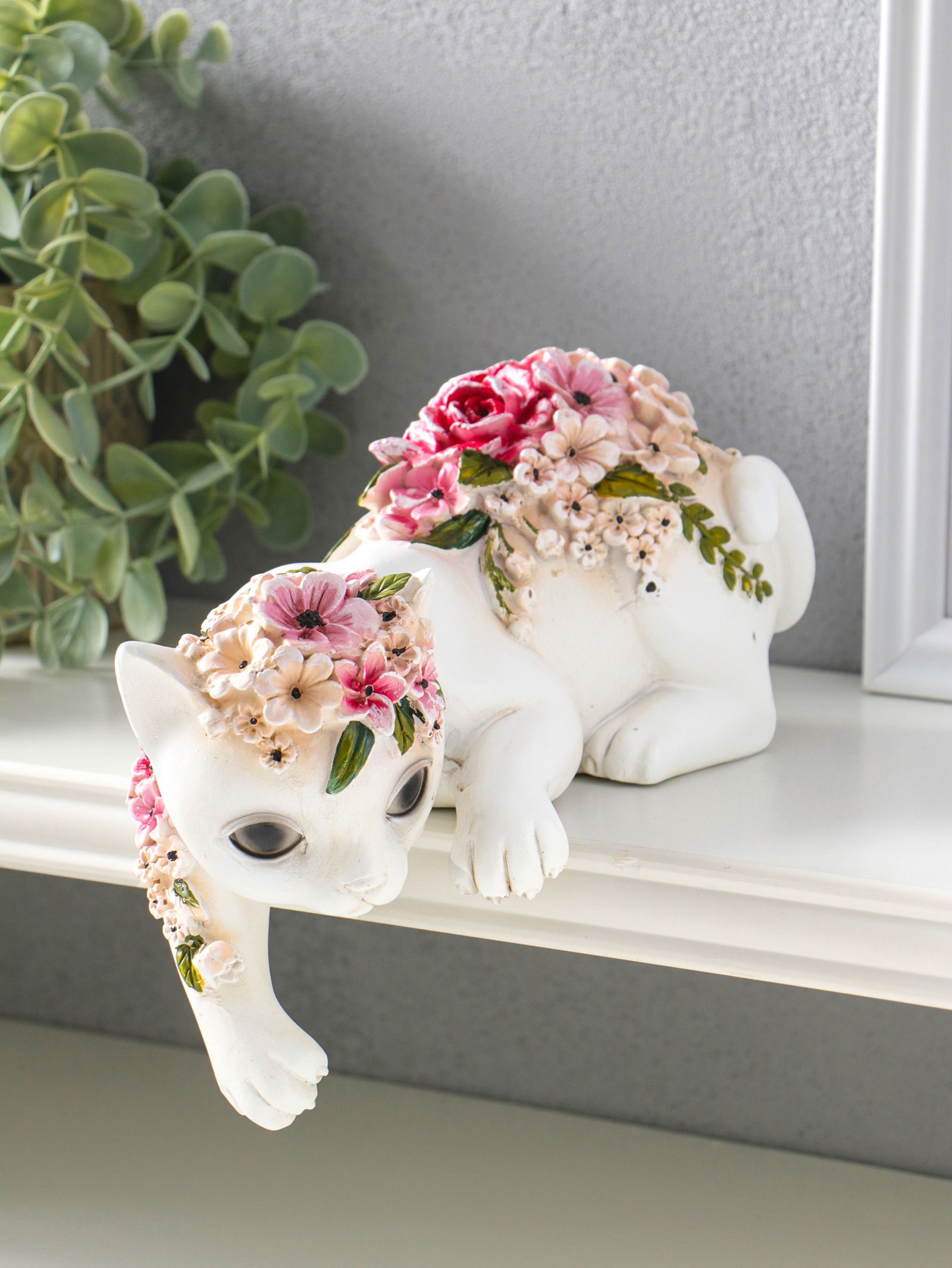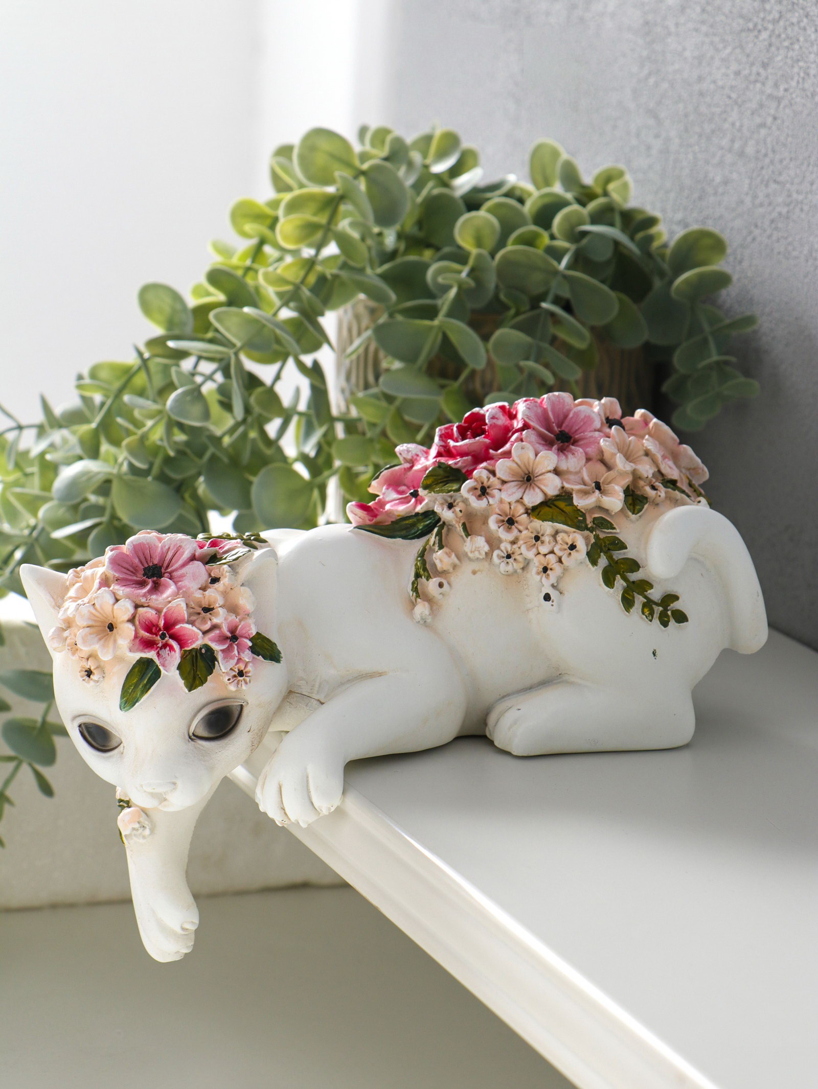 Сувенир полистоун "Белая кошка в цветах" на полку 21х10.5х12.8 см, 10.5x21.3x15.8 см., Китай