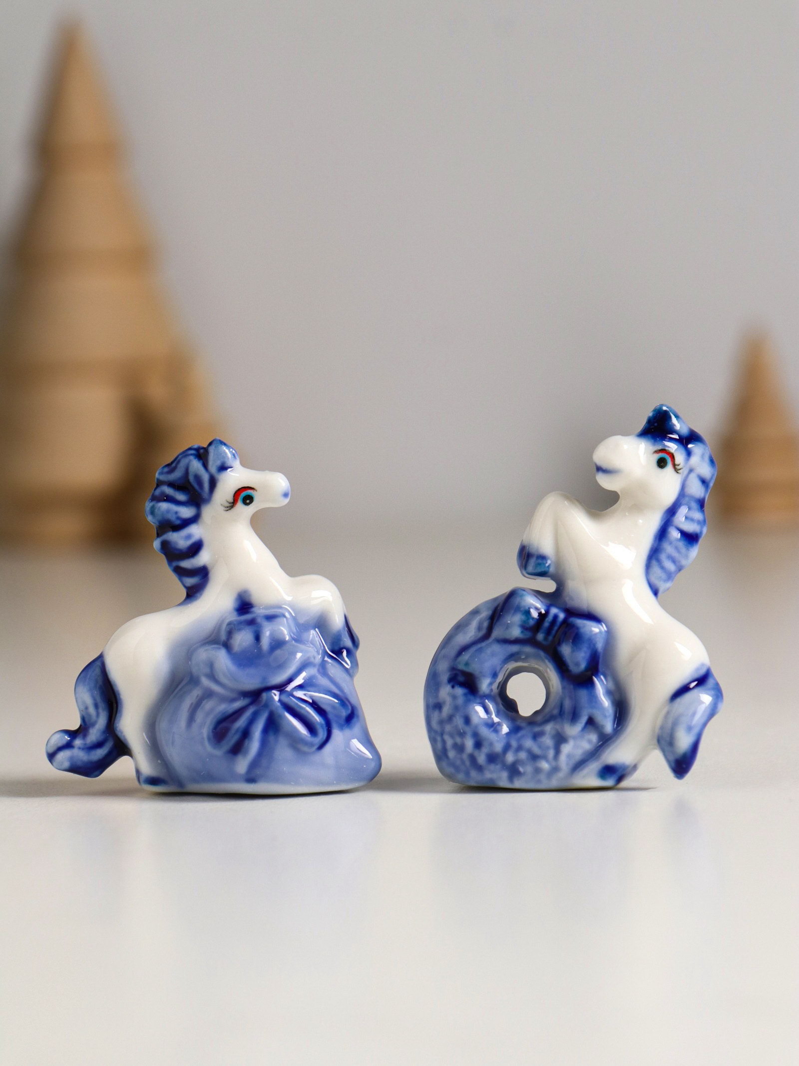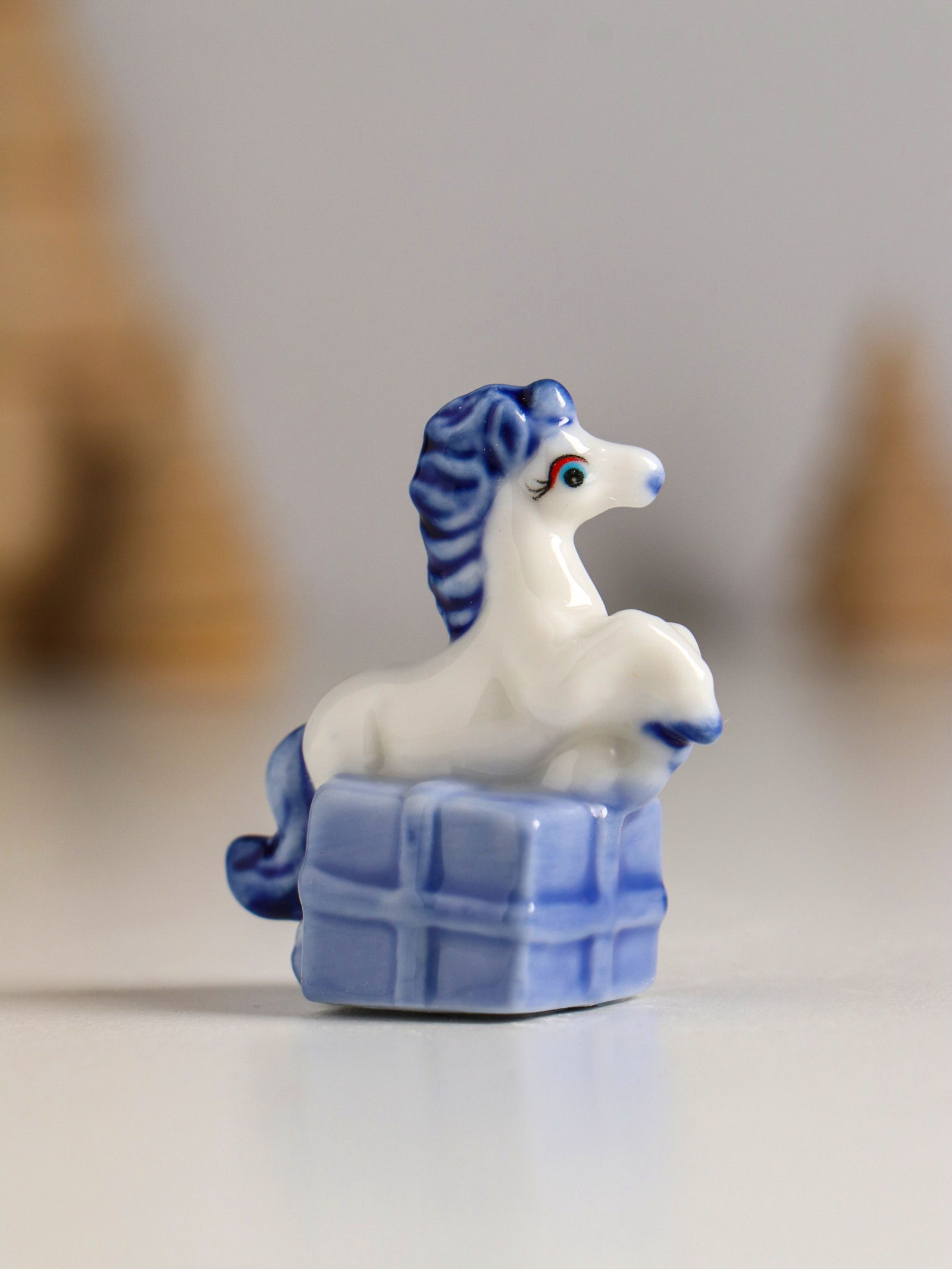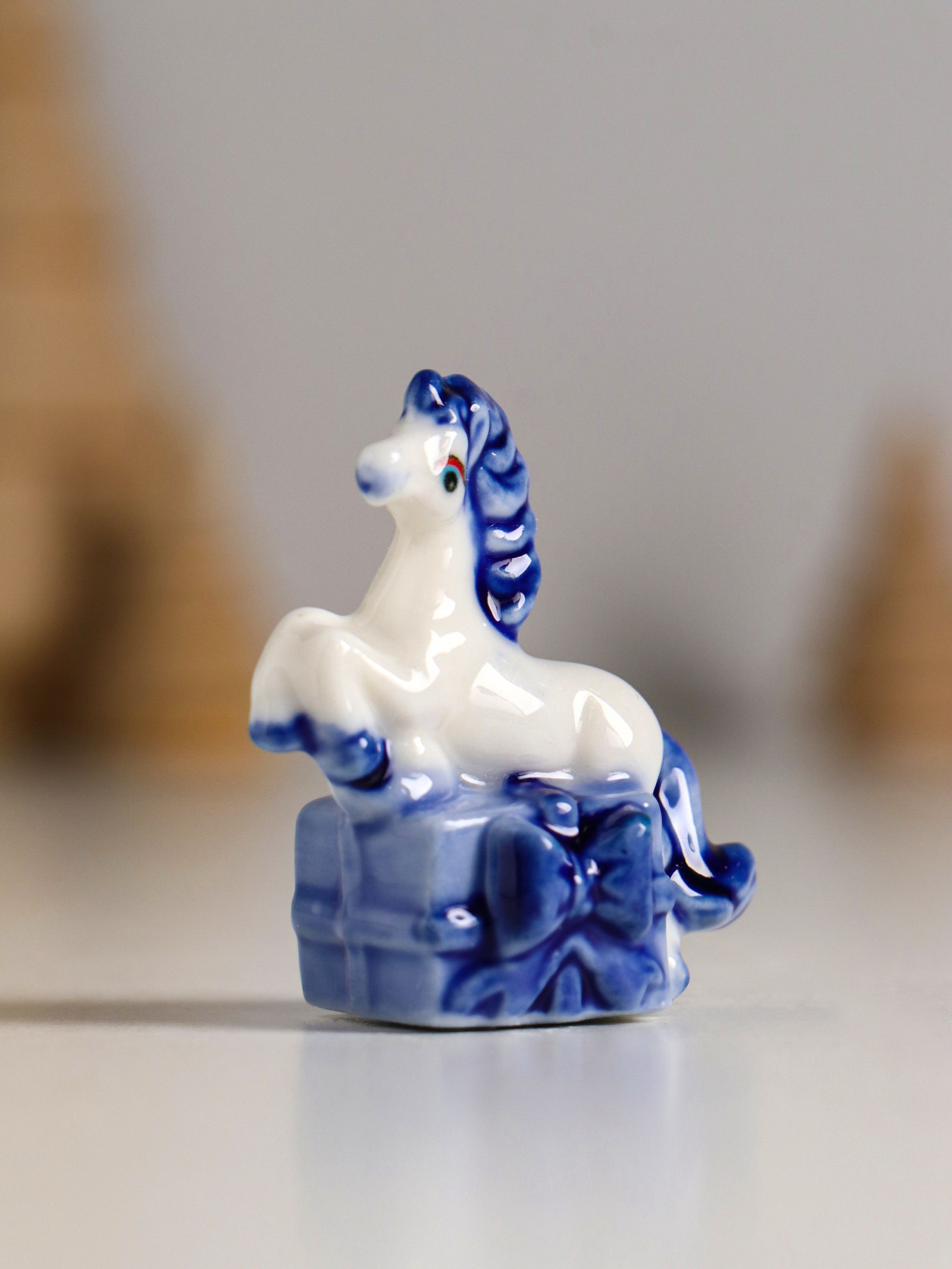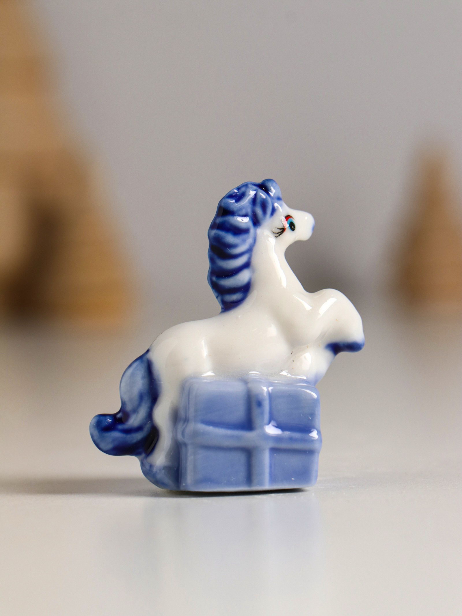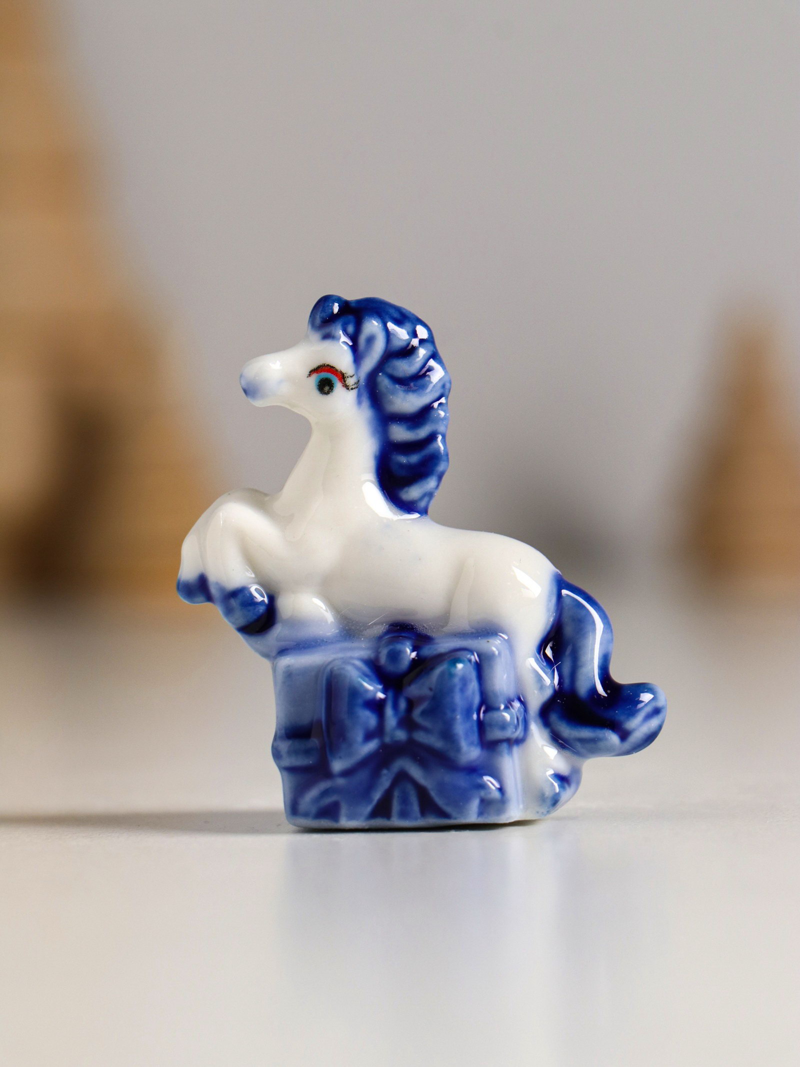 Фигурка керамика "Лошадка с подарком", бело-синий, 4.1x2.6x4 см, МИКС, 2.6x4.1x4 см., Китай