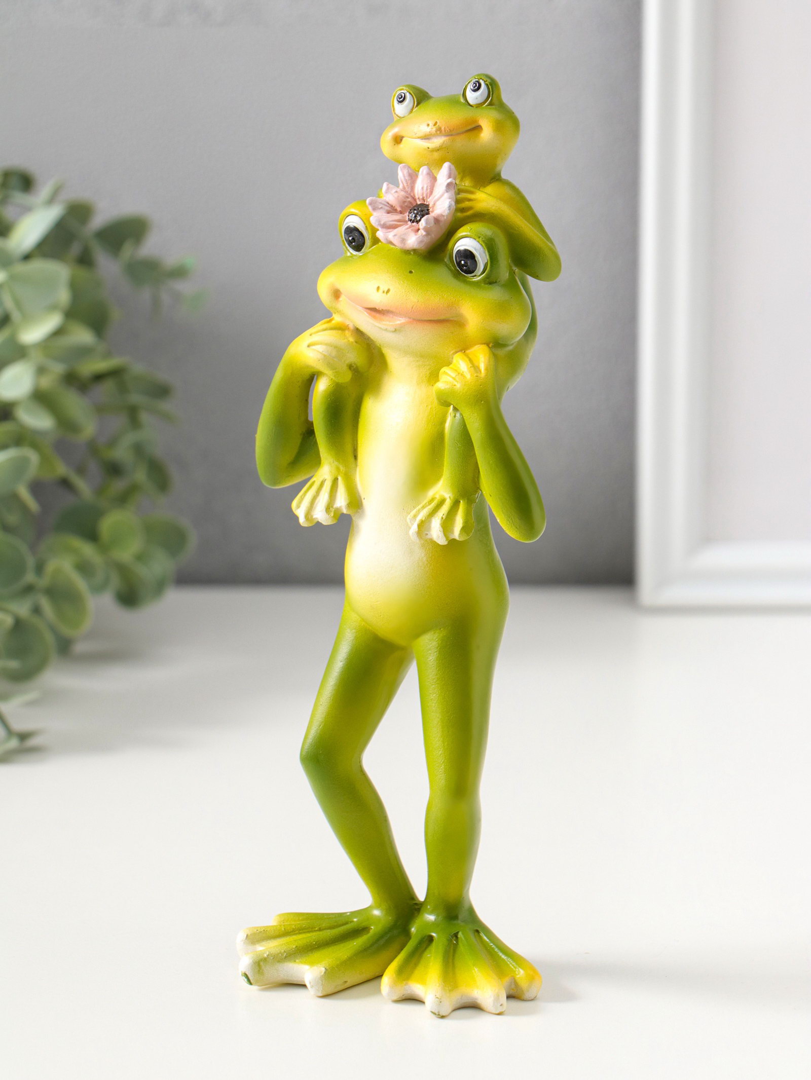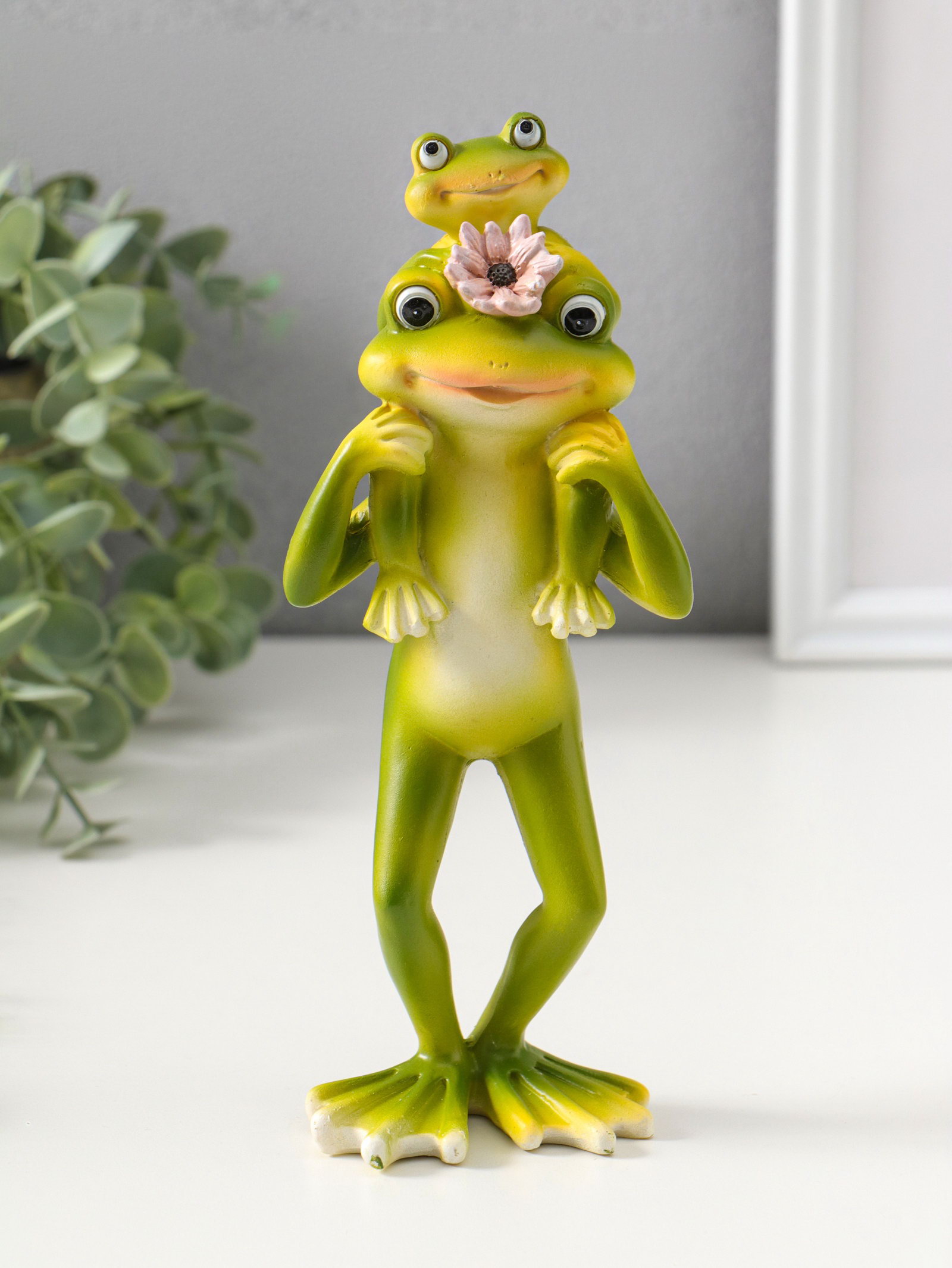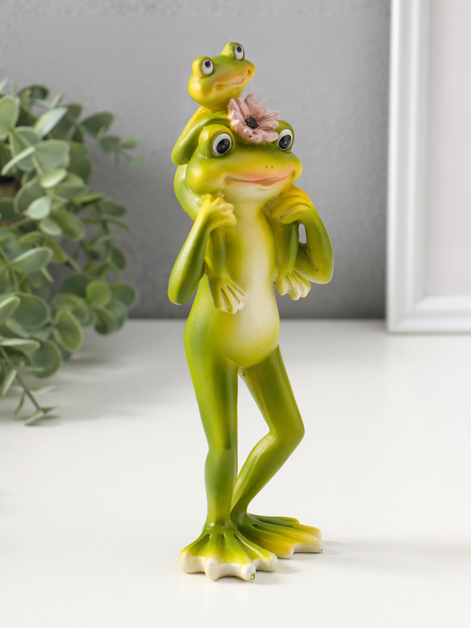 Фигура полистоун "Лягушонок с розовым лотосом, посадил малыша на шею", 21.5 см, 7x8.5x21.5 см., Китай