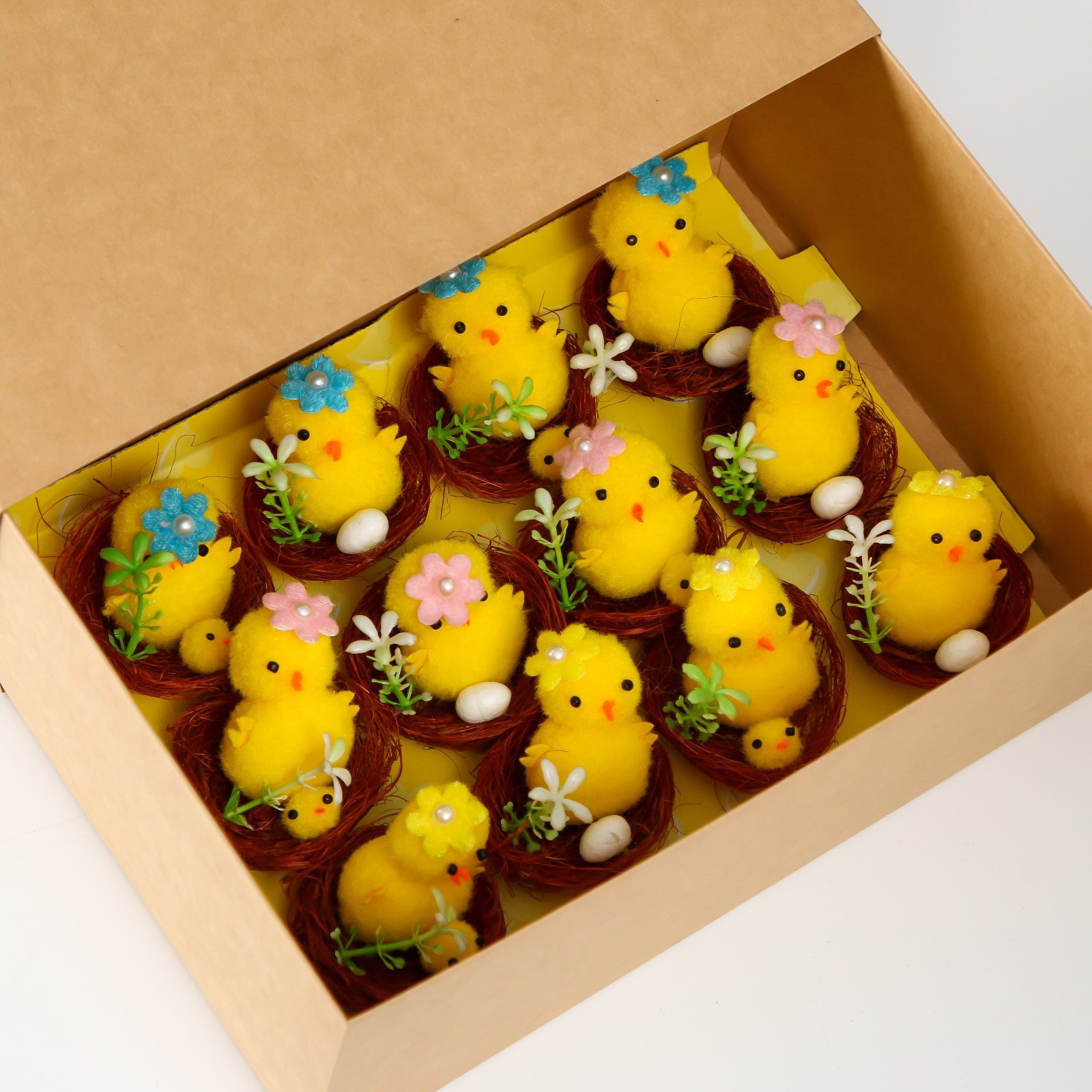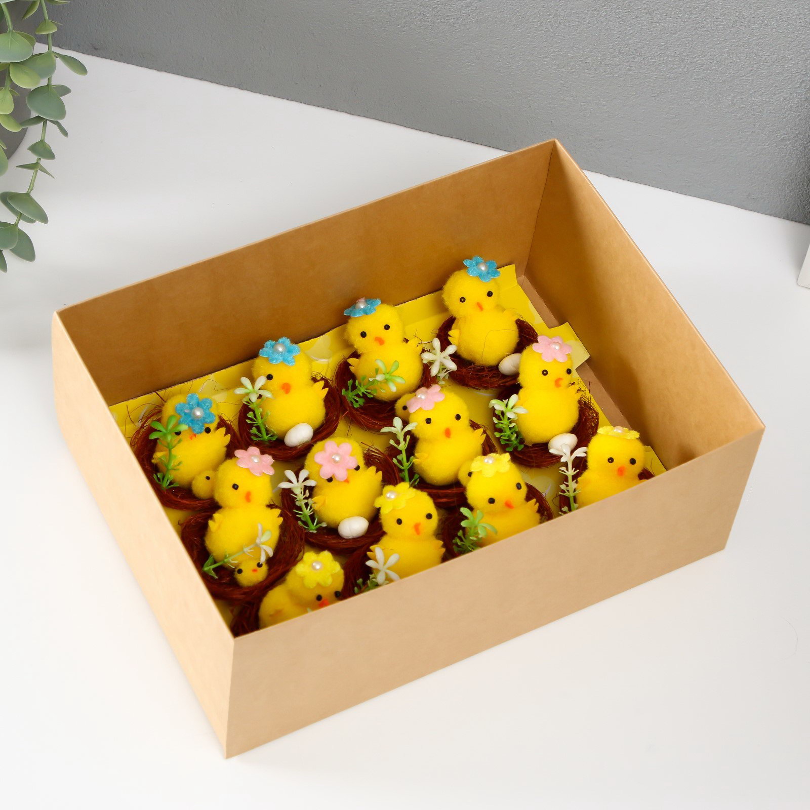 Тематика праздника: Пасха, Универсальная тематика Размер упаковки: 25.5 x 6 x 17.5 см. Высота, см: 5 Цвет: Жёлтый Одноцветный: Нет Форма фигуры: Цыплёнок Набор: Да tnved: 9505900000 tnved: 9505900000 Превратите пасхальные праздники в уютное торжество с очаровательными фигурками цыплят в гнёздах. Этот набор из 12 миниатюрных композиций создаст атмосферу весеннего тепла и пробуждающейся природы в вашем доме. Каждый элемент продуман до мелочей от пушистых цыплят до искусно выполненных цветочков в гнёздах из сизали. Компактные размеры (5x5x5 см) позволяют расставить фигурки на праздничном столе, подоконнике или создать из них целую пасхальную композицию. Сочетание материалов пластика, пенопласта и натурального сизаля делает каждую фигурку лёгкой, но при этом устойчивой и приятной на ощупь.