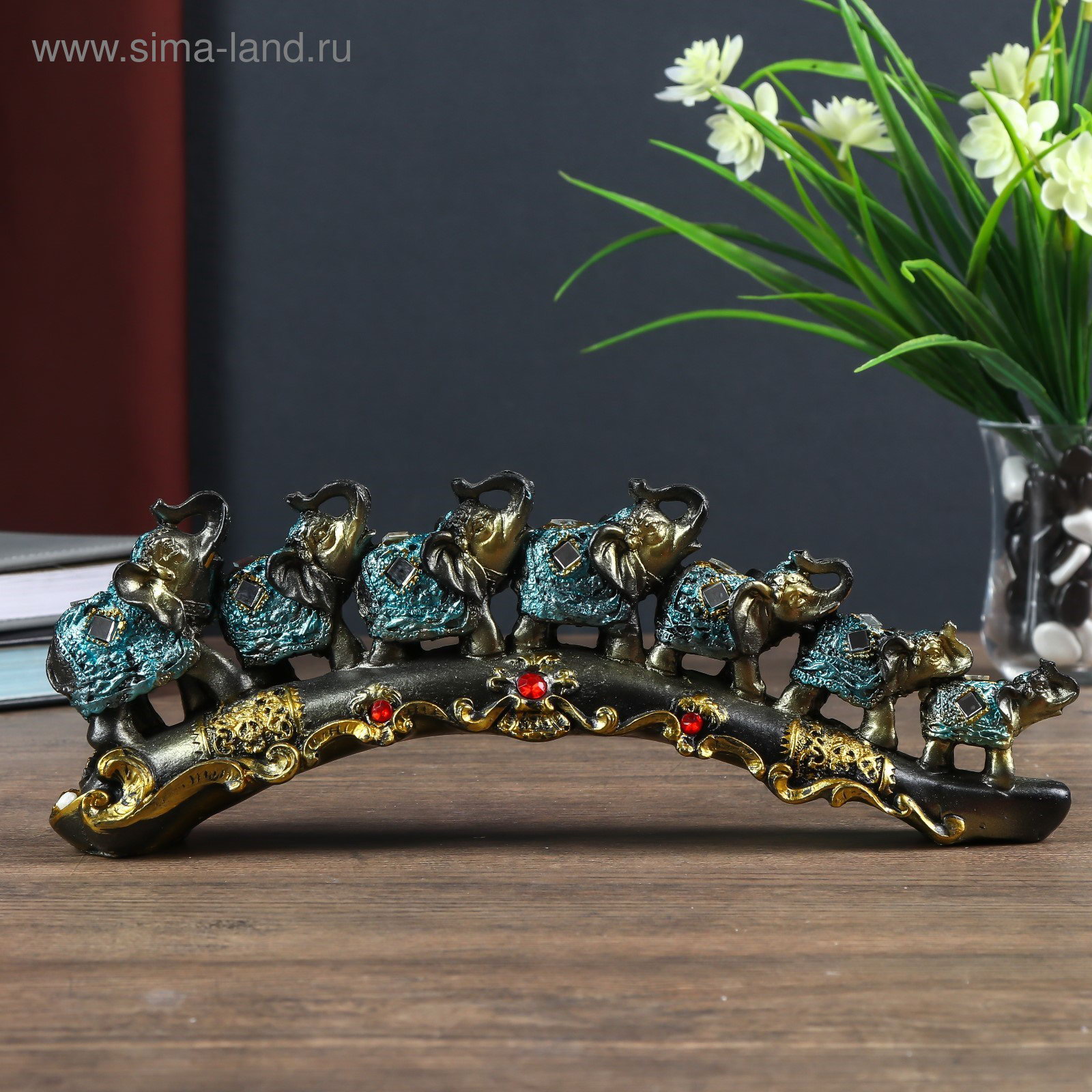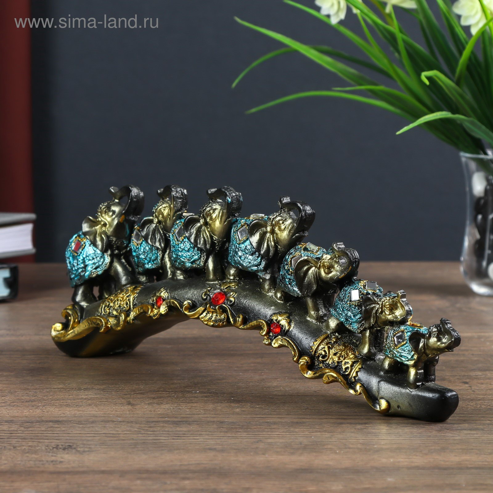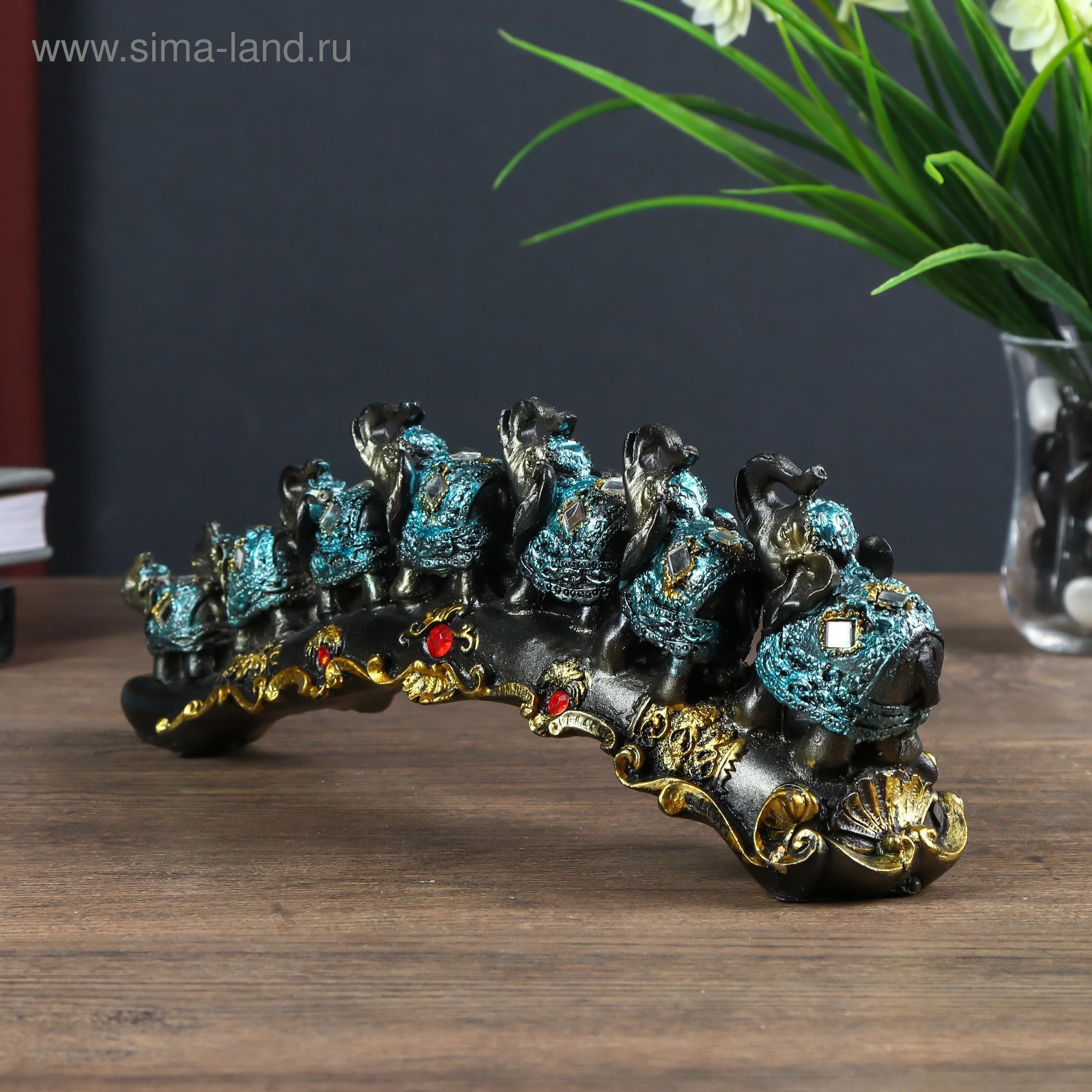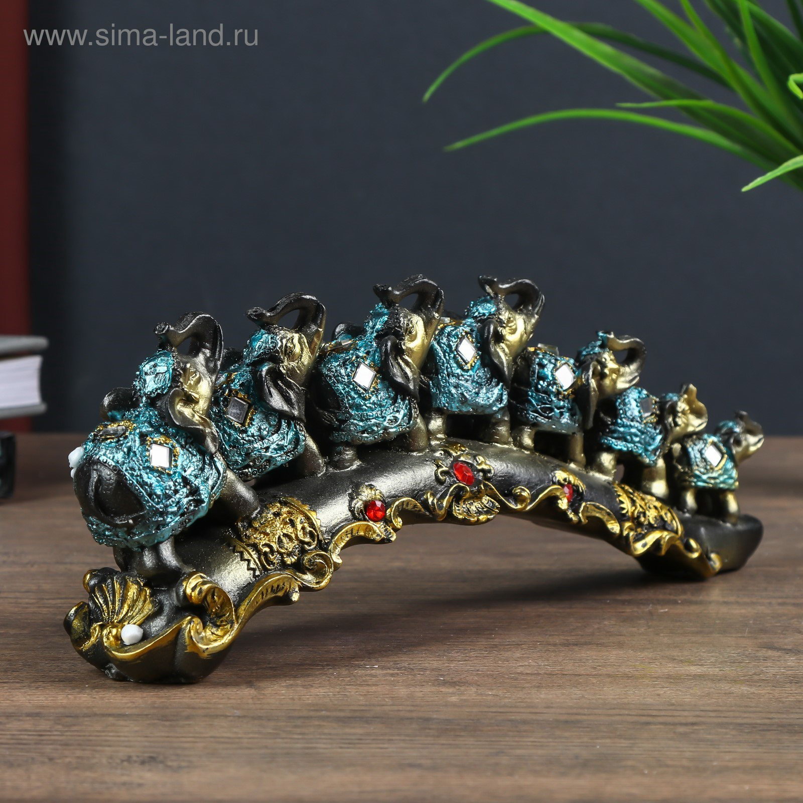 Фигура полистоун "Семь слонов в синей попоне с кистями и зеркалами на бивне", 10x5.5x28 см, 5.5x28x10 см., Китай