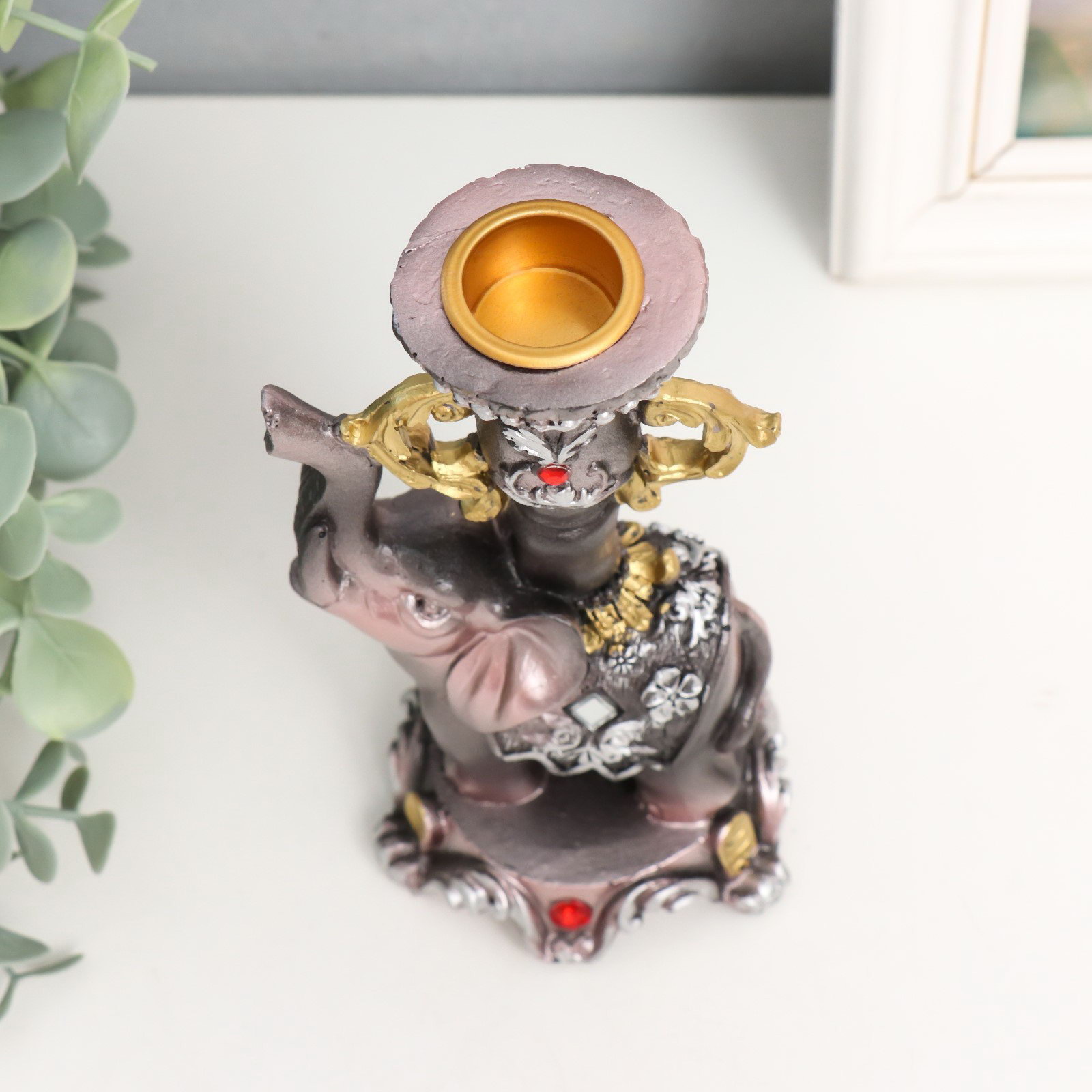 Фигурка-подсвечник полистоун "Слон на пьедестале в попоне с цветами", 15.5x8x7.5 см, 8x7.5x15.5 см., Китай