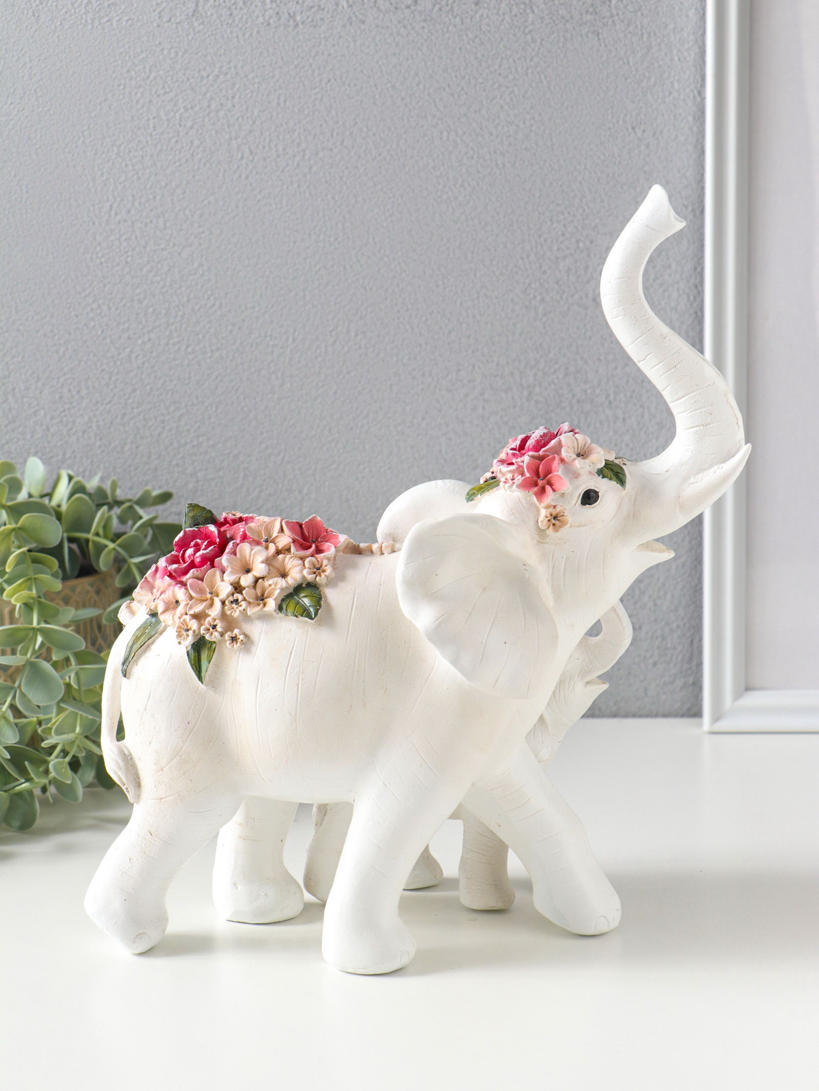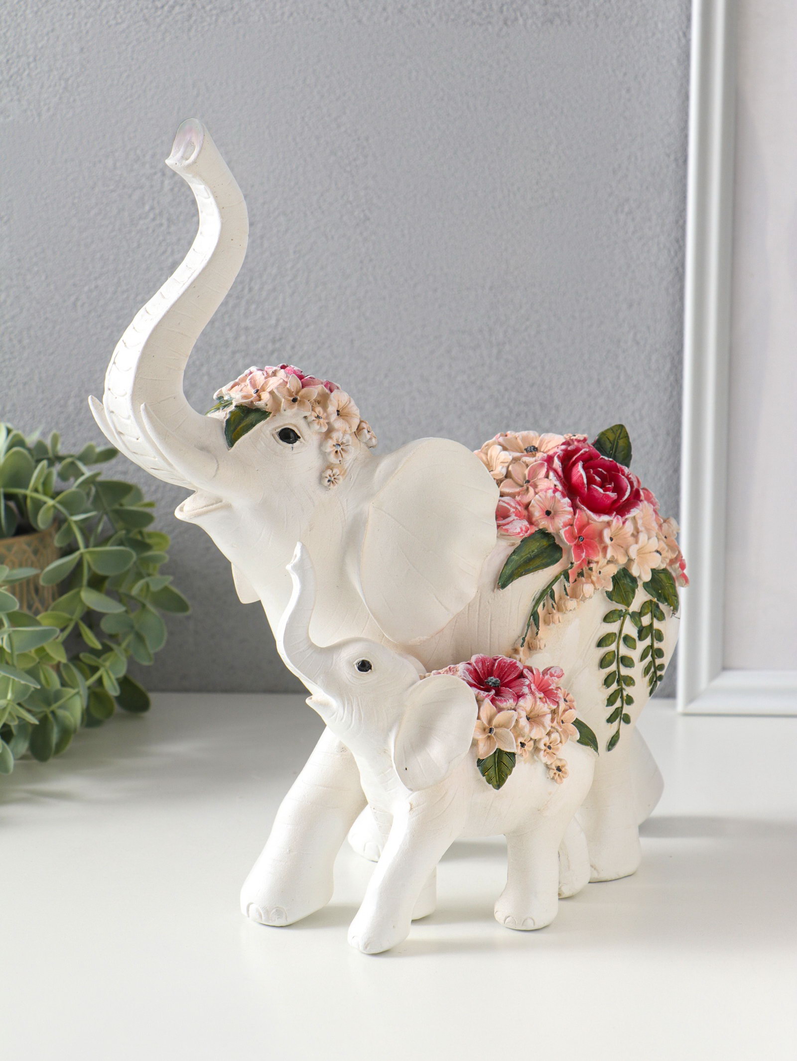 Сувенир полистоун "Белый слон со слонёнком в цветах" 25.4х13.8х29.2 см, 13.8x25.4x29.2 см., Китай