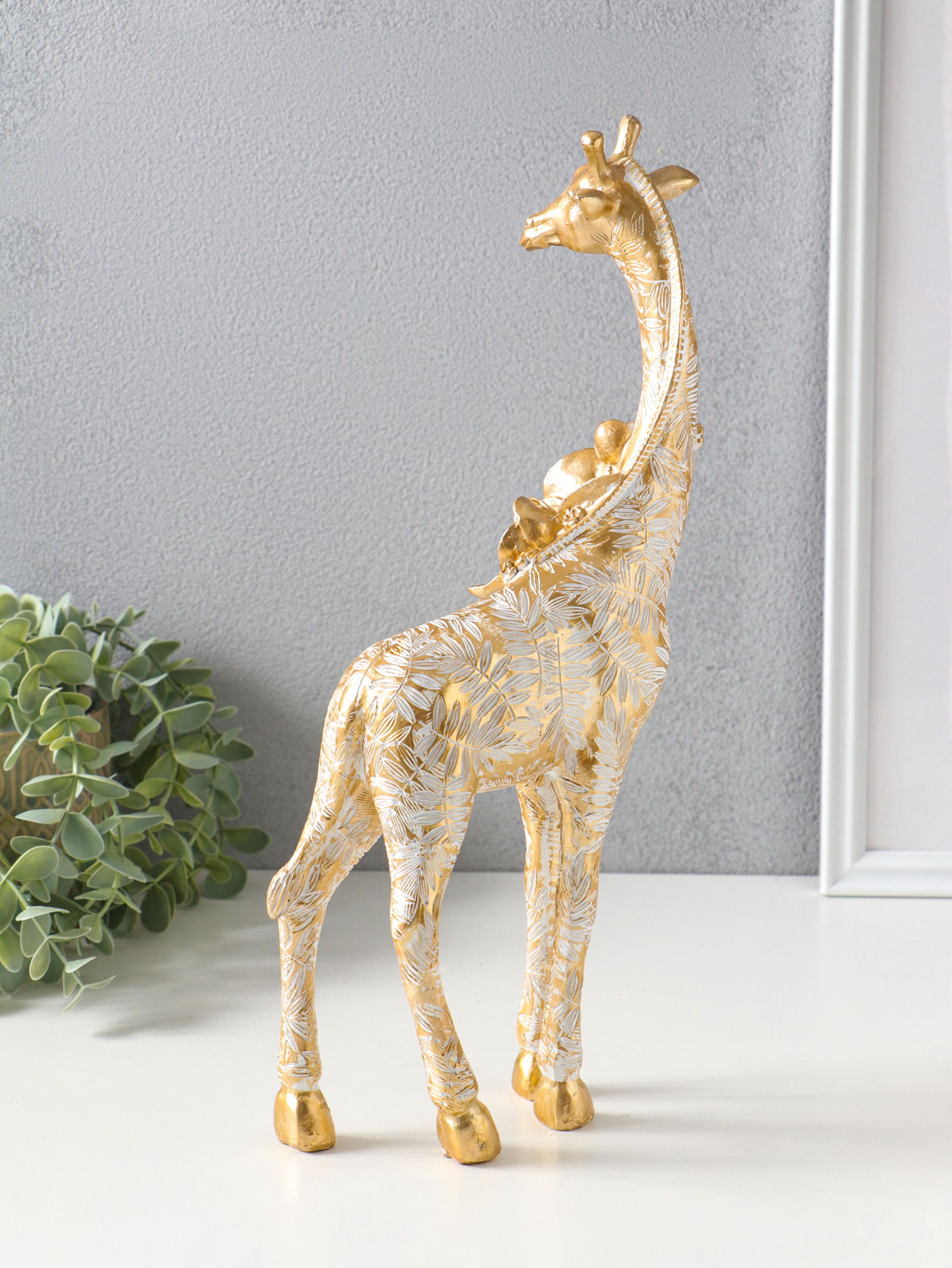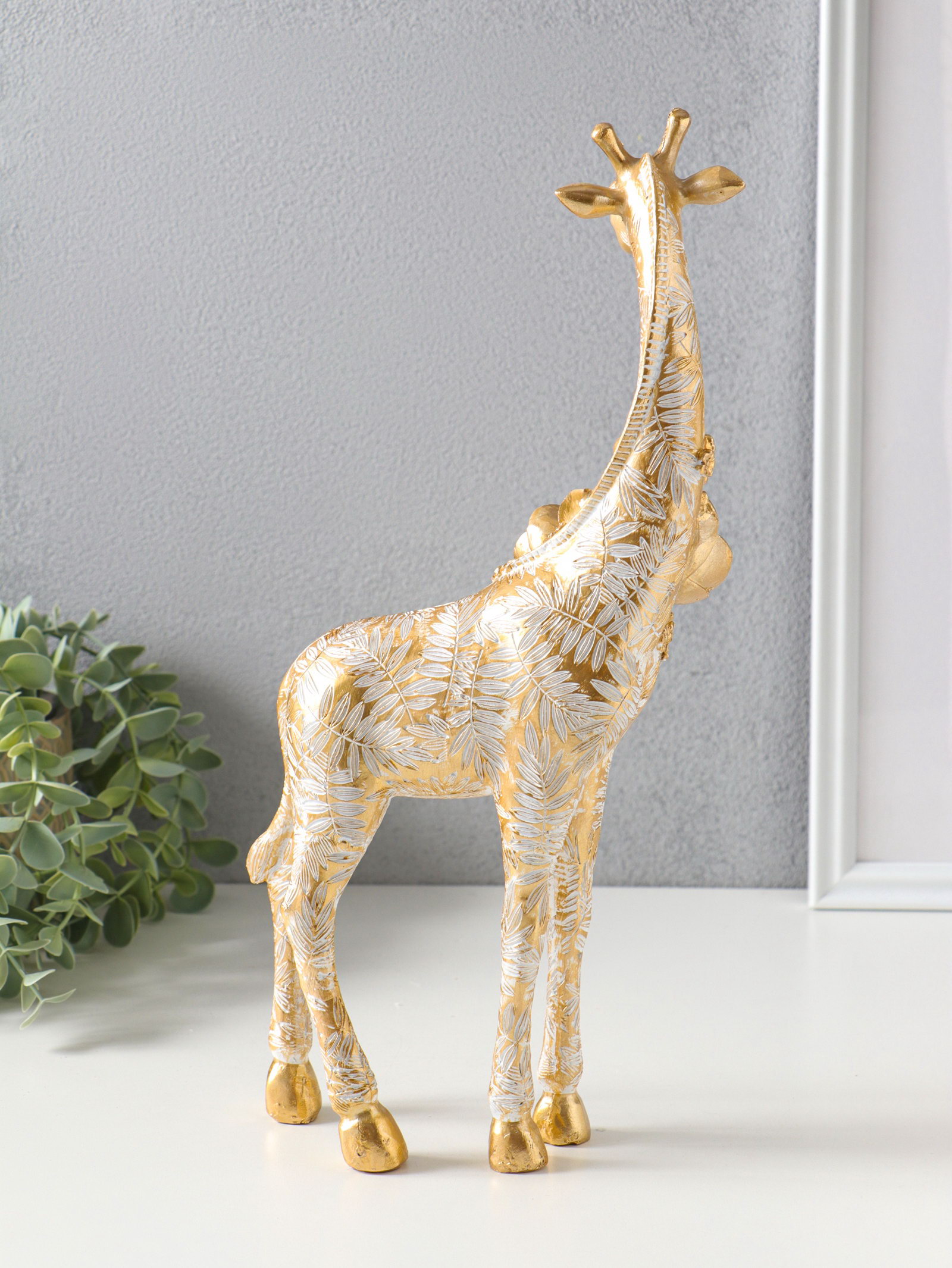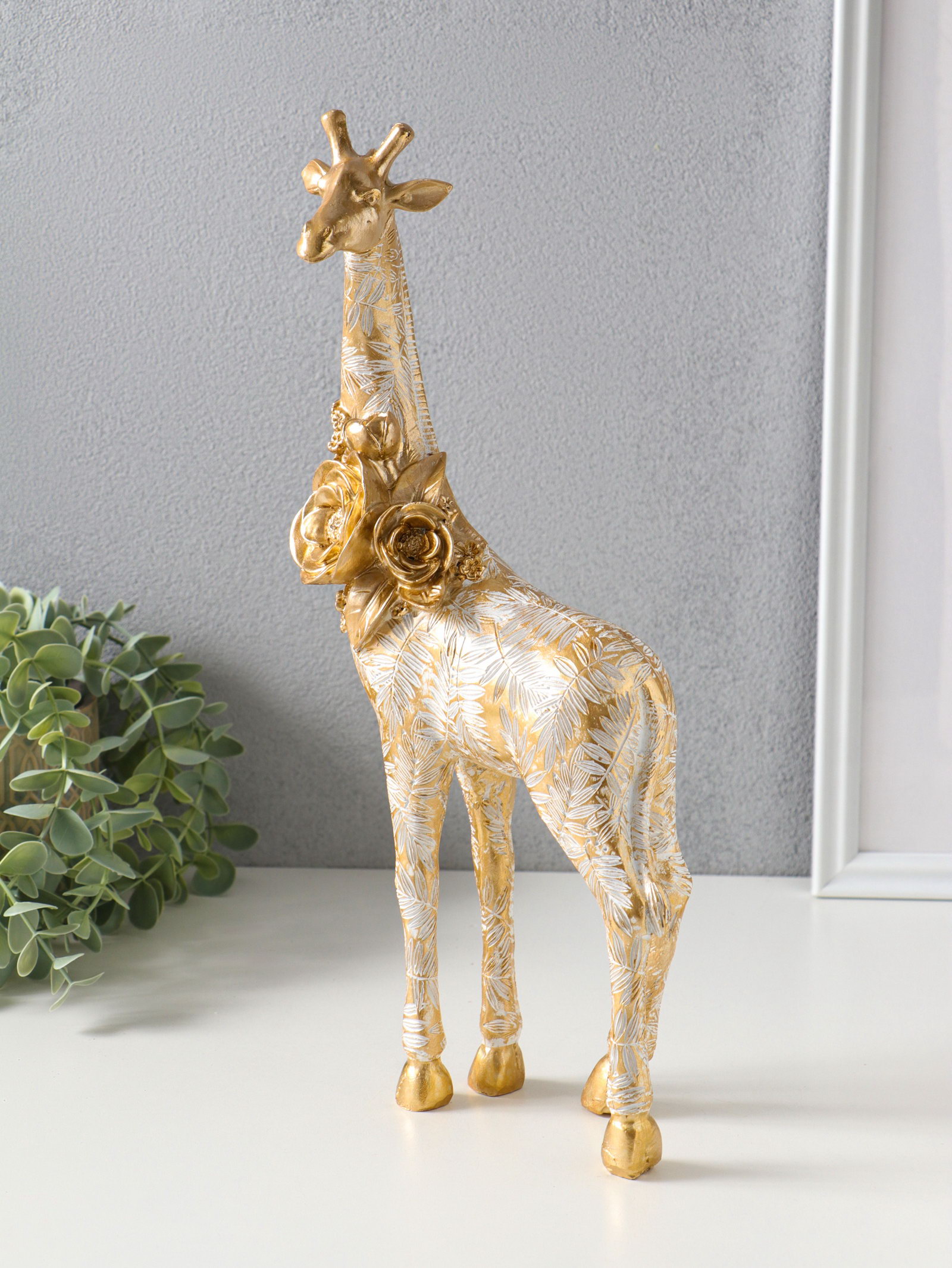 Сувенир полистоун "Жираф с листьями и цветами" бело-золотой 17.3х8.3х35.5 см, 8.3x17.3x35.5 см., Китай