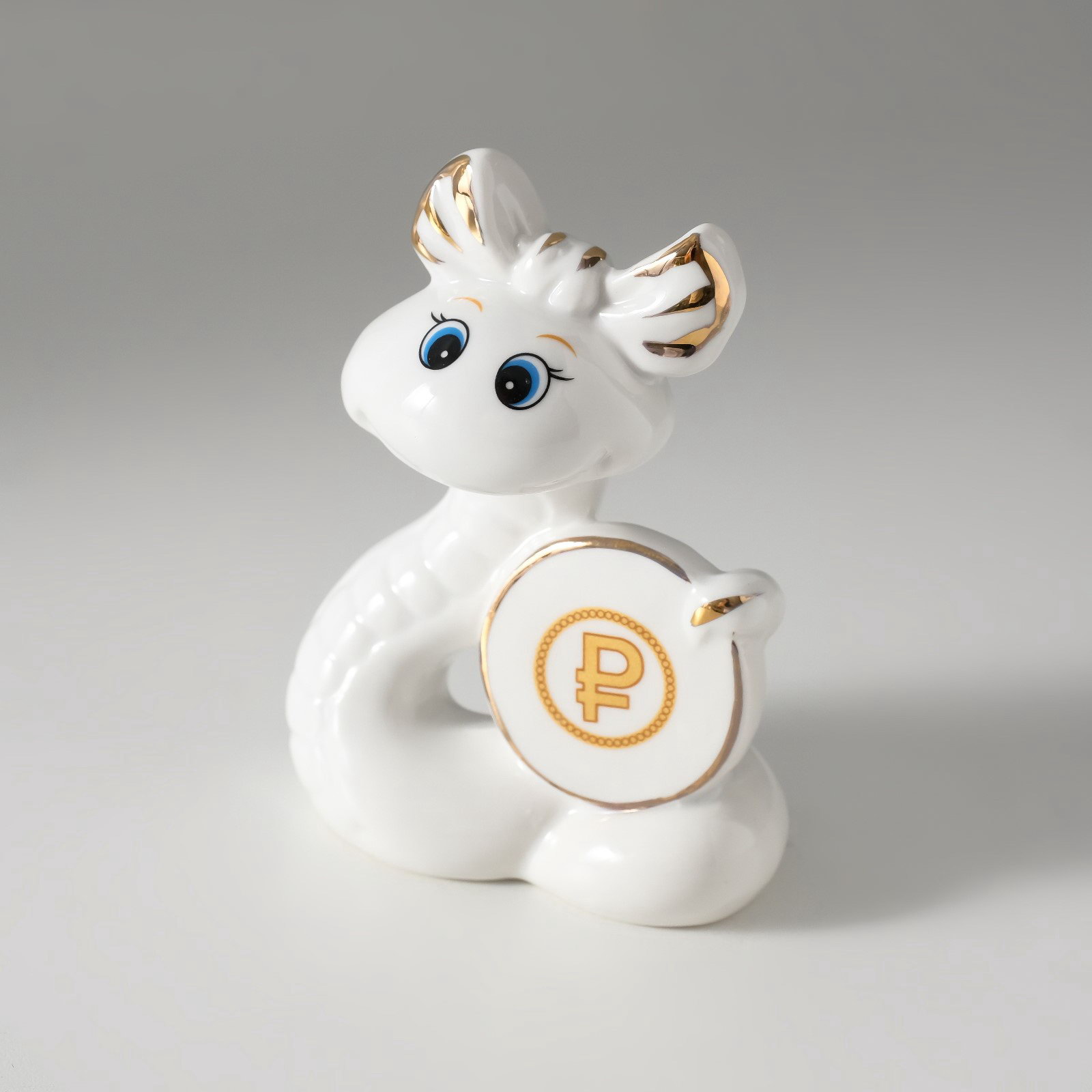 Фигурка керамика "Белая змейка с бантиком, с монеткой $", с золотом, 3x7.5x9.3 см, 7.5x3x9.3 см., Китай