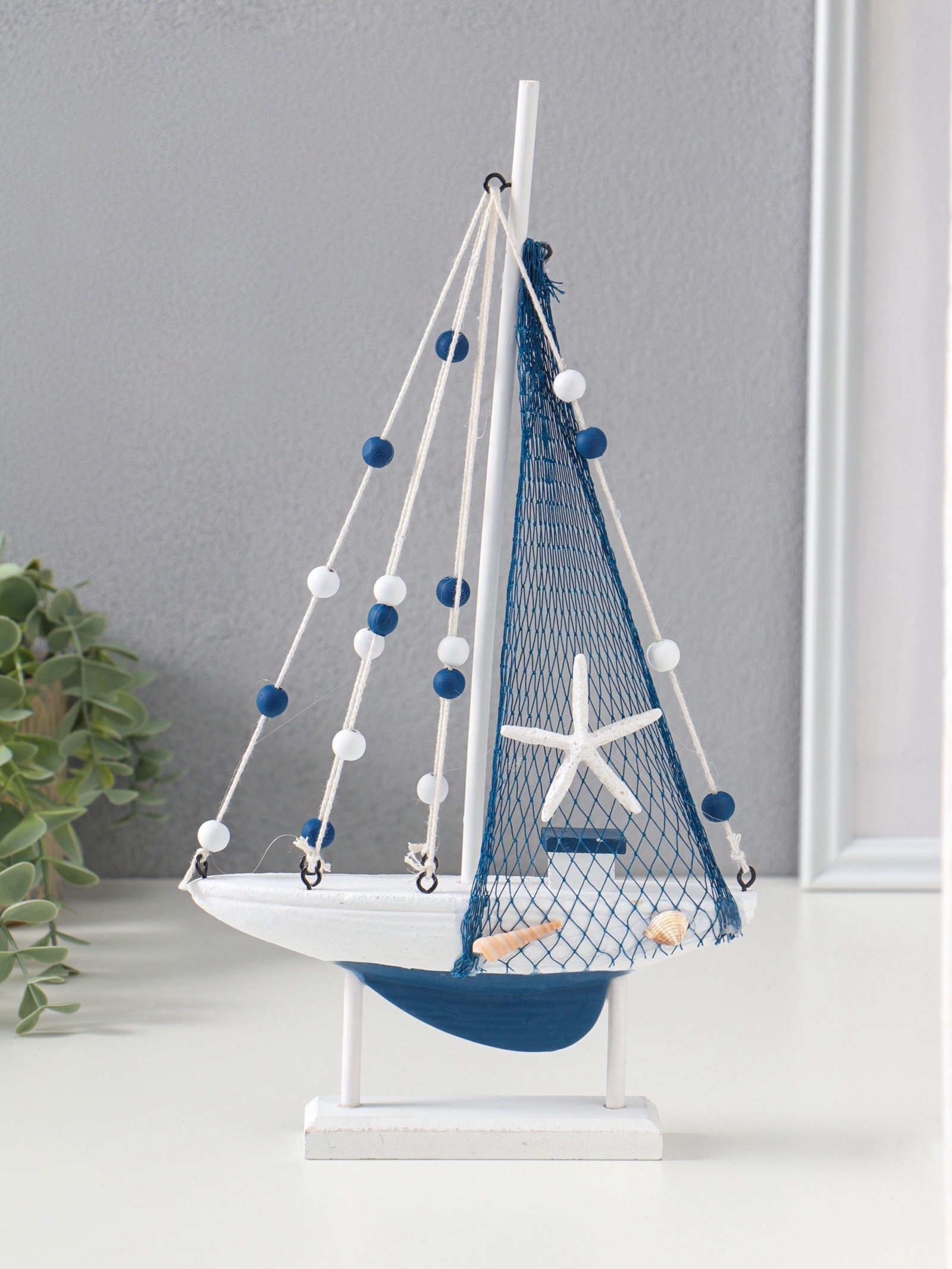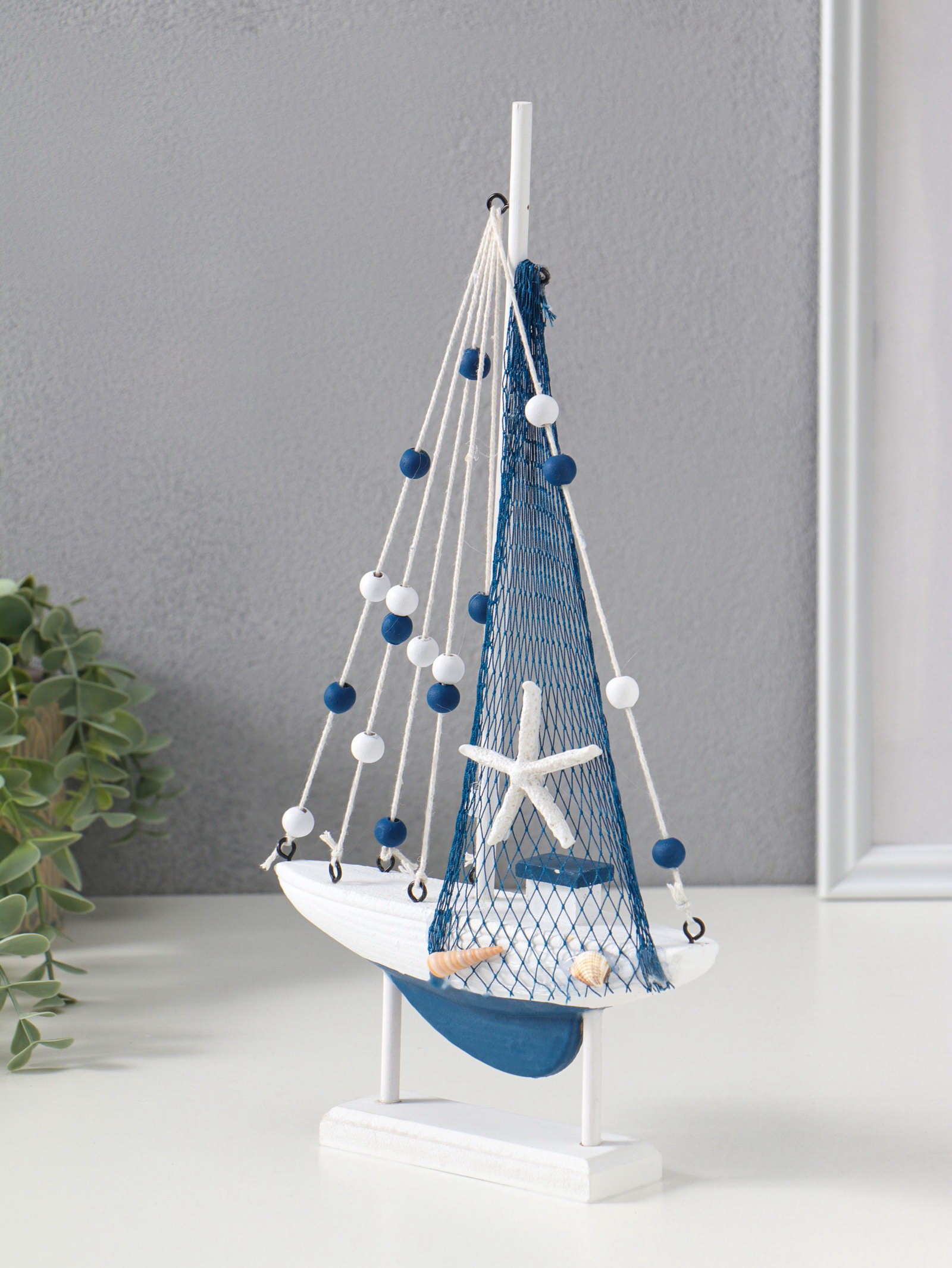 Размер упаковки: 5 x 33 x 18 см. tnved: 4420190000 Цвет борта: Белый Цвет паруса: Синий Размер корабля: Средний (длина от 27 см до 50 см) Эта бело-синяя модель парусника не просто сувенир, а частица морской романтики, застывшая в дереве. Она напоминает о ветре, наполняющем паруса, и далёких горизонтах. Средний размер делает модель заметным акцентом в кабинете или гостиной, не загромождая пространство. Тщательная работа видна в каждой детали: от изящных снастей до узнаваемого символа морской звезды на парусе. Детали, которые говорят сами за себя