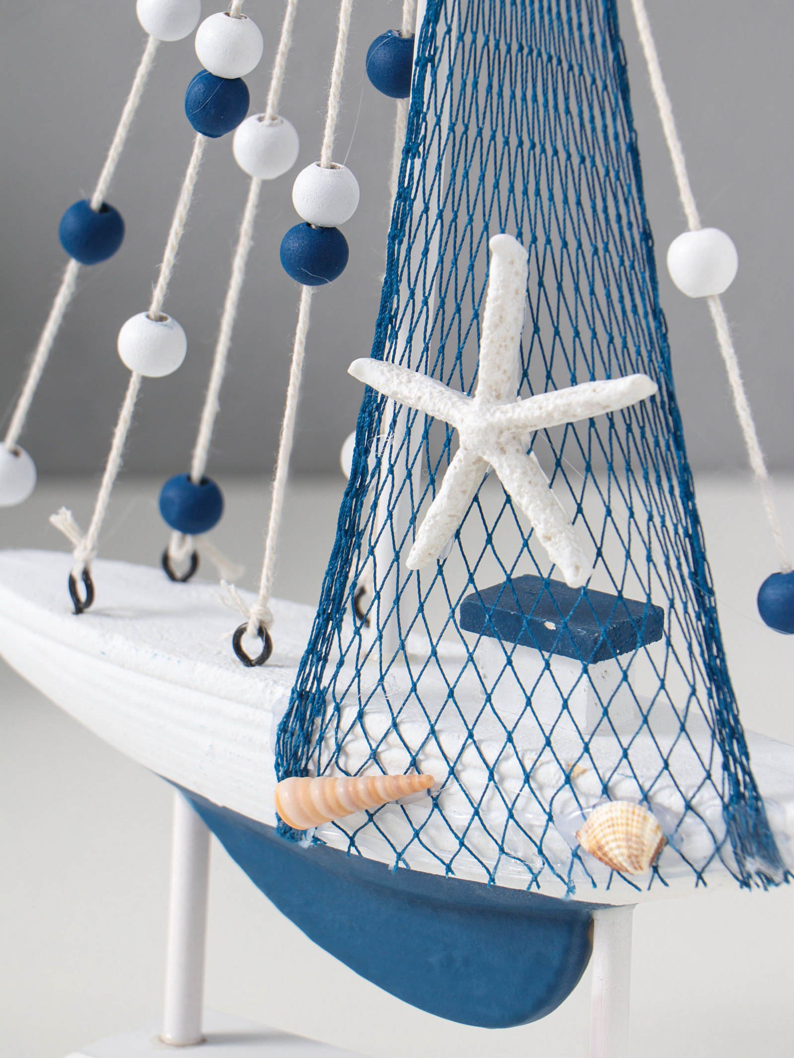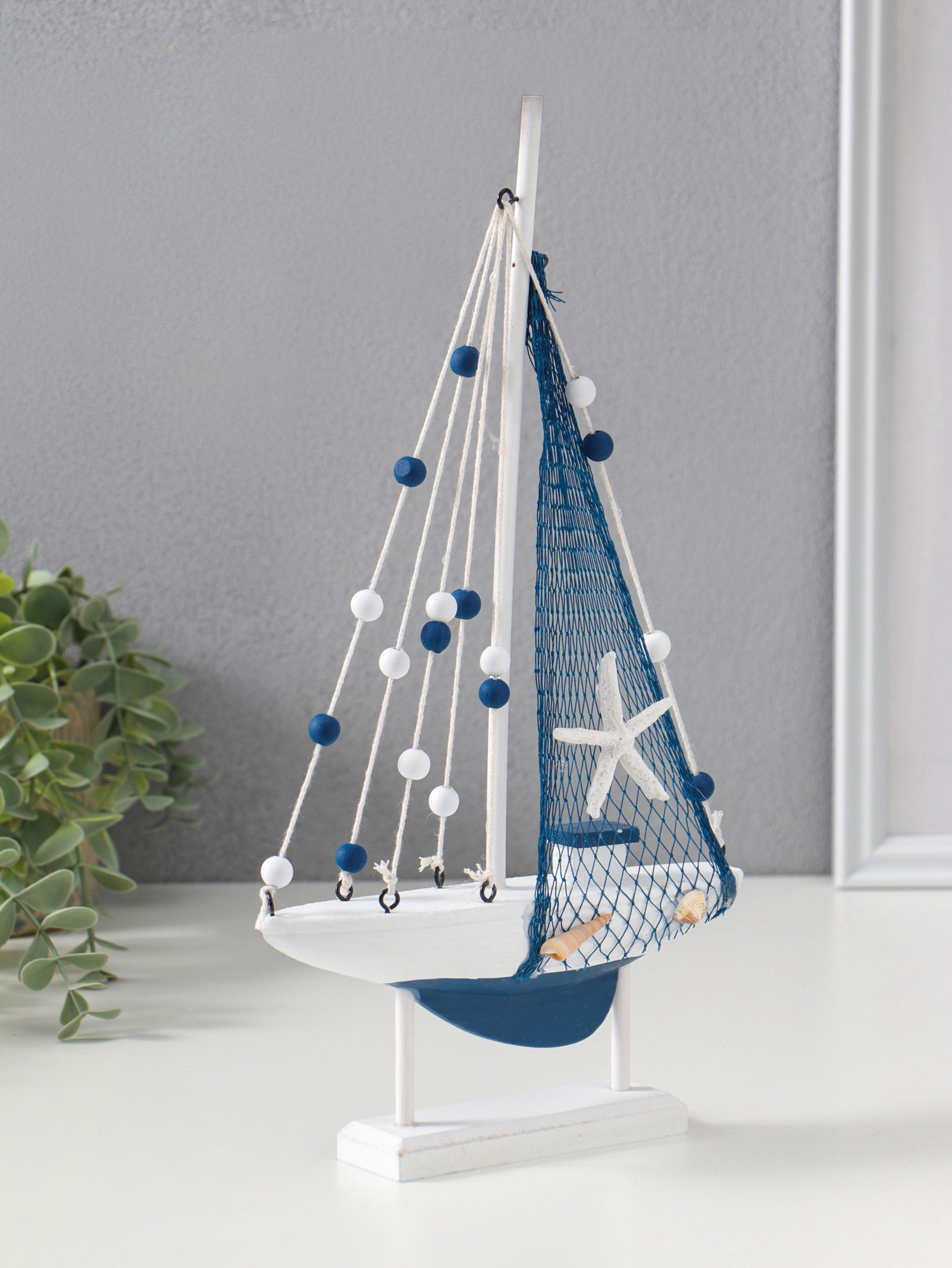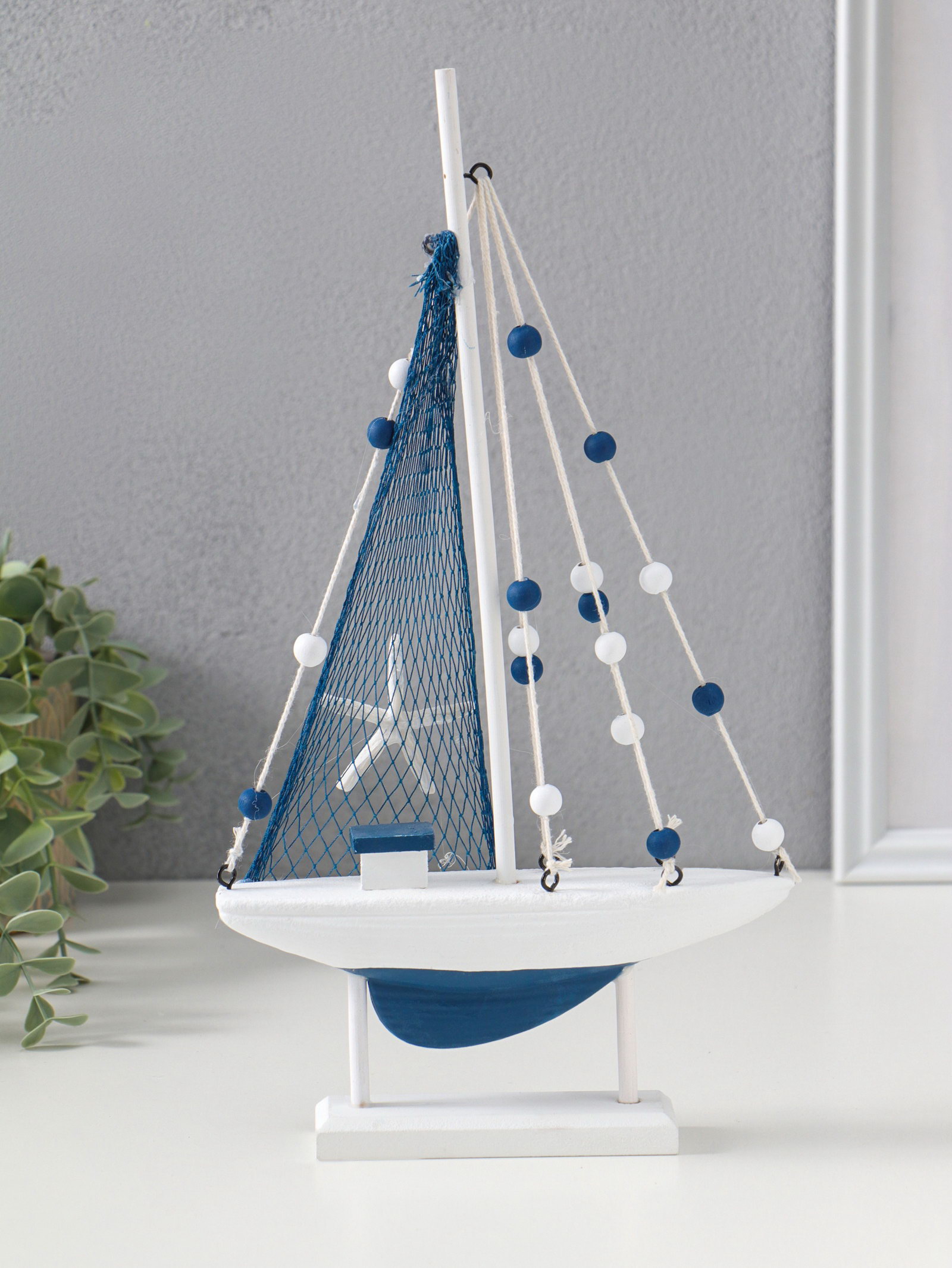 Сувенирная модель корабля дерево "Парусник с морской звездой на парусе", бело-синий, 17.5x4x31 см, 4x17.5x31 см., Китай