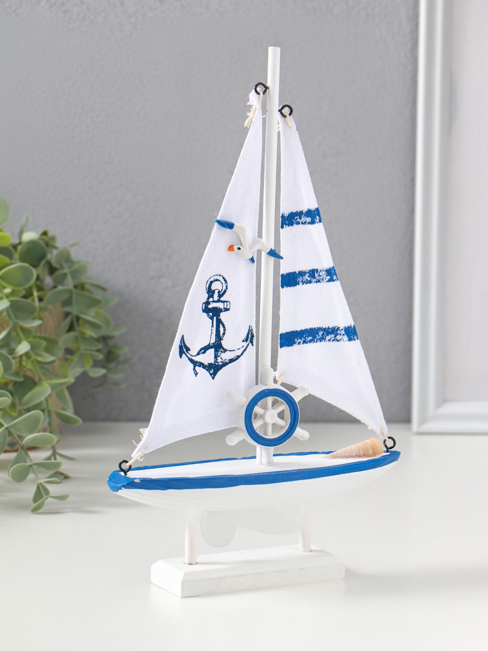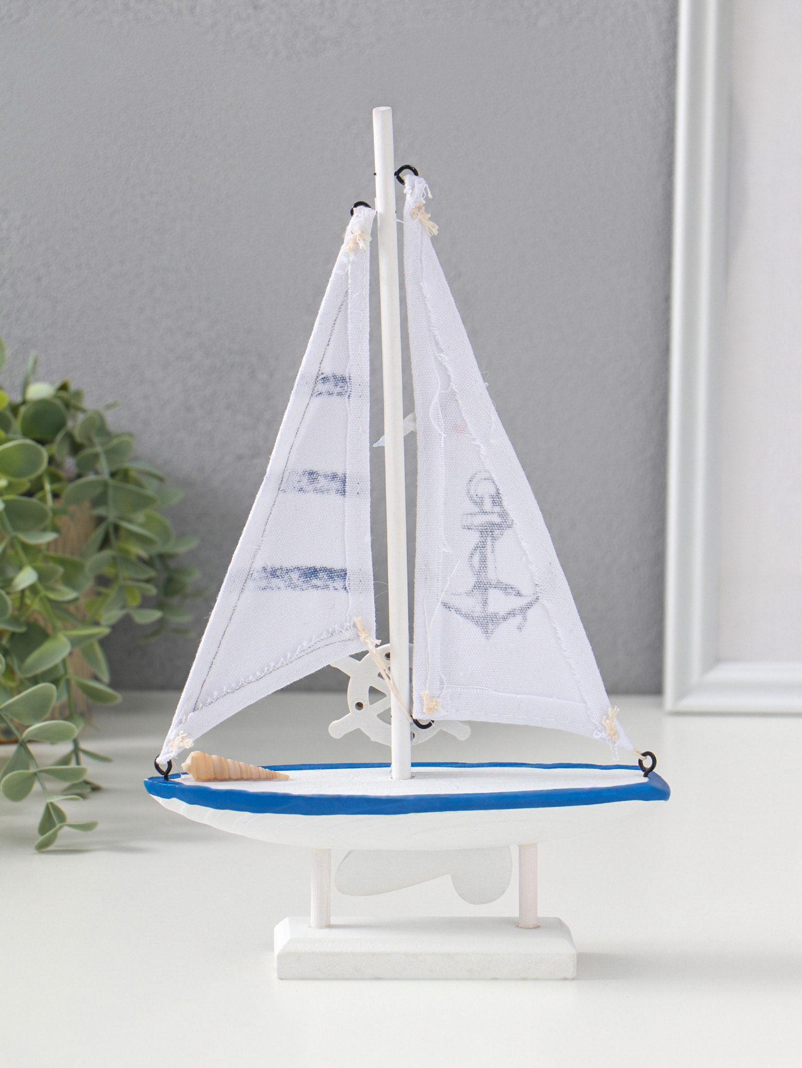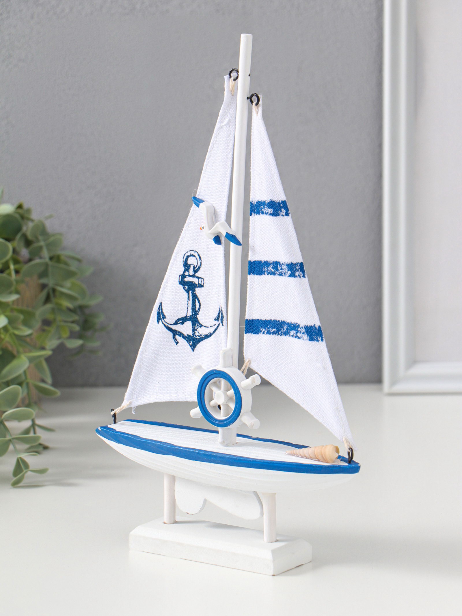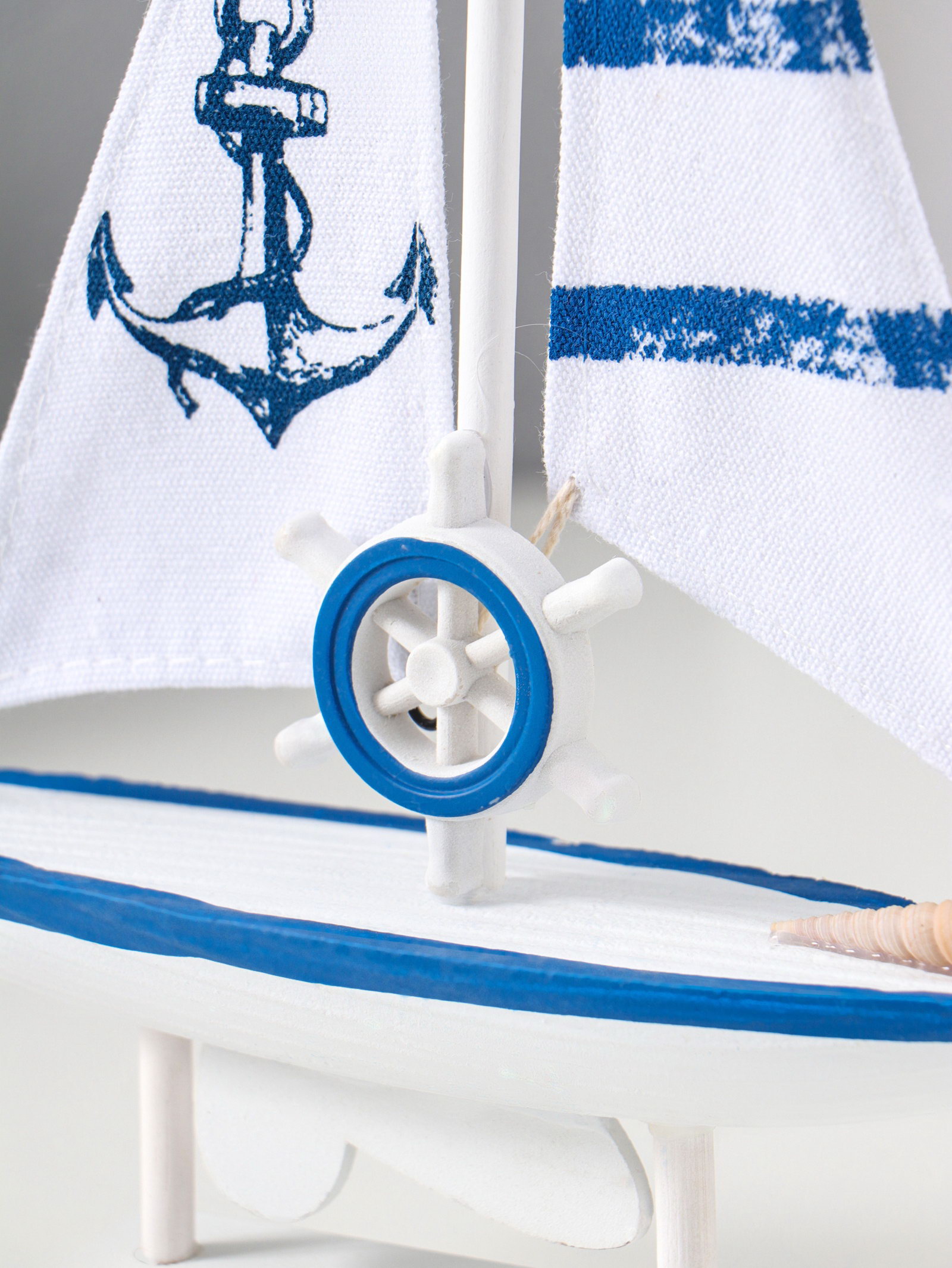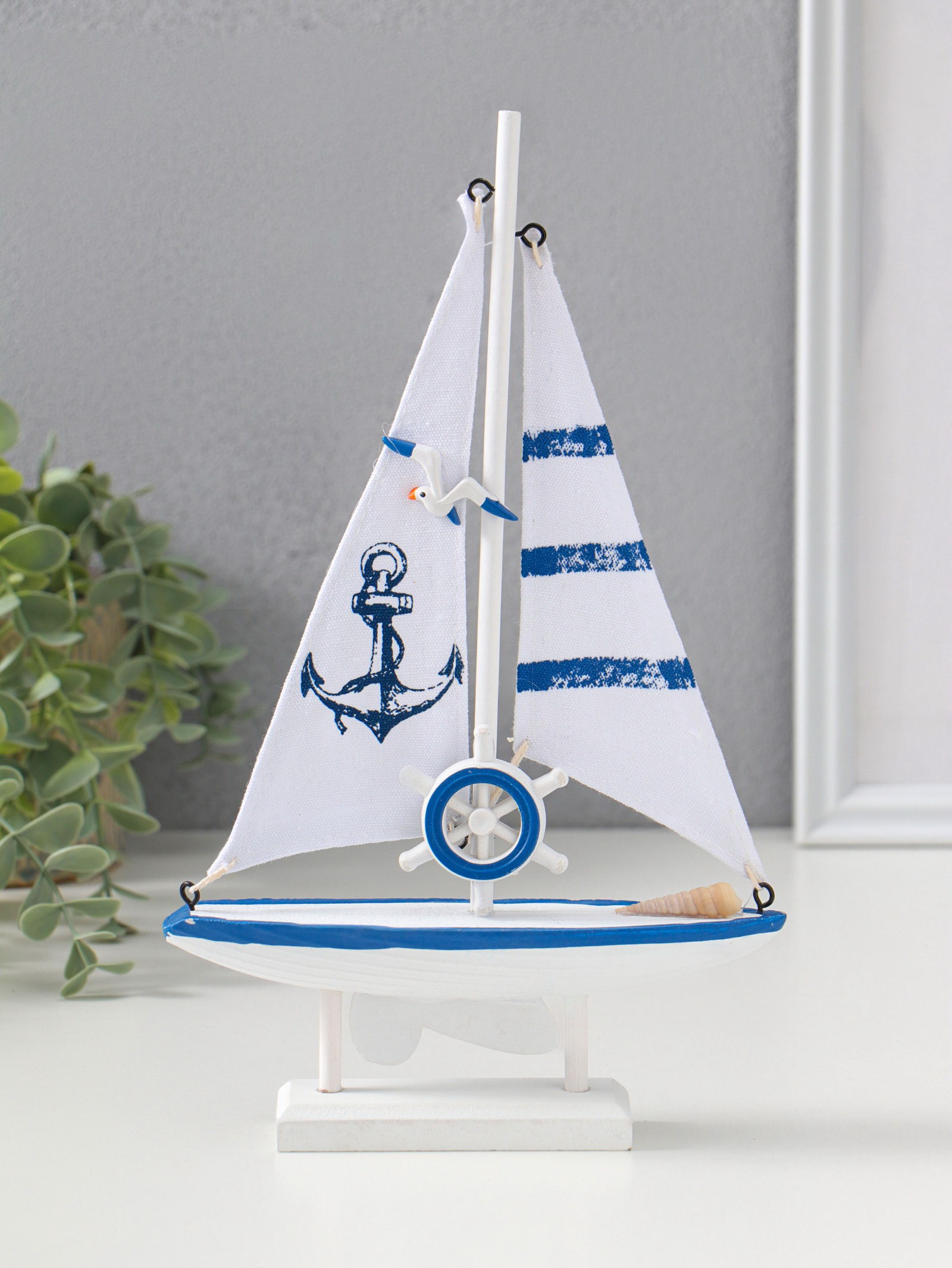 Сувенирная модель корабля дерево "Парусник с якорем на парусе", бело-синий, 16.5x4.5x27.5 см, 4.5x16.5x27.5 см., Китай