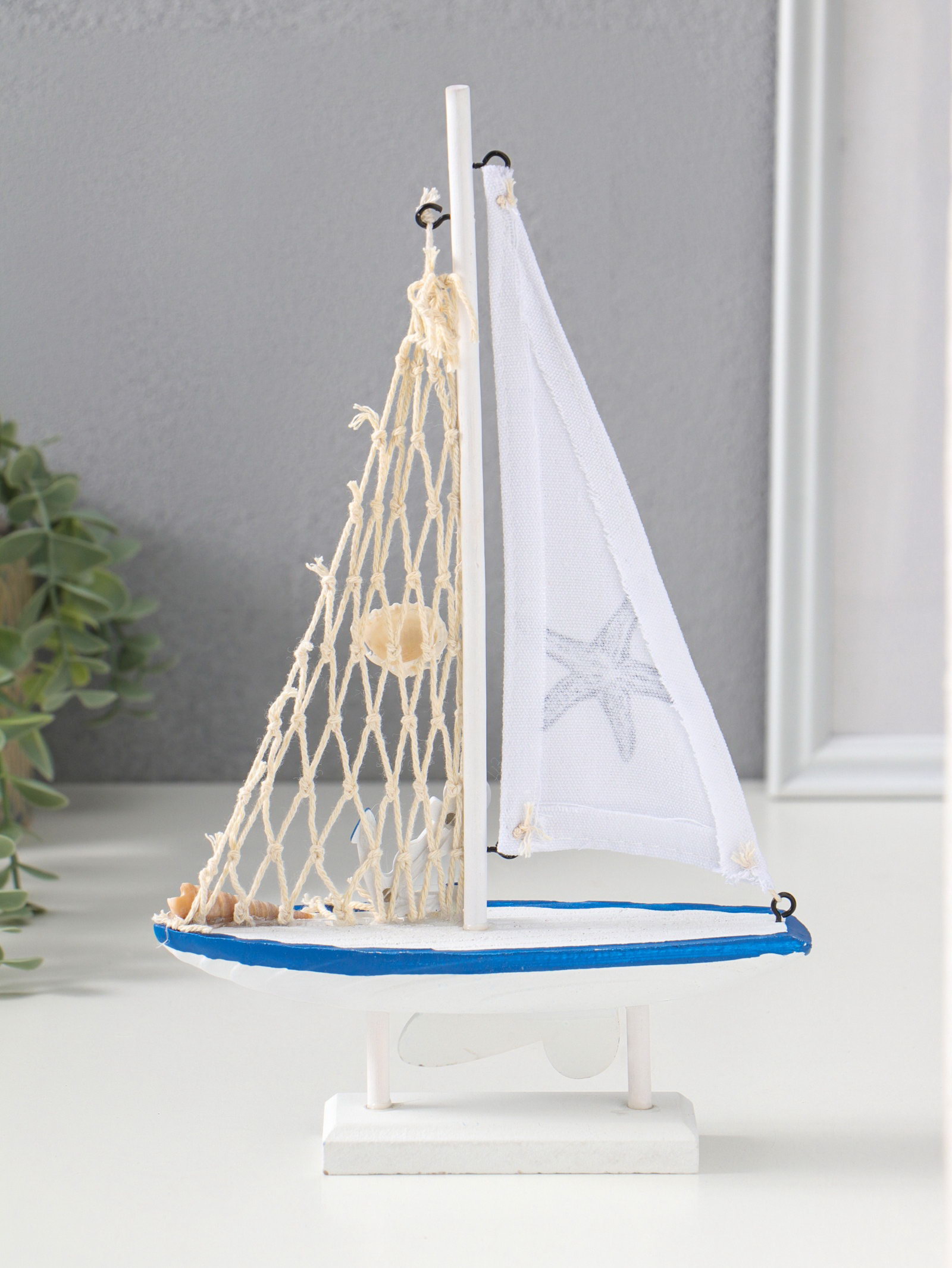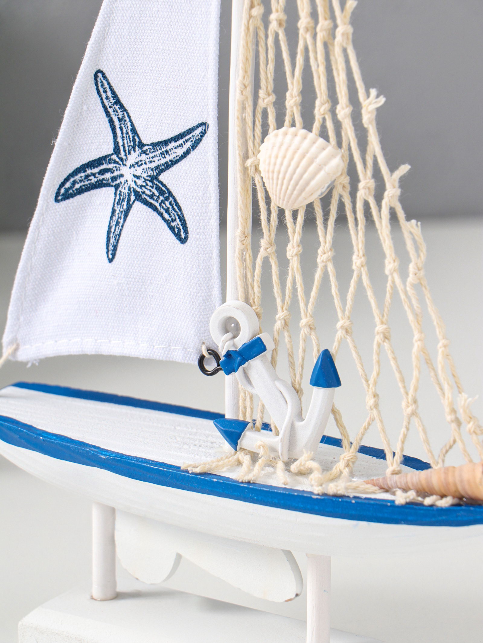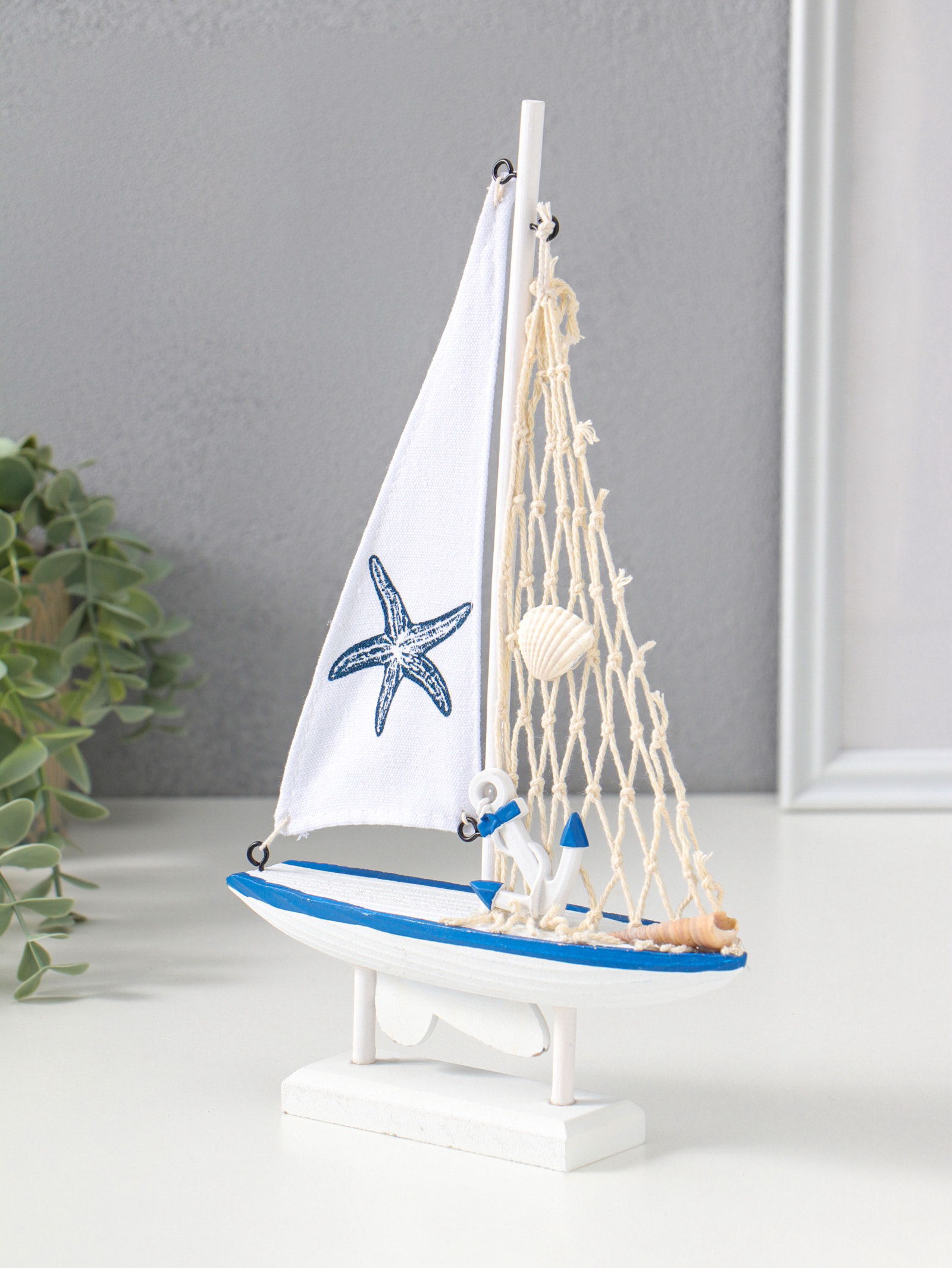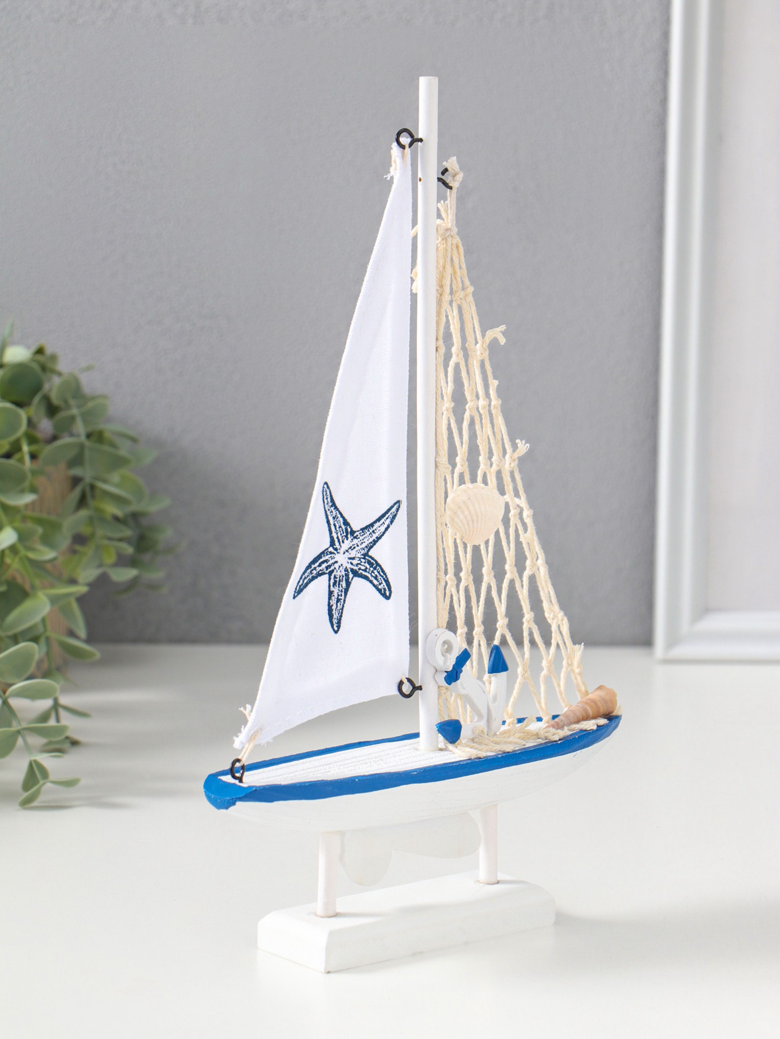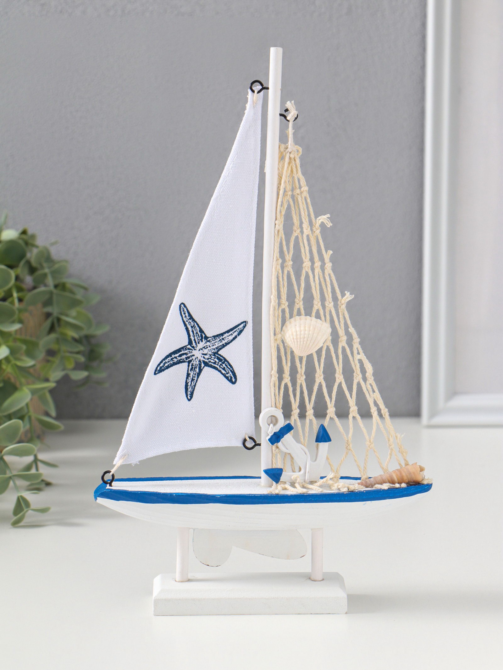 Сувенирная модель корабля дерево "Парусник с морской звездой на парусе", бело-синий, 16.5x4.5x27.5 см, 4.5x16.5x27.5 см., Китай