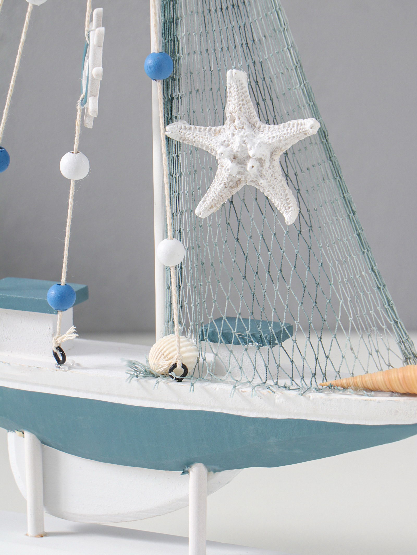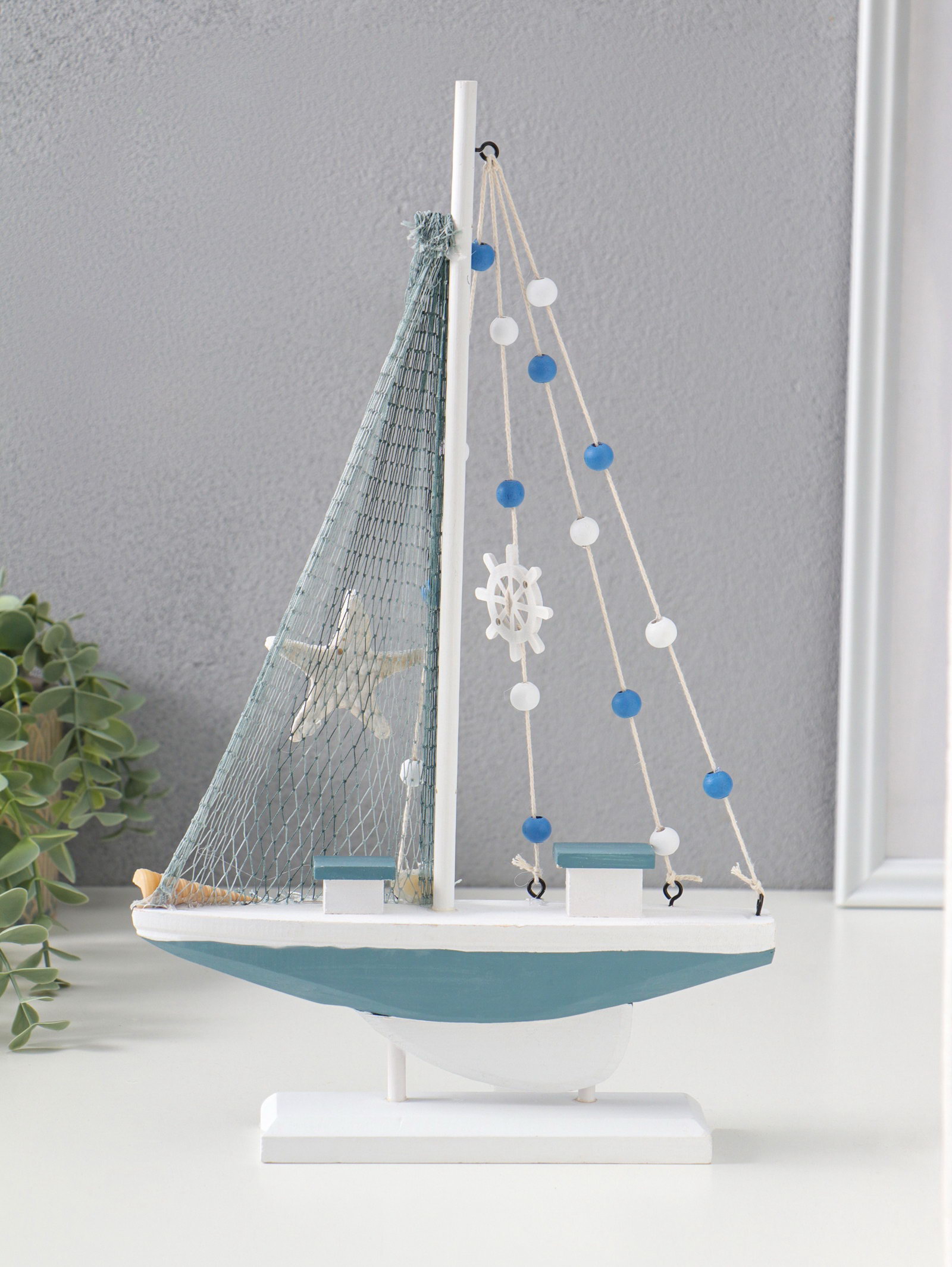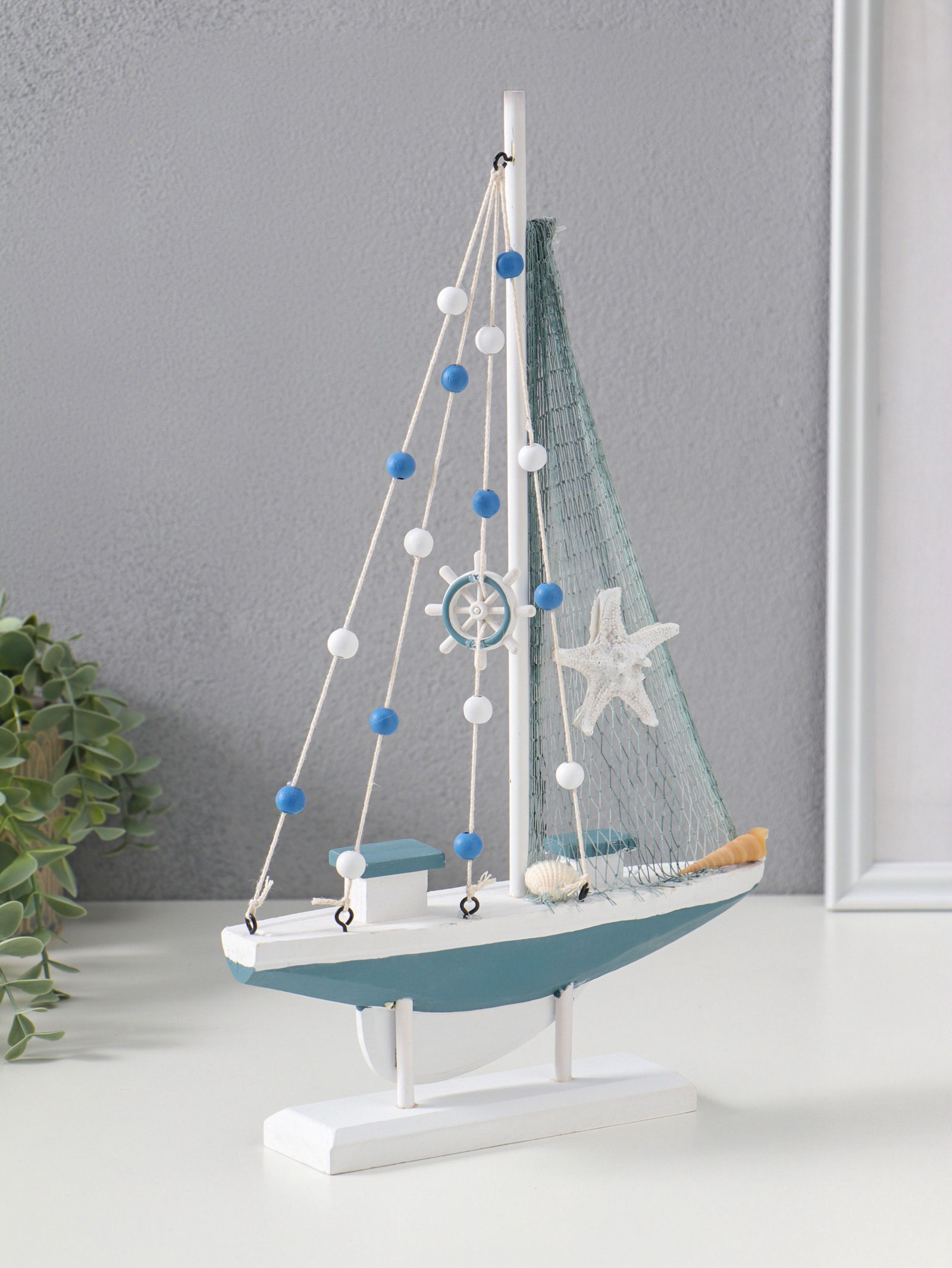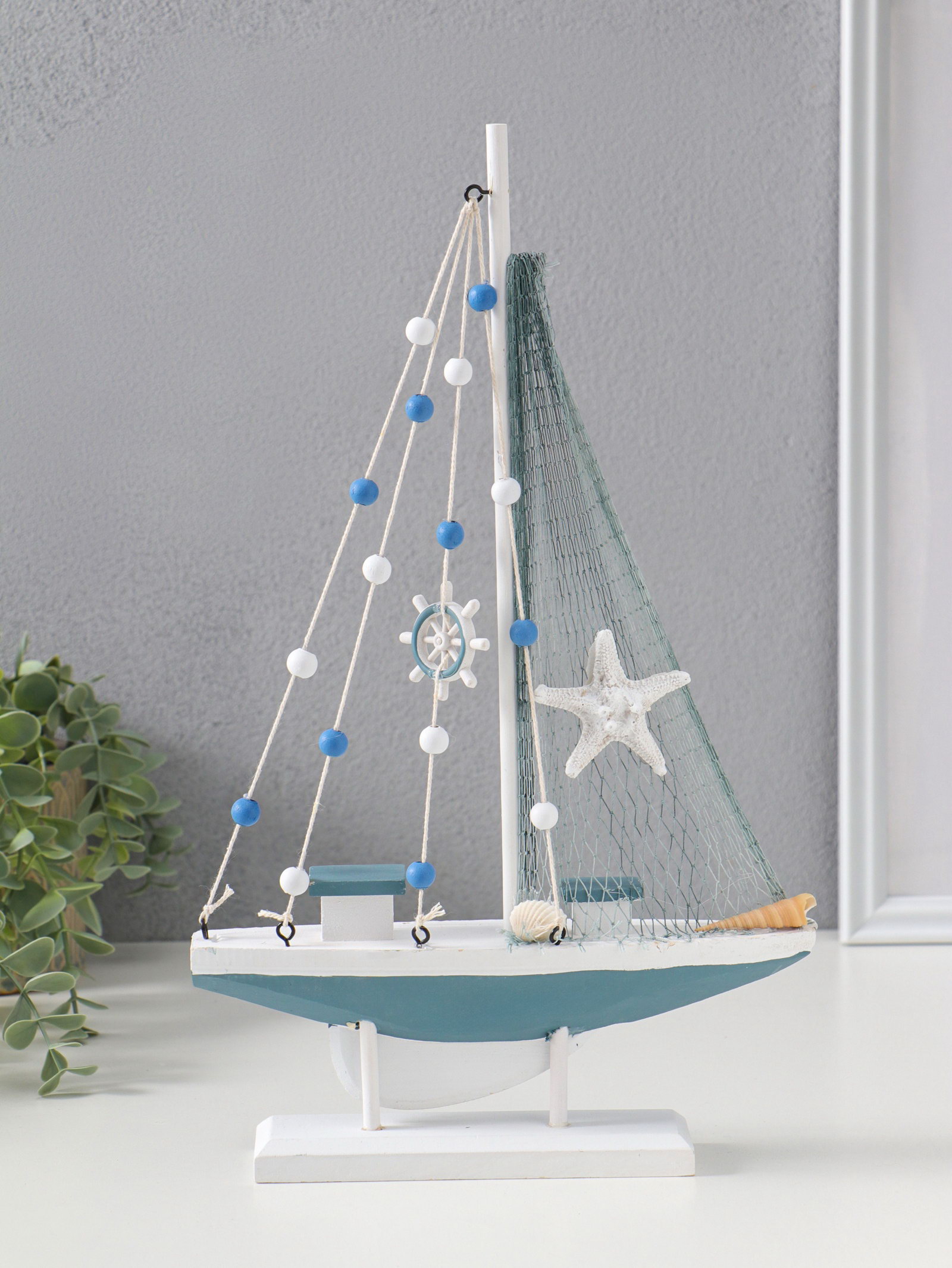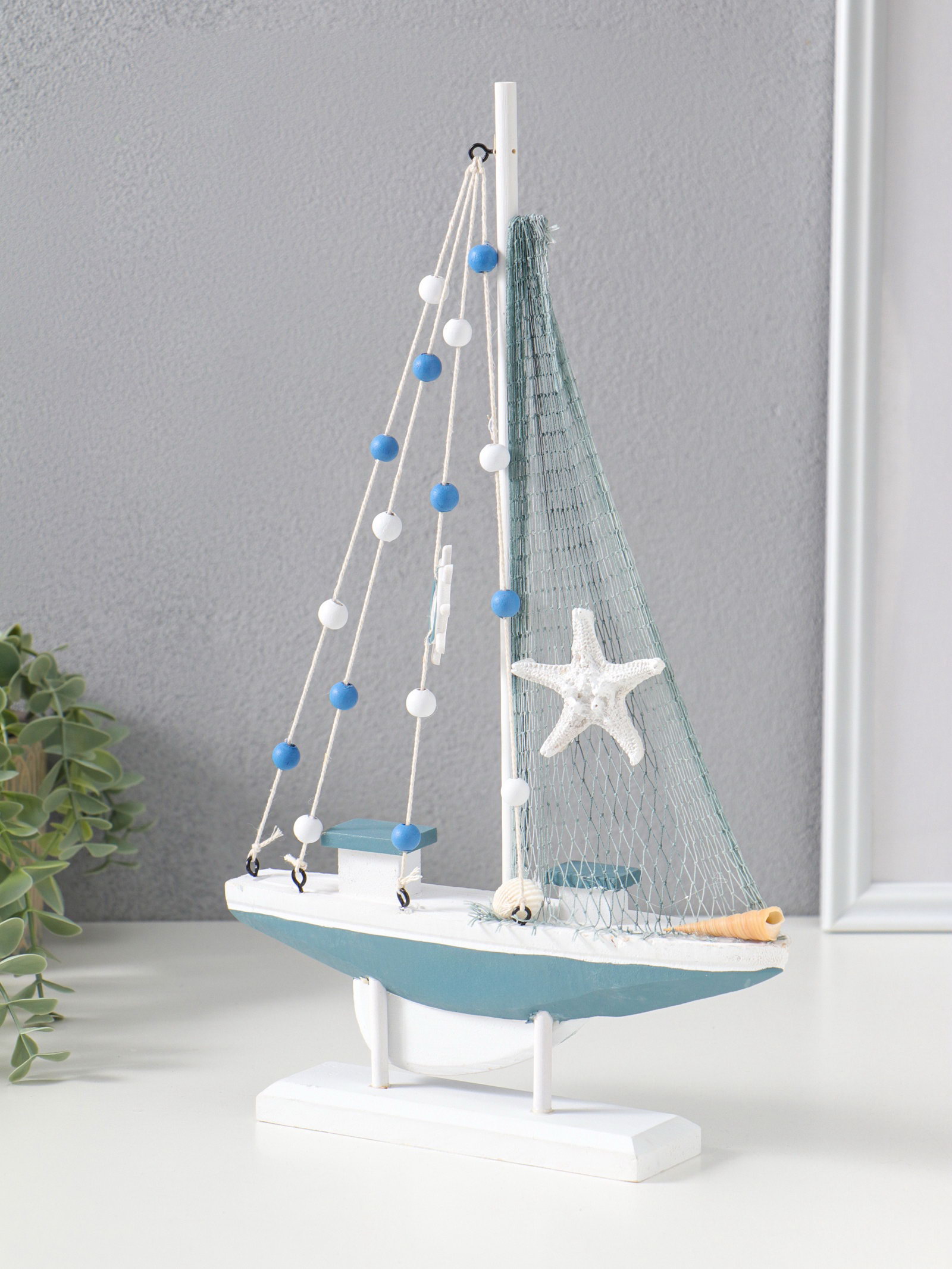 Сувенирная модель корабля дерево "Парусник с якорем и морской звездой", бело-голубой, 21.5x4.5x36 см, 4.5x21.5x36 см., Китай