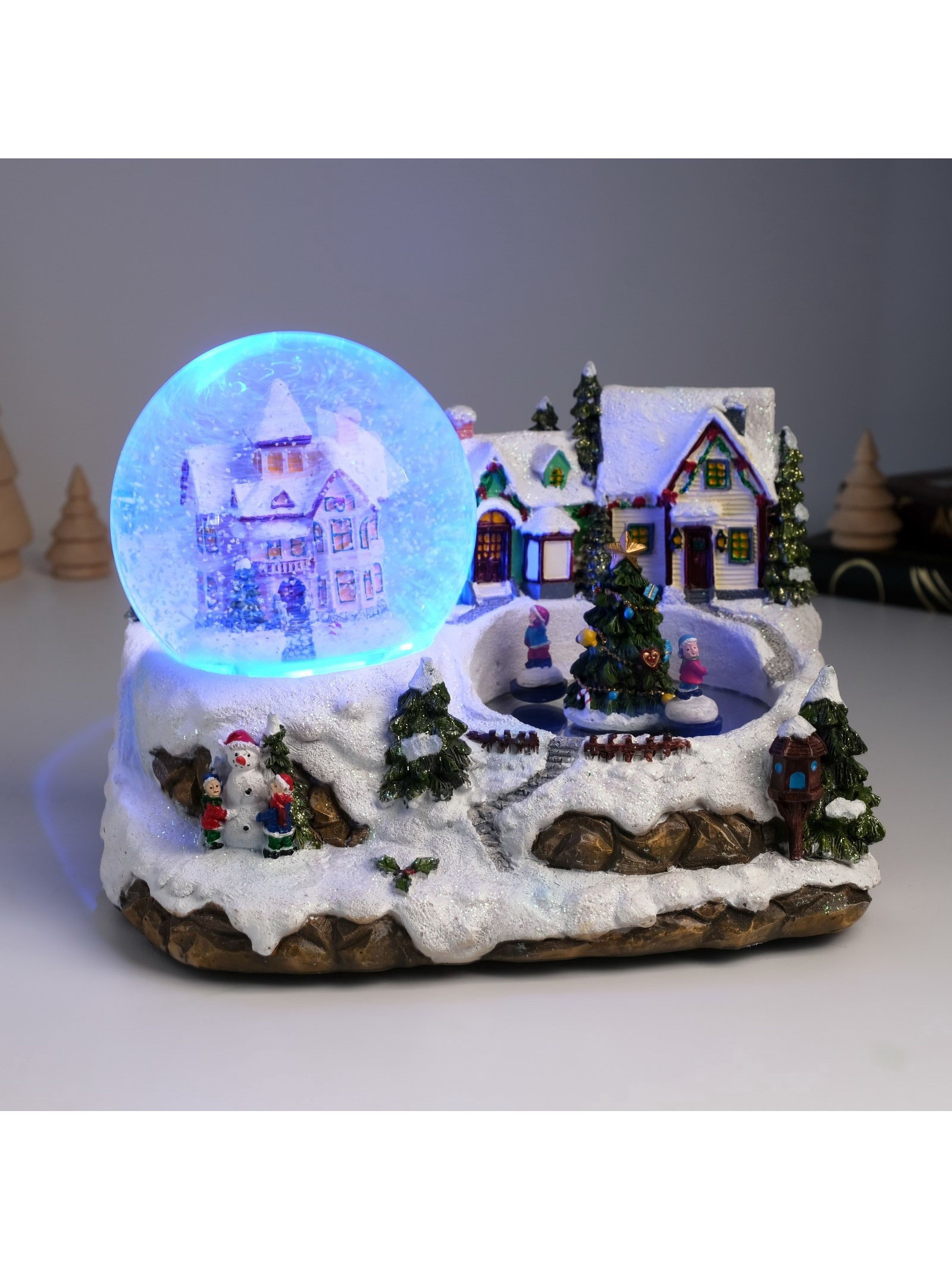 Снежный шар новогодний стеклянный "Ёлка на катке, дети крутятся", музыкальный, световой, d=10 см, 22x15.5x15.5 см, Китай