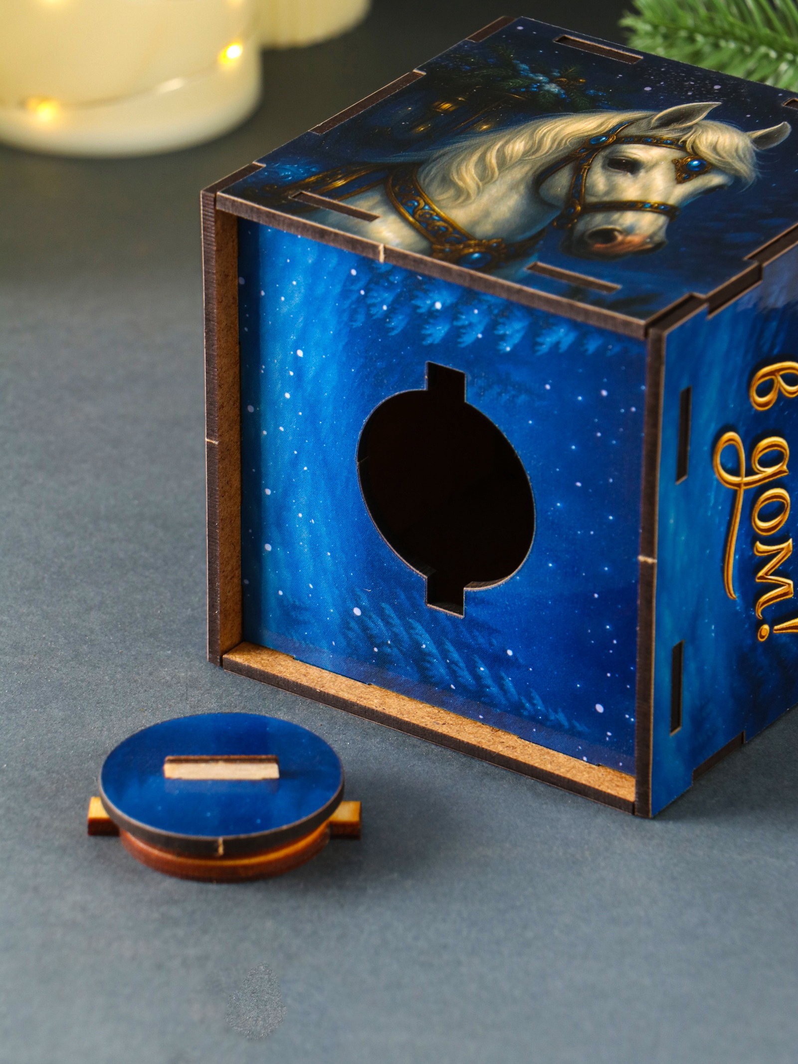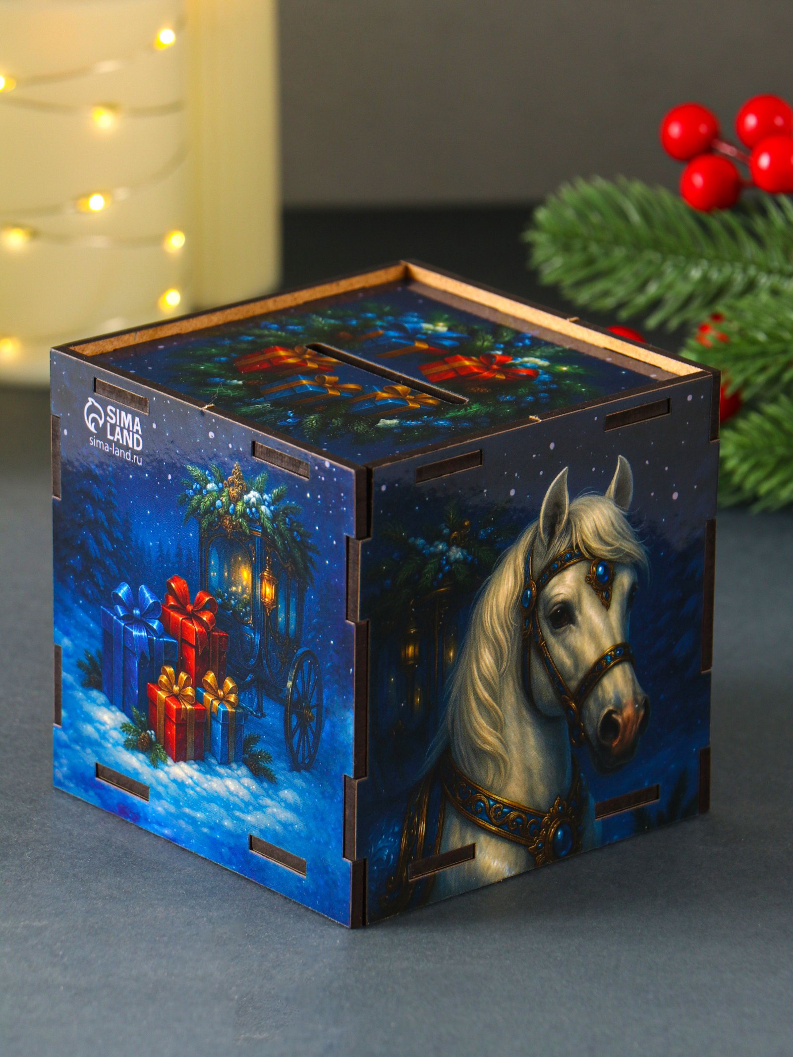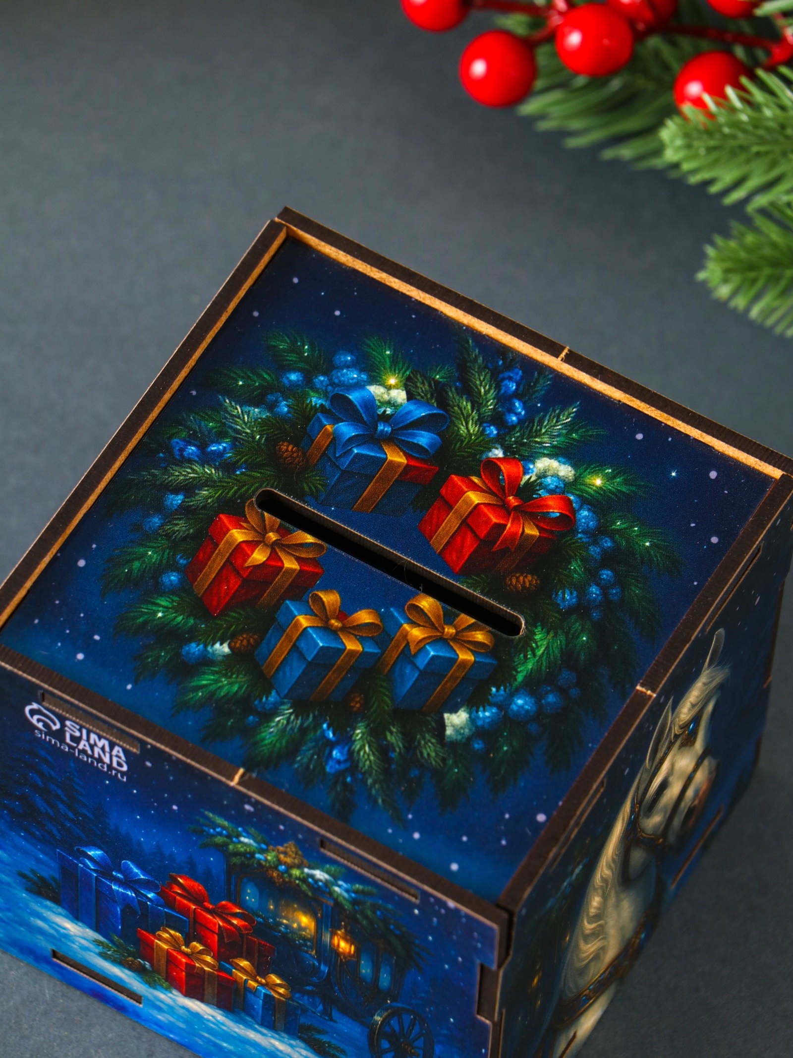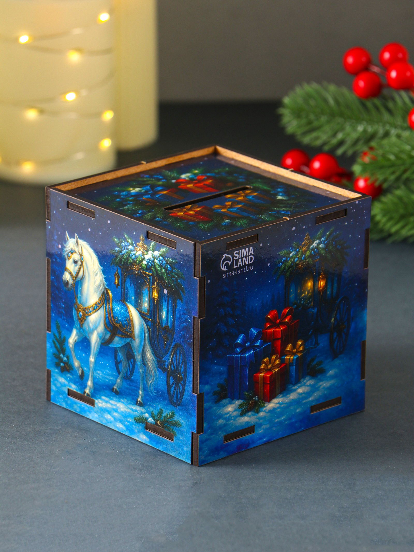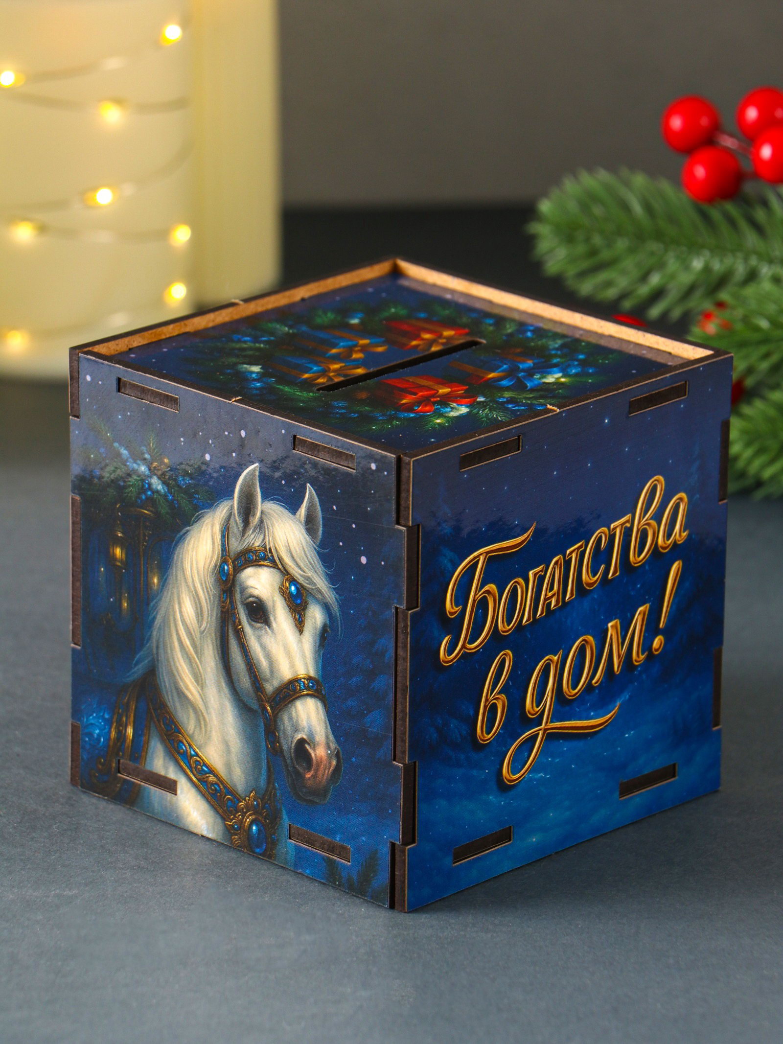 Деревянная копилка для денег "Богатства в дом. Новый год", куб, 10x10x10 см,, Россия
