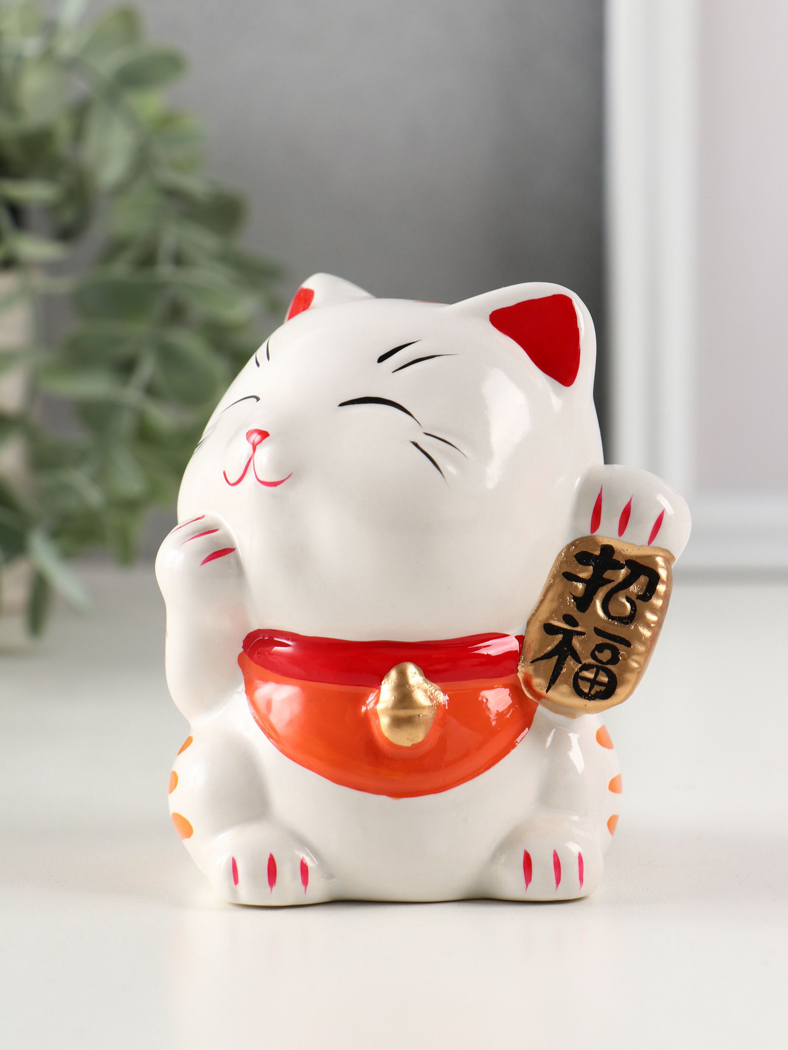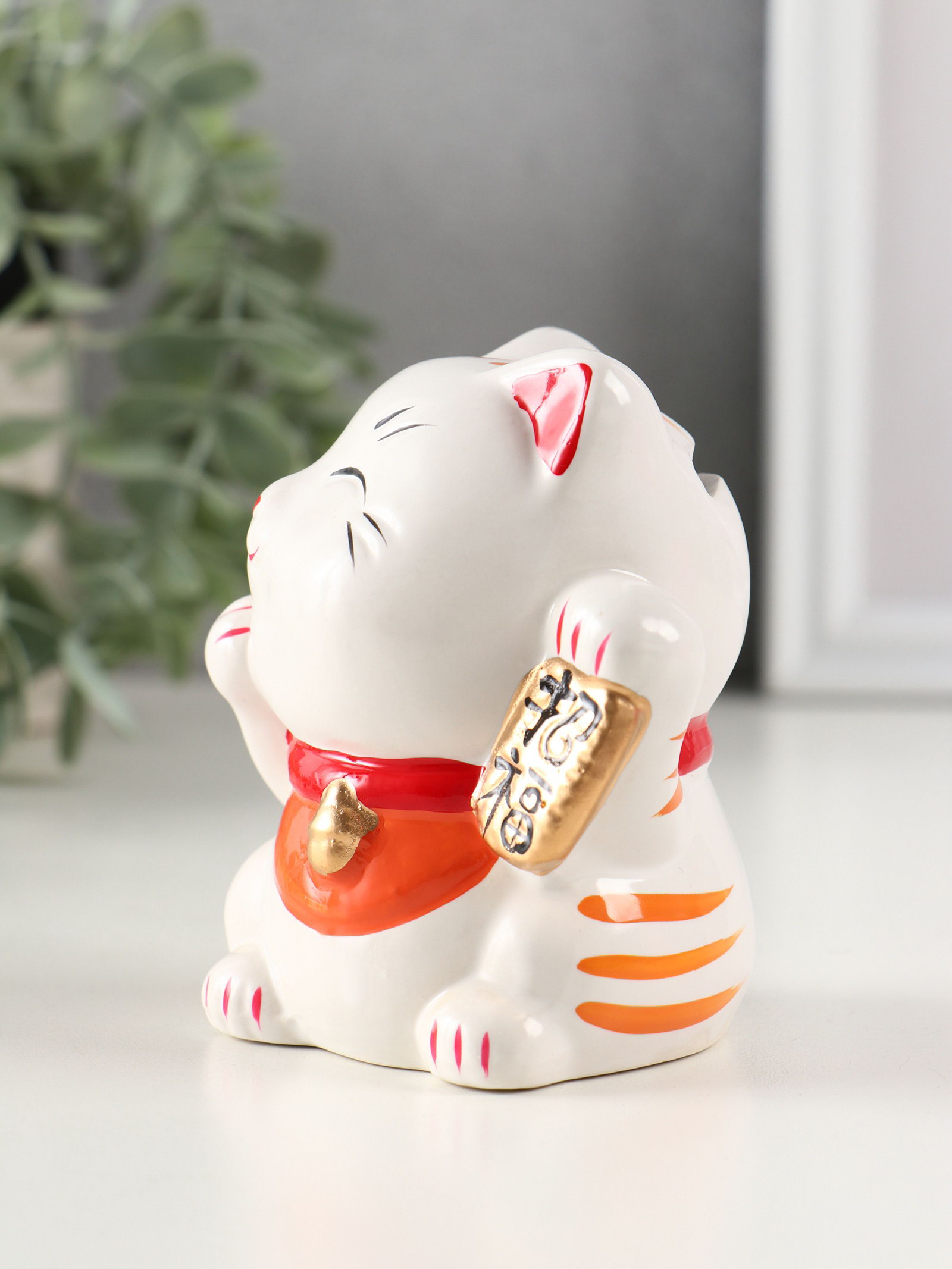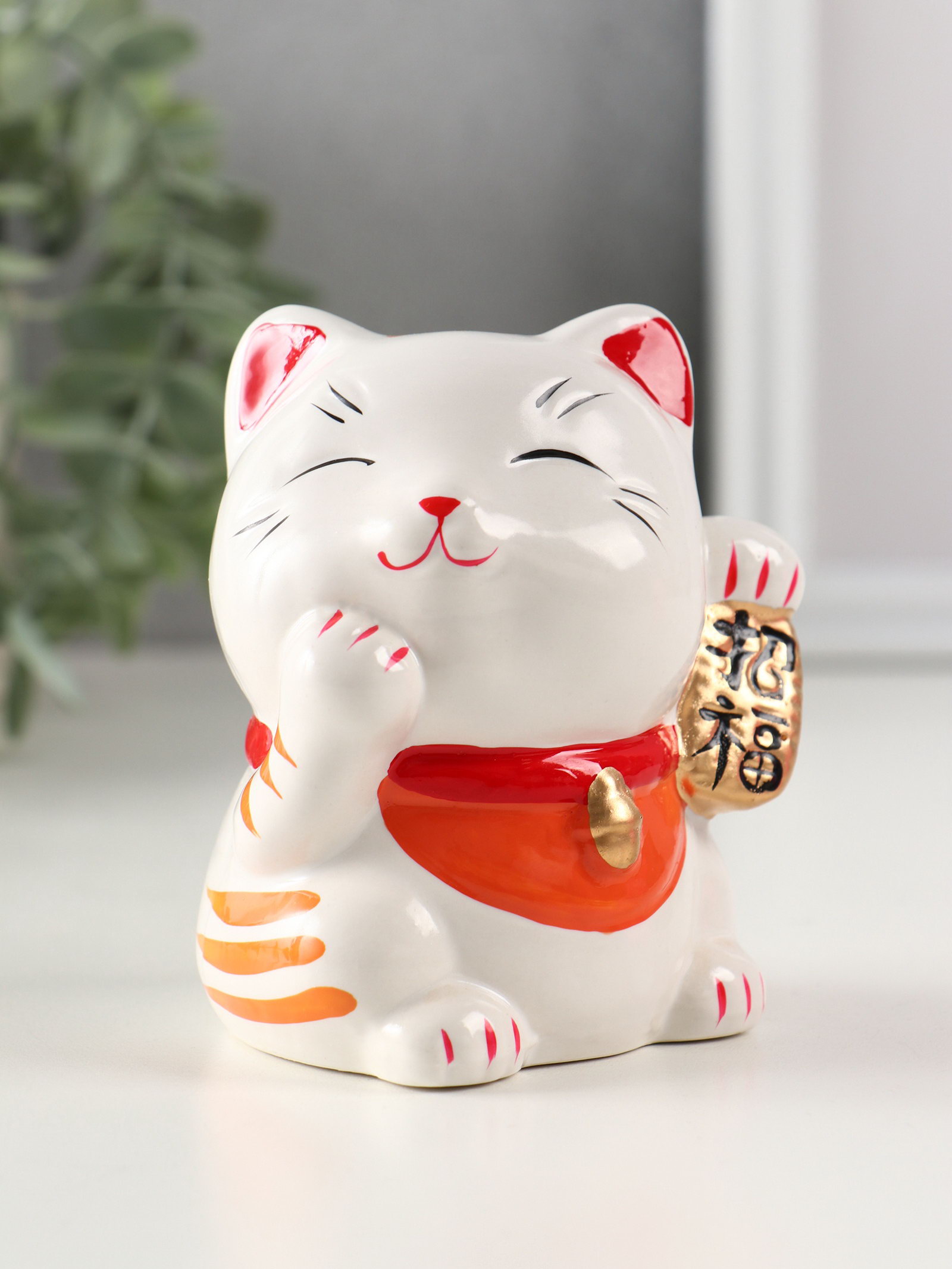 Копилка для денег "Манэки-нэко - иероглиф удача", керамика, оранж, 7.2x8.3x10 см, 8.3x7.2x10 см., Китай