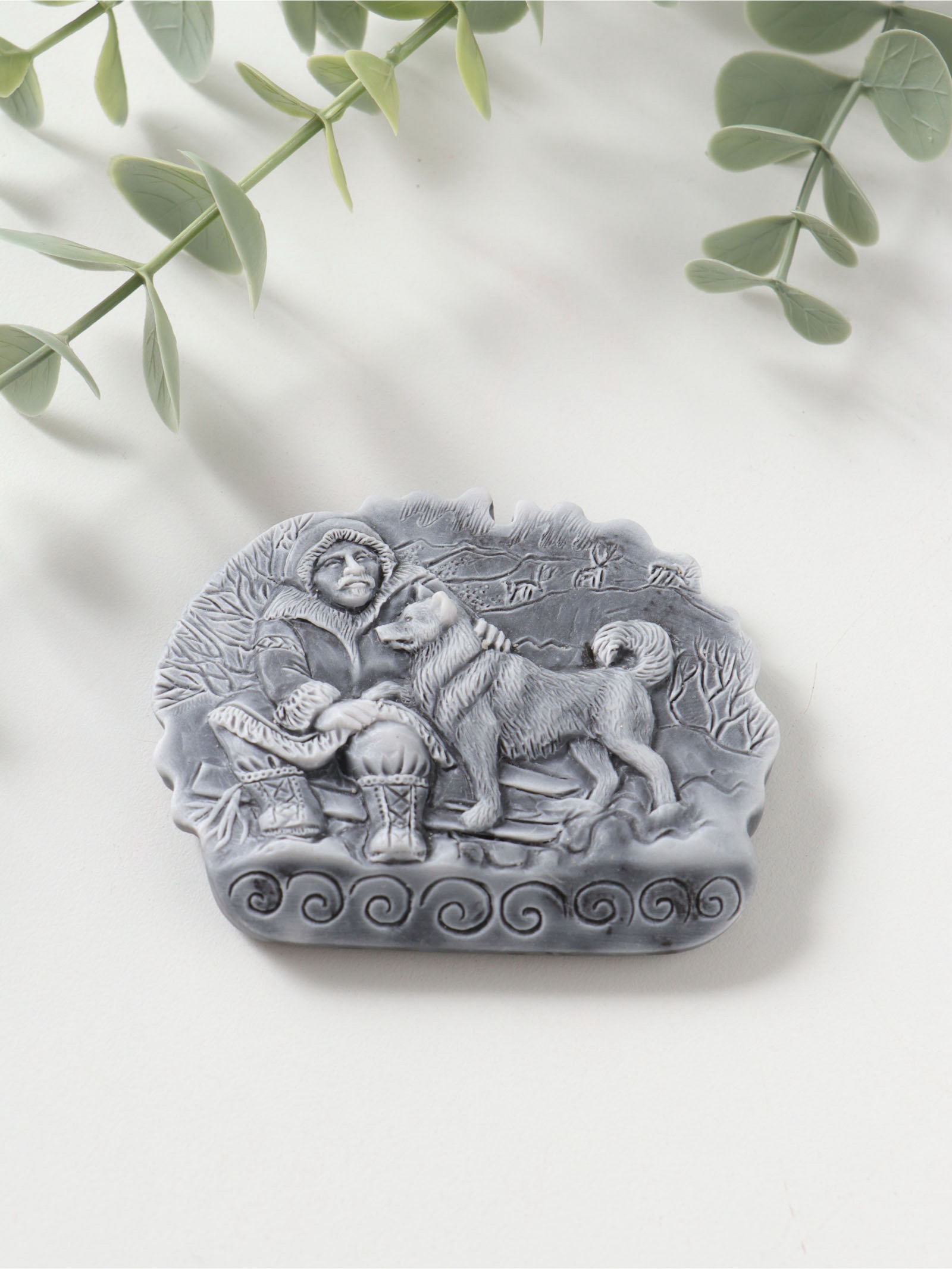 Магнит на холодильник "С хаски на санях", барельеф, 6.5 см, Сувениры из мраморной крошки, Россия