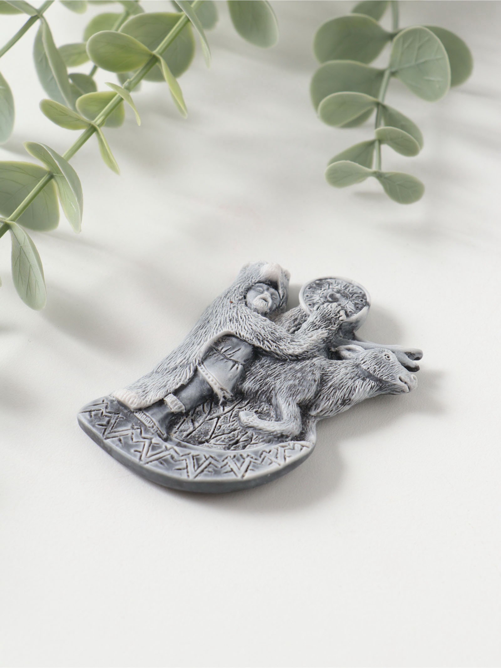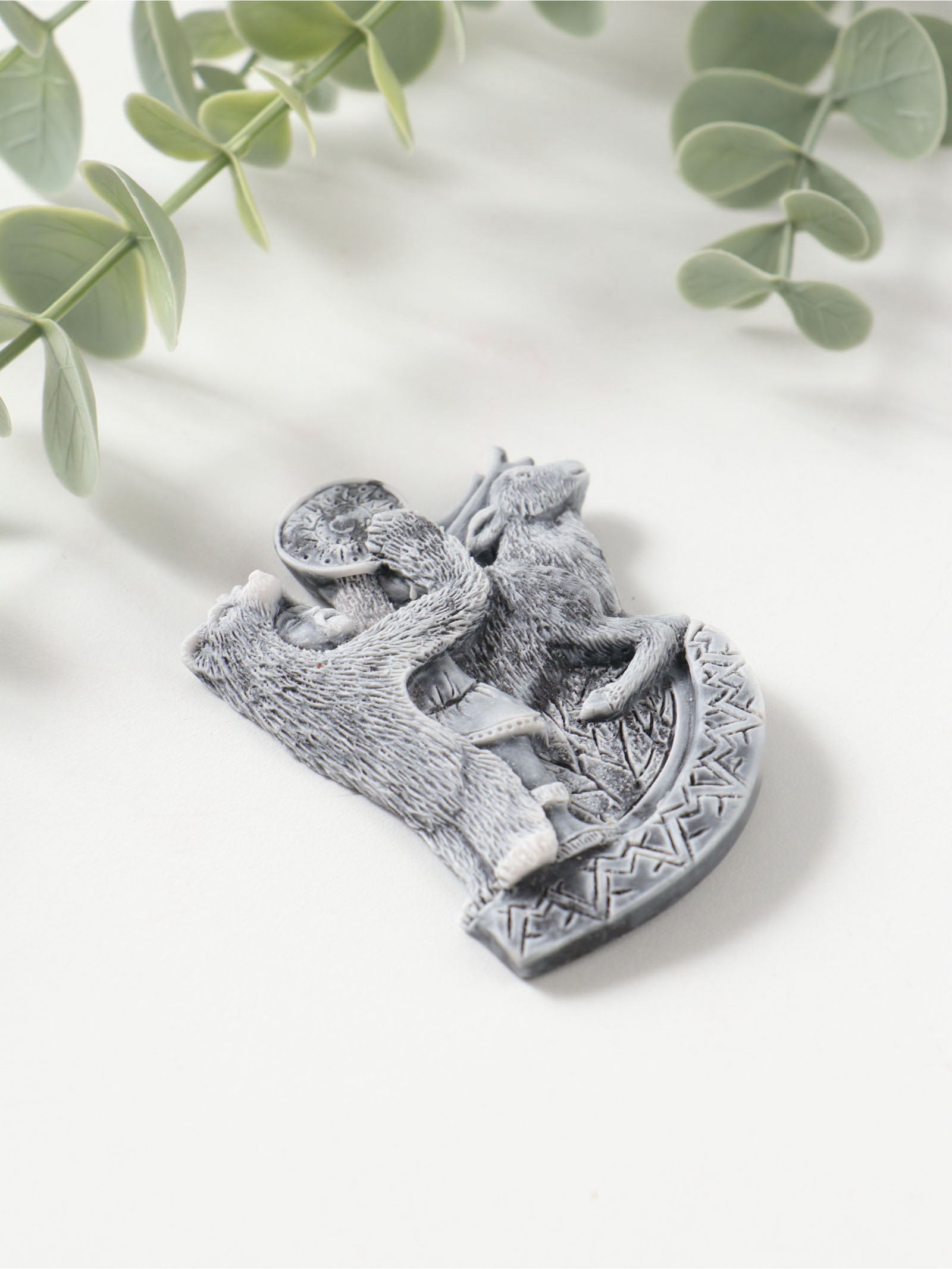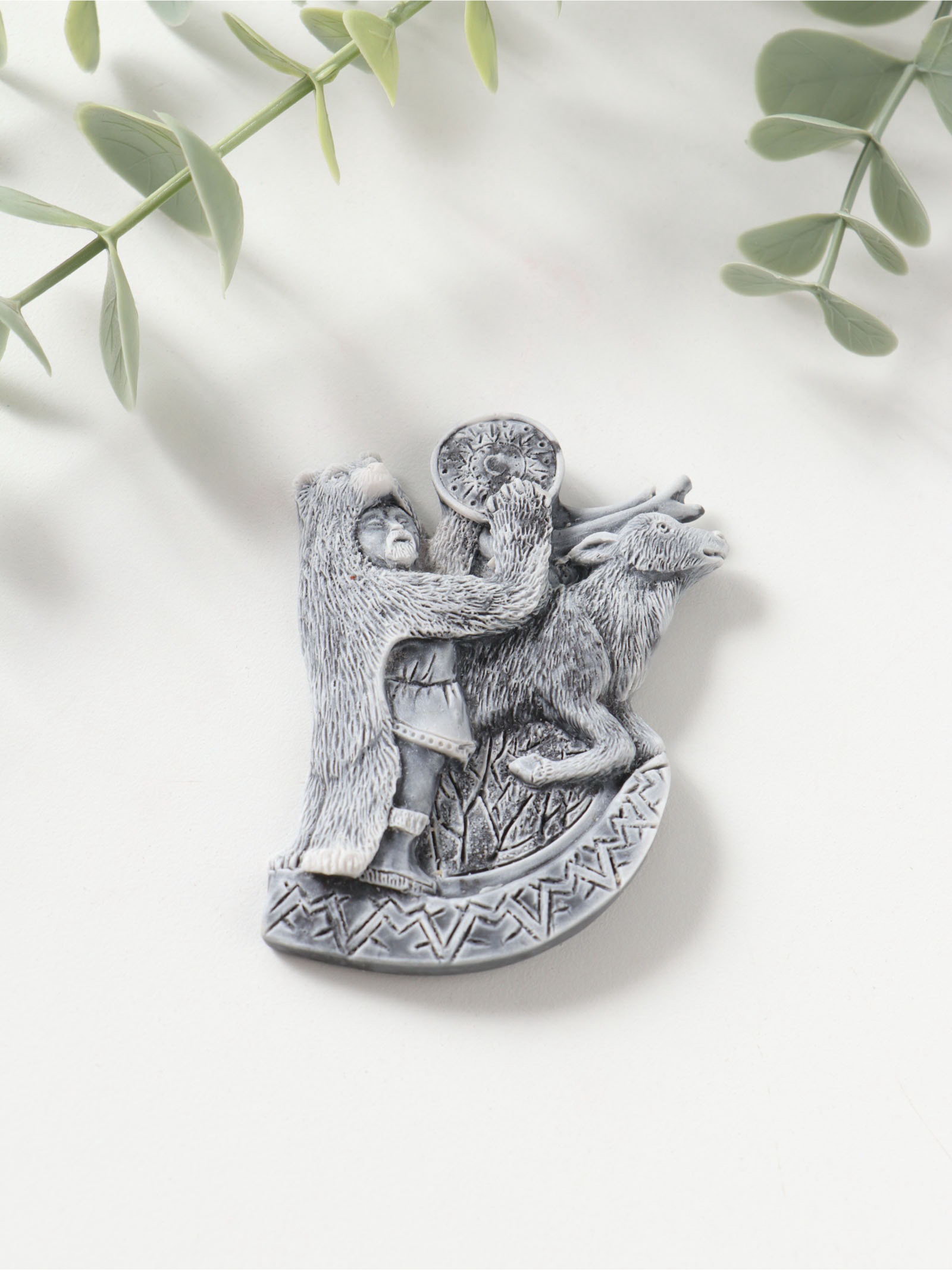 Магнит на холодильник "Шаман в шкуре медведя с бубном и олень", барельеф, 7.5 см, Сувениры из мраморной крошки, Россия