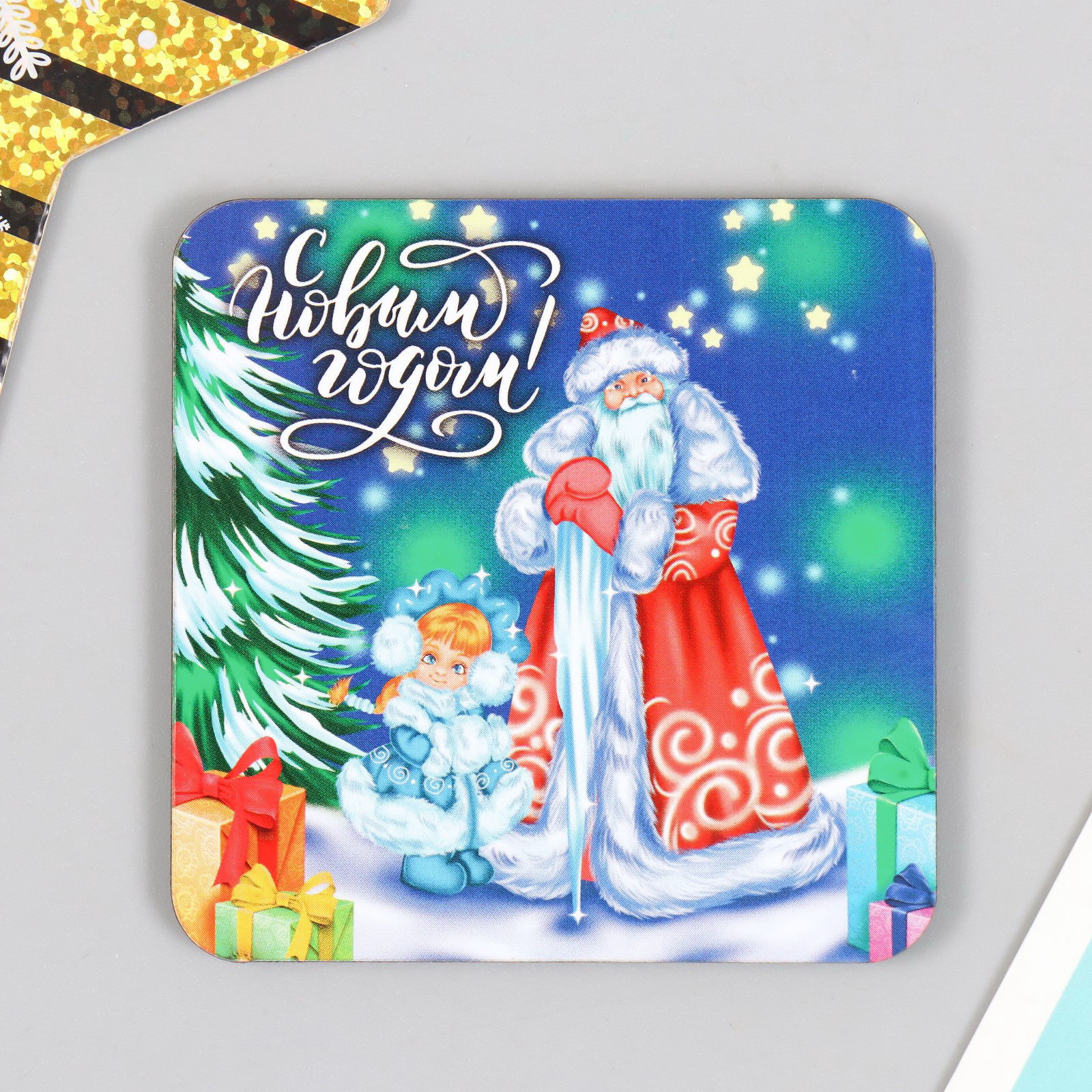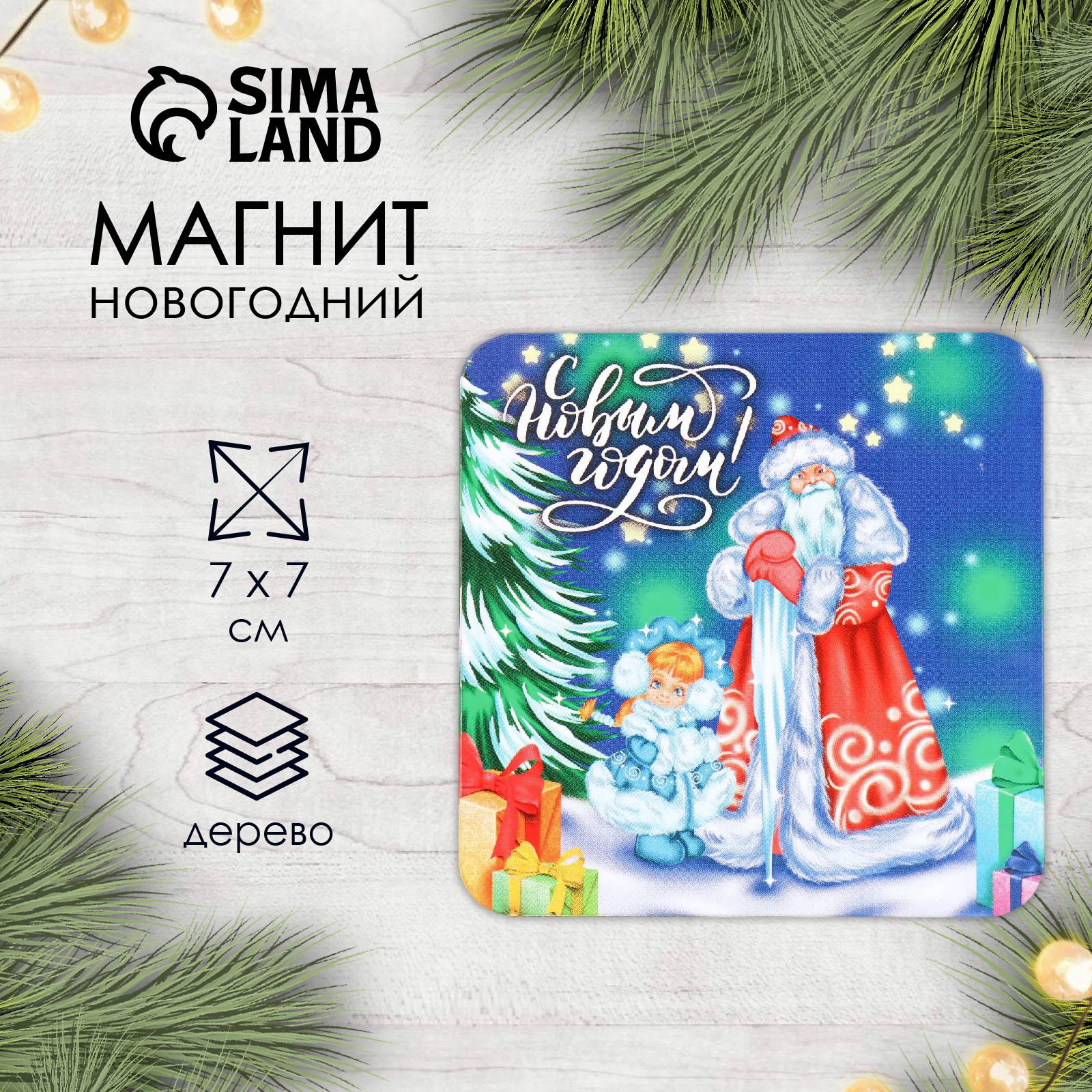 Новогодний магнит дерево "Дед Мороз и Снегурочка" 7х7 см, Россия