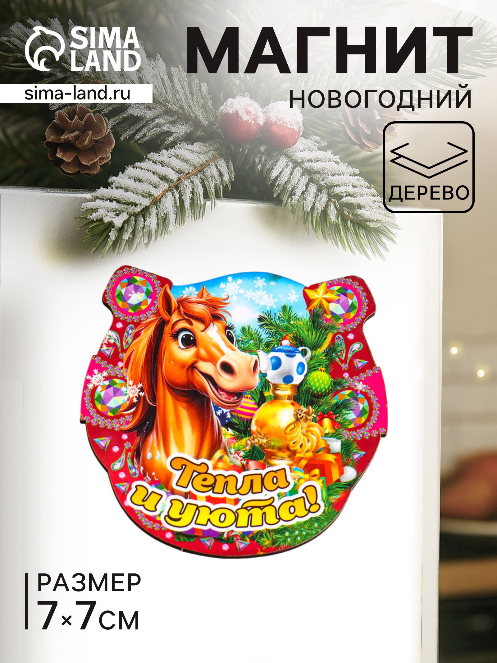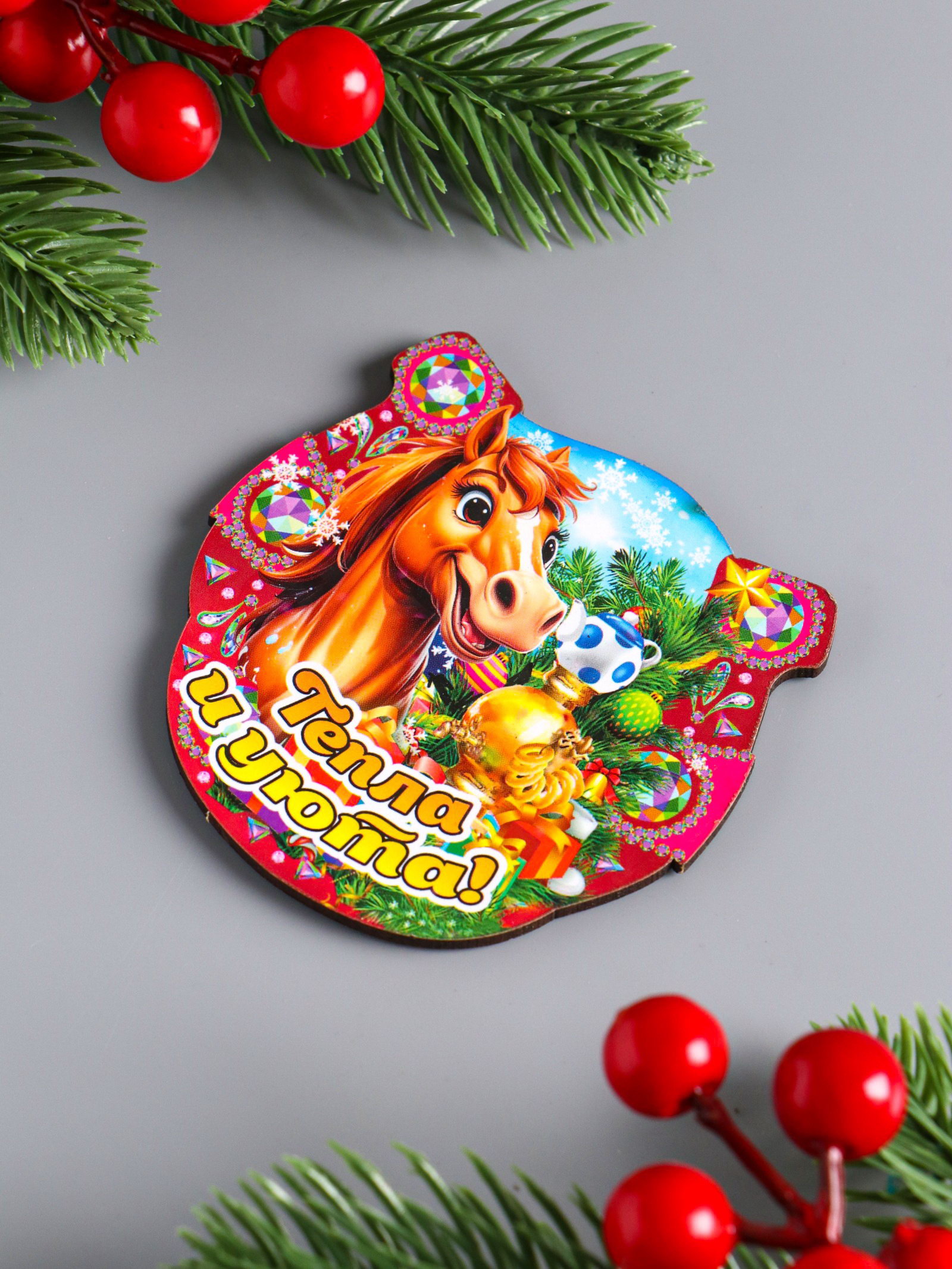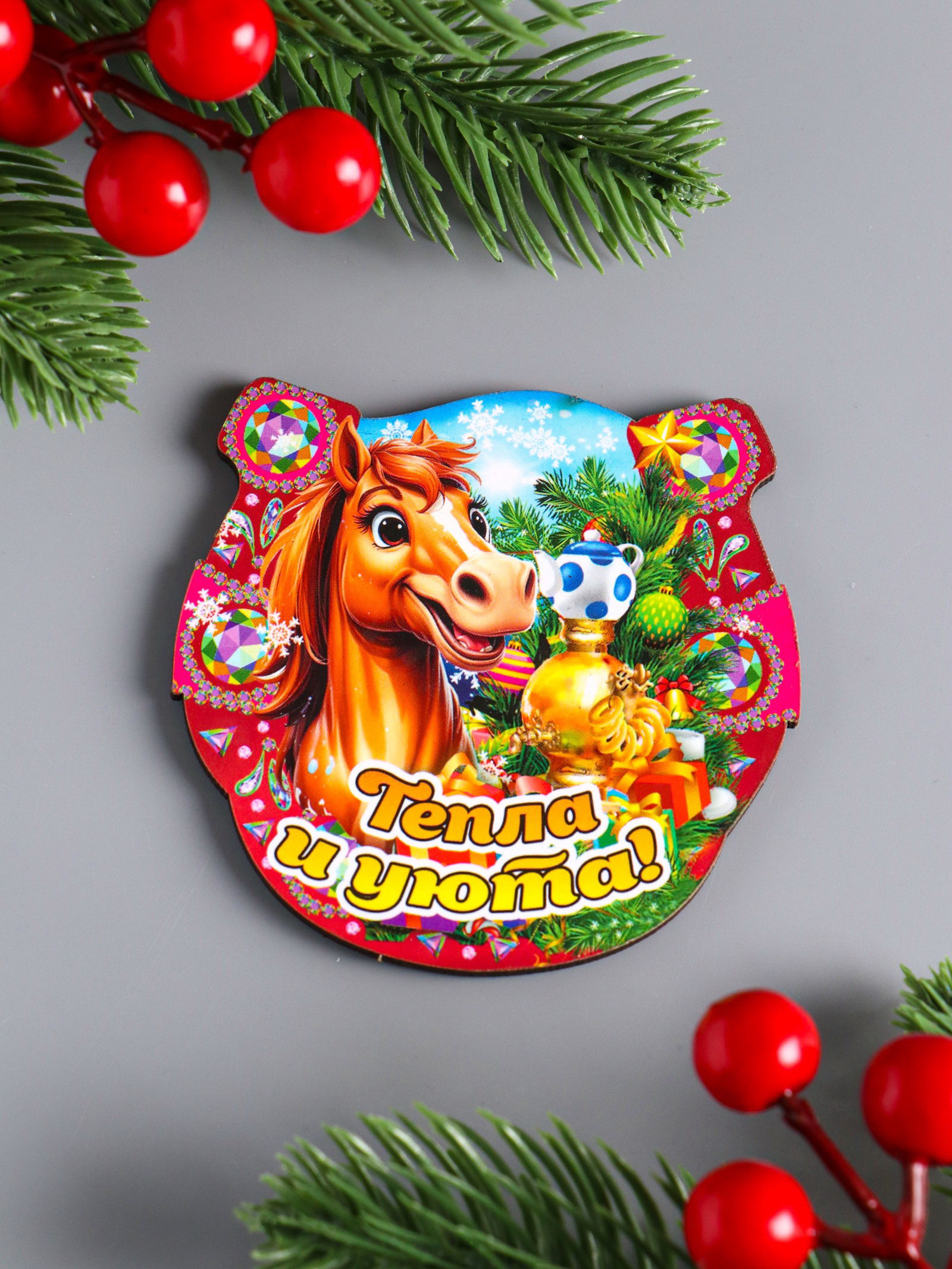 Магнит на холодильник "Новогодняя подкова с конём. Тепла и уюта", 7x7 см, Дарим Красиво, Россия