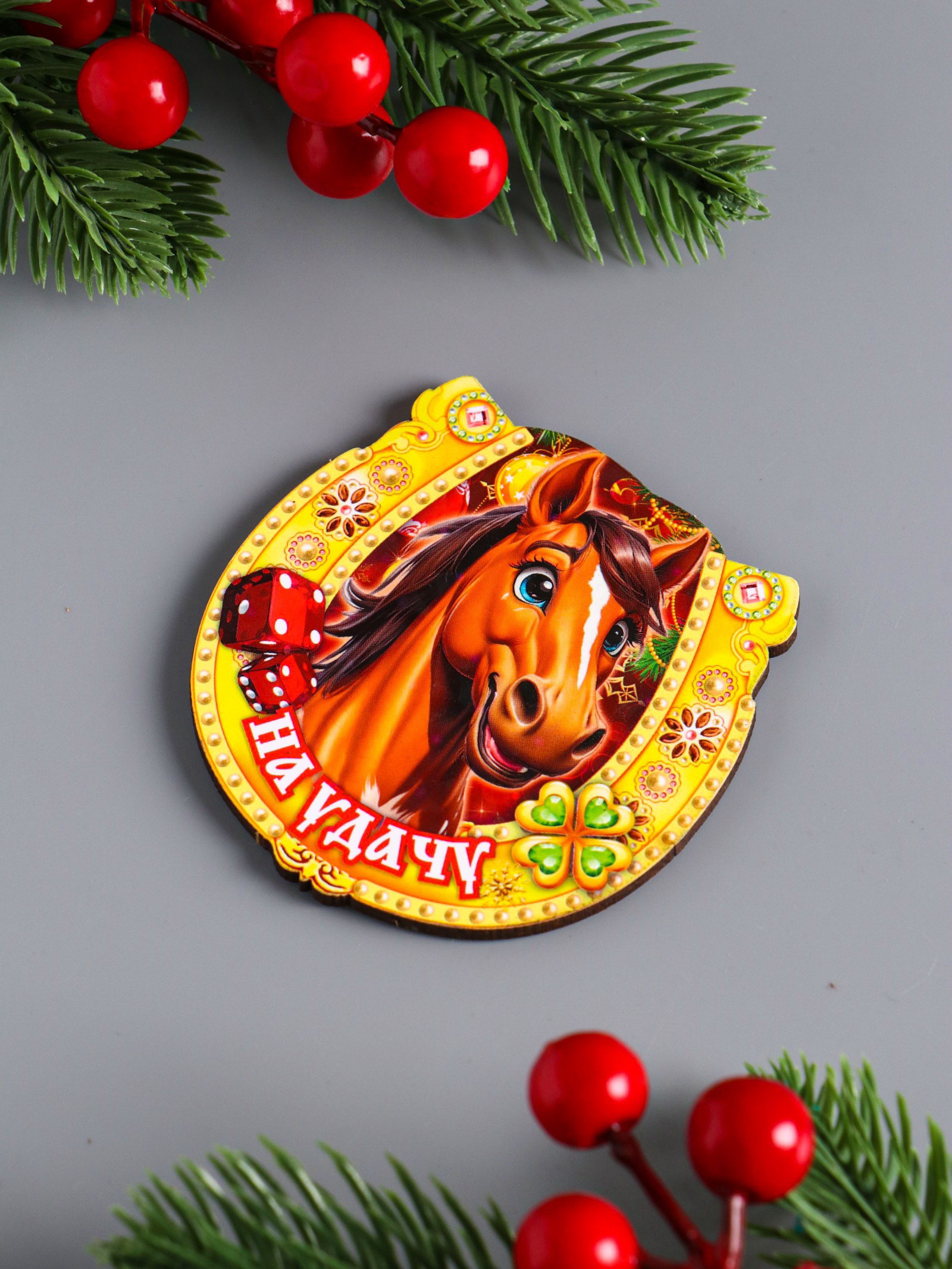 Магнит на холодильник "Новогодняя подкова с конём. На удачу", 7x7 см, Дарим Красиво, Россия