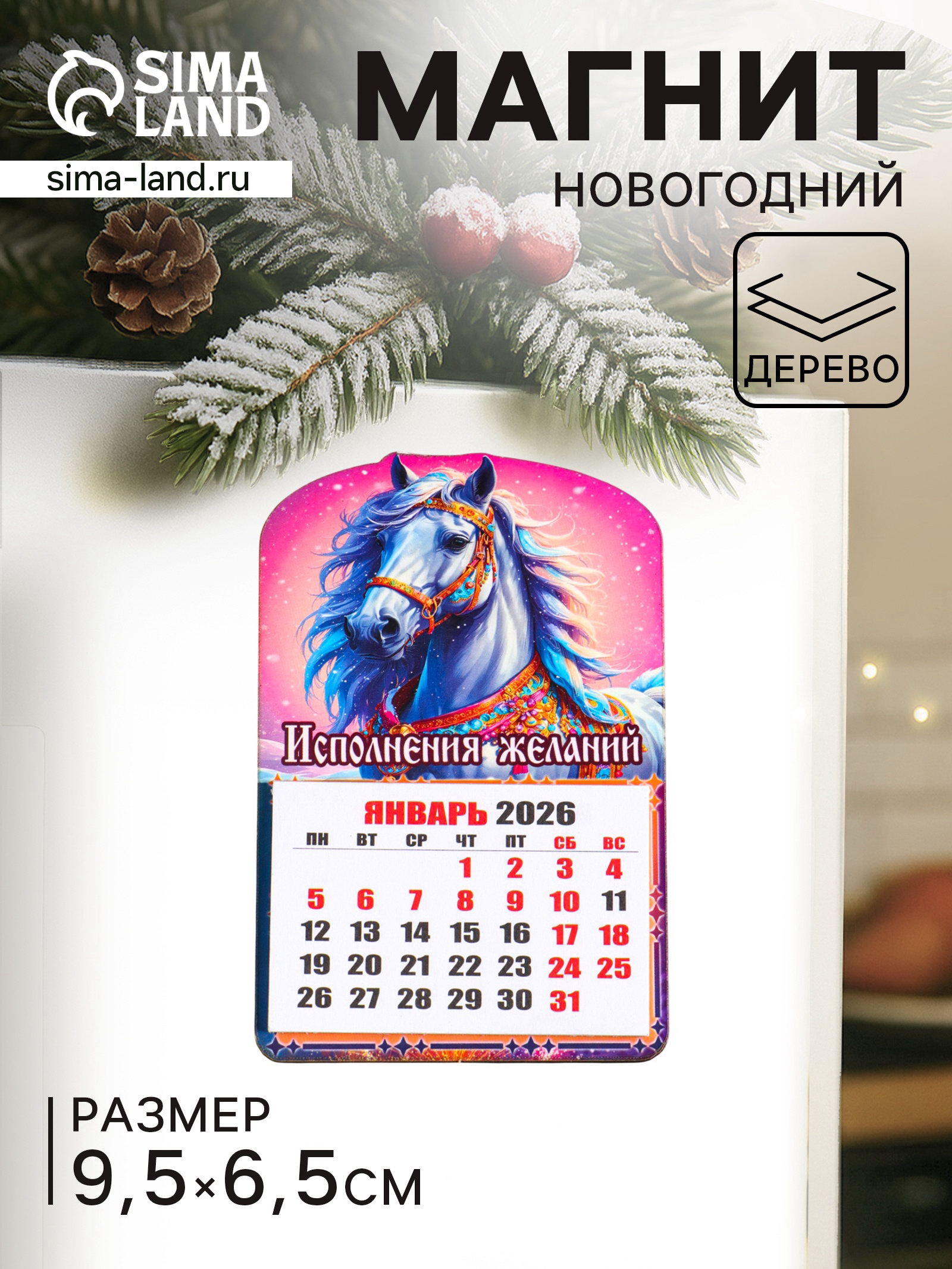 Вид: На магните, Отрывные Размер упаковки: 6.5 x 0.4 x 9.5 см. tnved: 4420190000 Температурное ограничение: Нет Символ года: Символ года 2026 (Лошадь) Тематика: Животный мир Встречайте 2026 год с символом удачи! Новогодний магнит-календарь "Конь исполнения желаний" это деревянный талисман и практичный органайзер для вашего холодильника. Он создает праздничное настроение и помогает легко следить за временем.