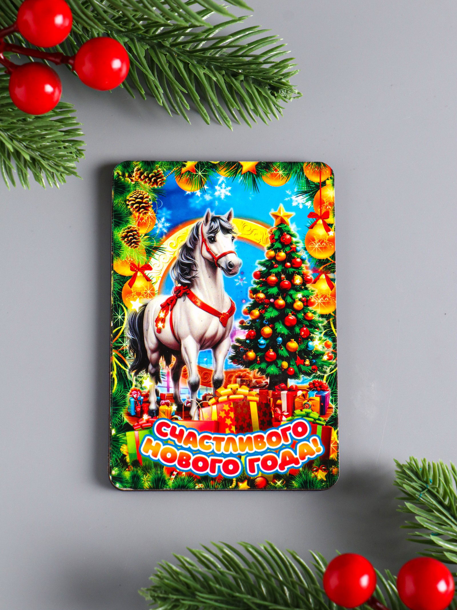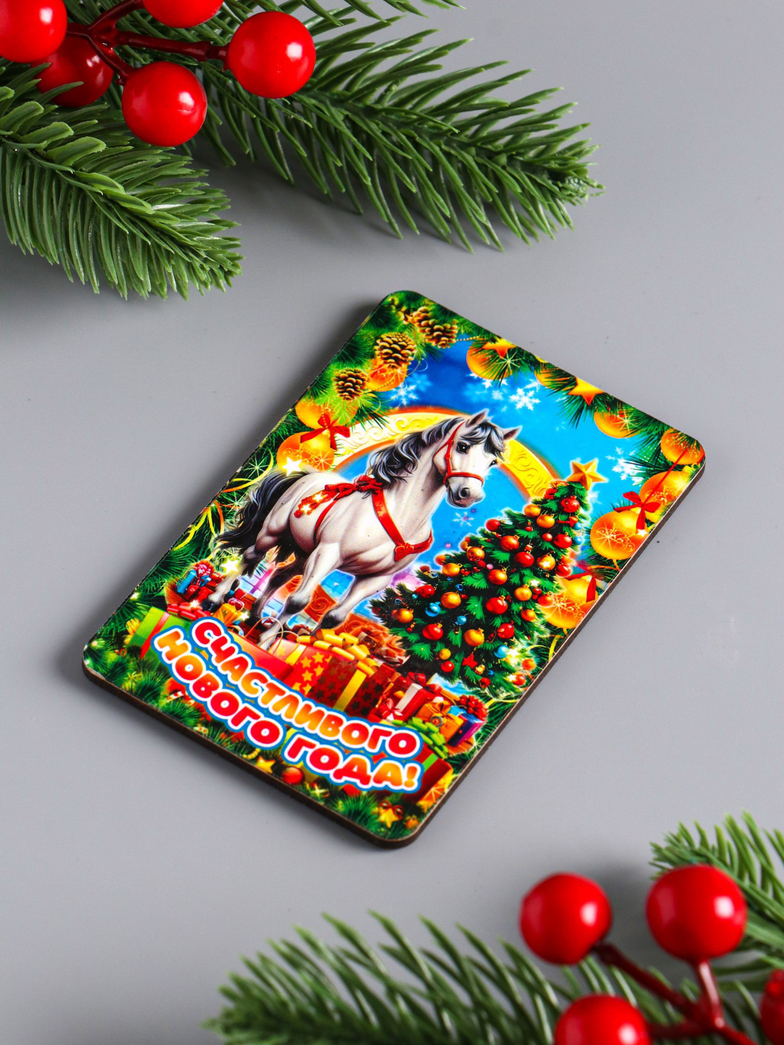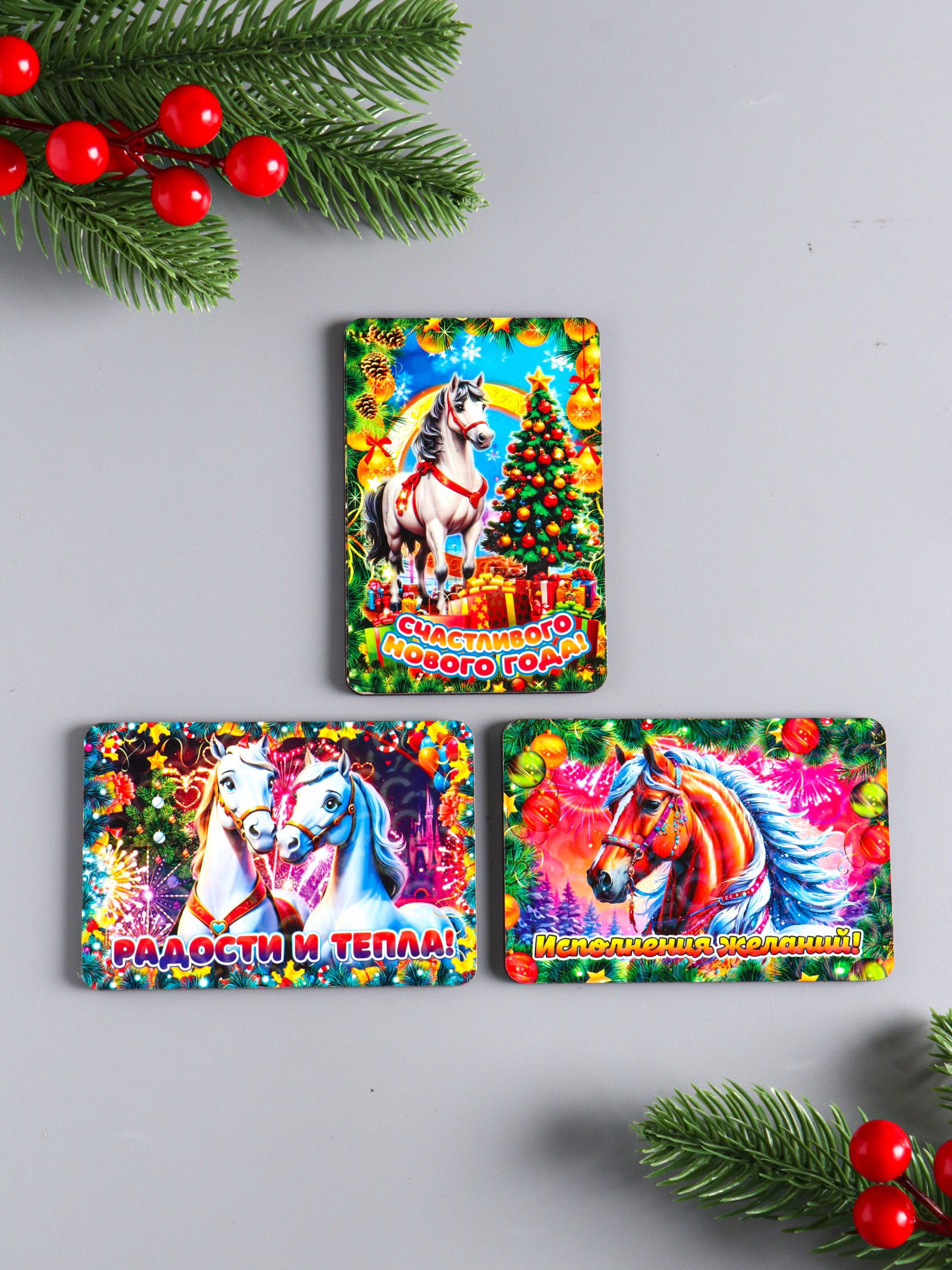 Набор магнитов на холодильник 3 шт. "Конь новогодний: Радости и тепла, исполнения желаний, счастливого НГ", 9.5x6.5 см, Дарим Красиво, Россия