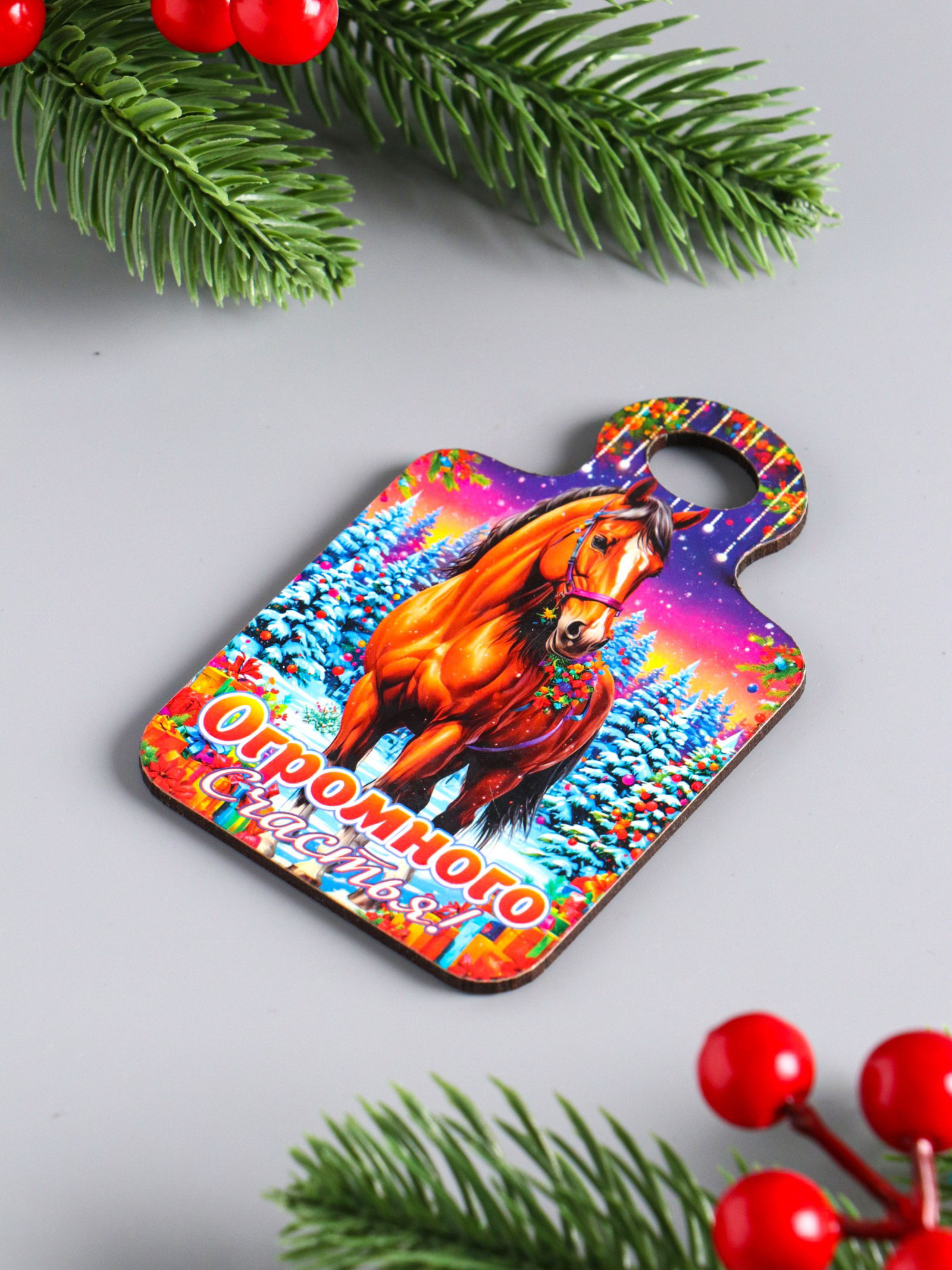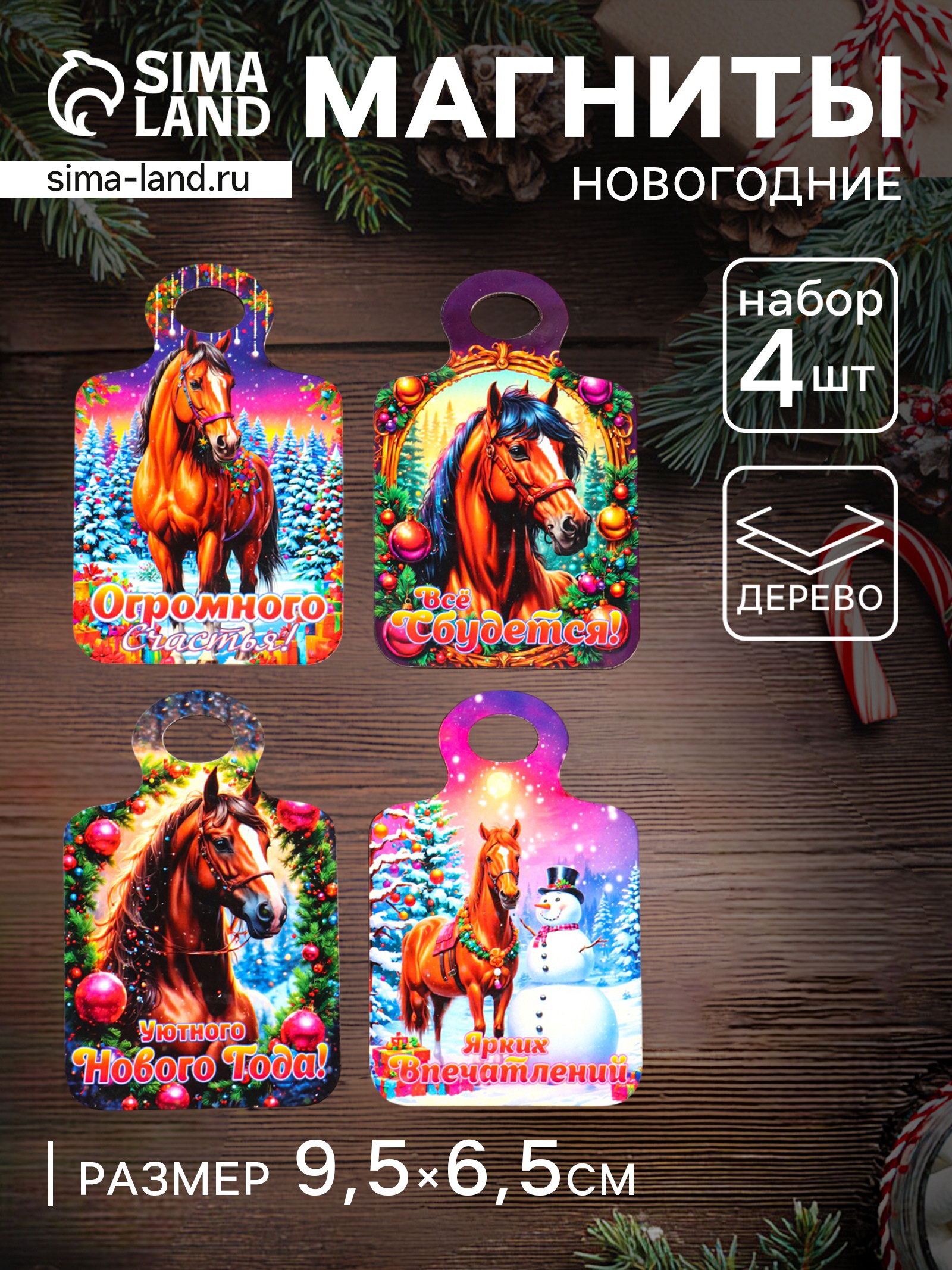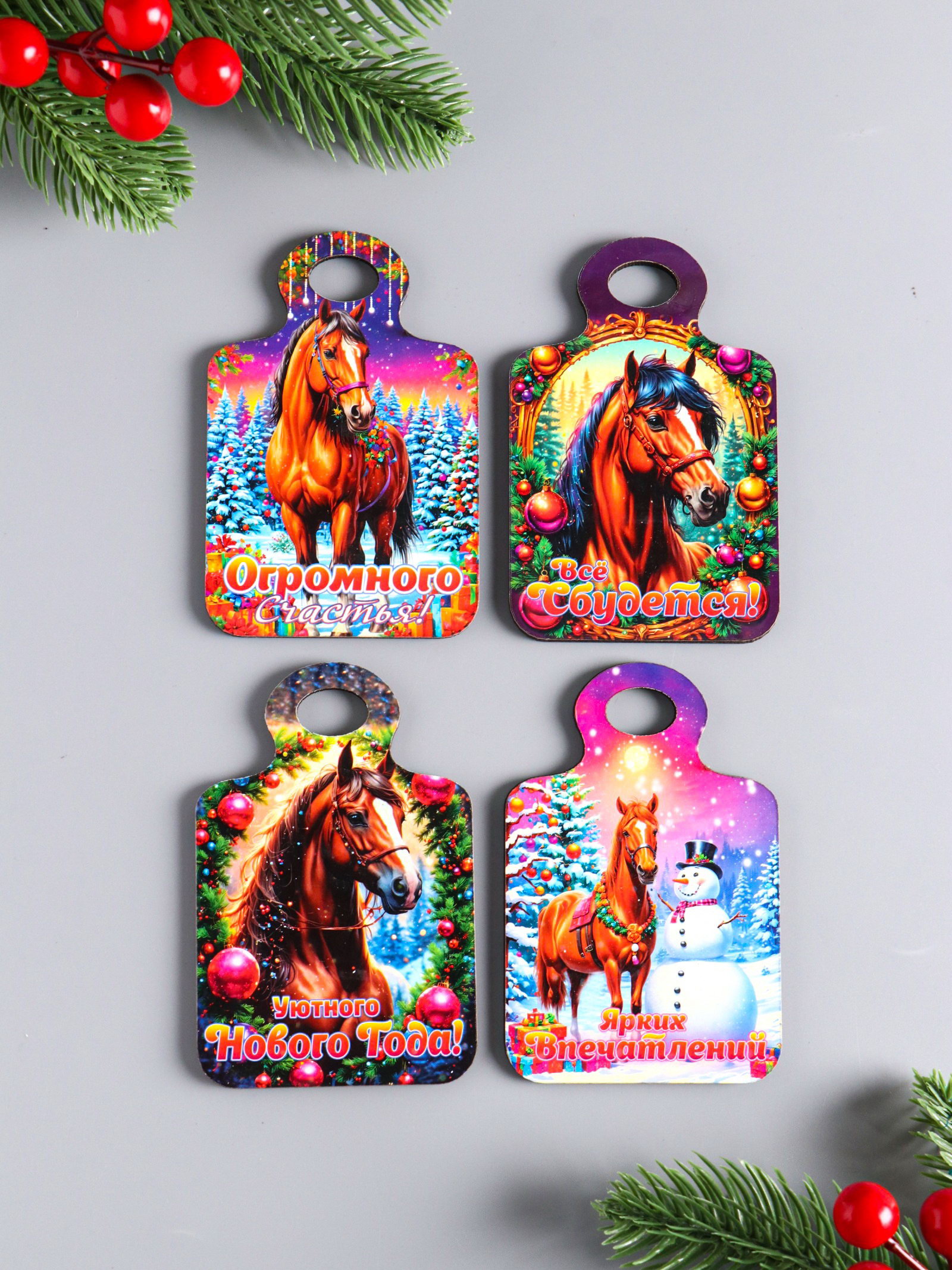 Набор магнитов на холодильник 4 шт. "Доска разделочная с конём: Огромного счастья, всё сбудется, ярких впечатлений", Дарим Красиво, Россия