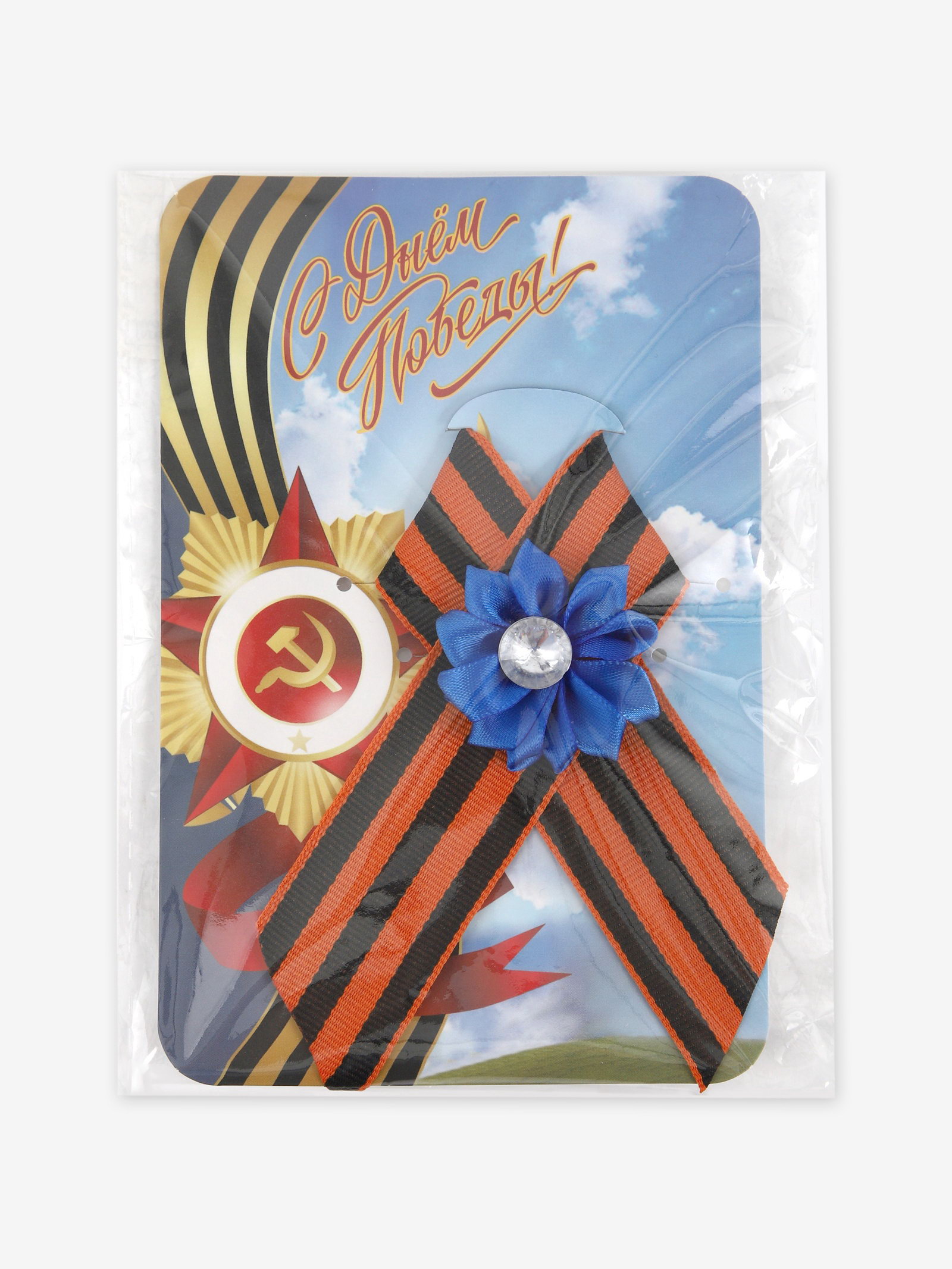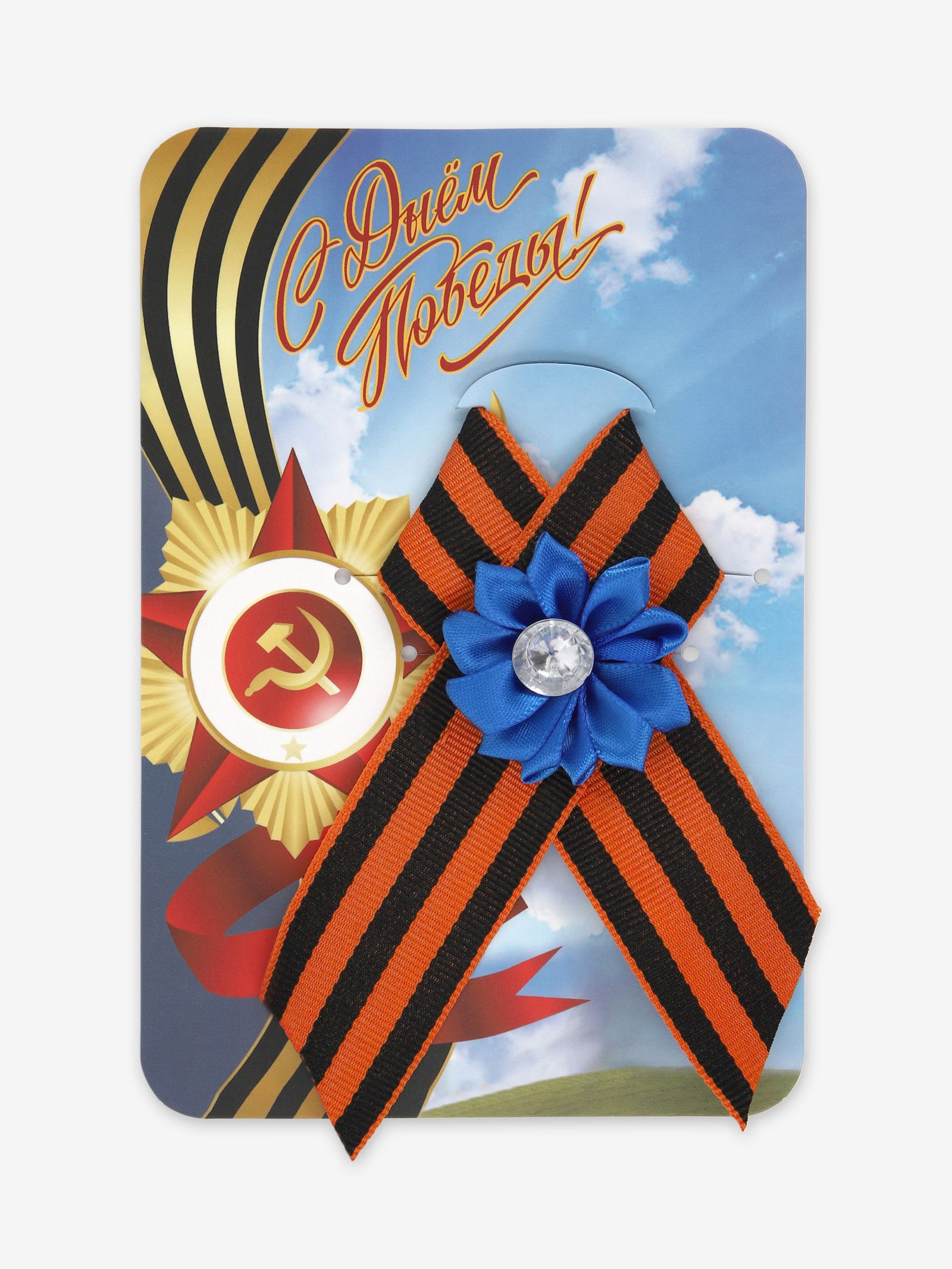 Георгиевская лента на 9 мая "С Днём Победы", с булавкой и синим цветком, 10x15x1 см., Китай