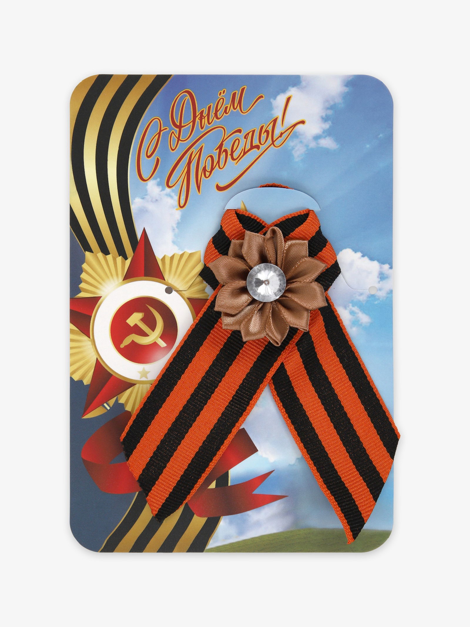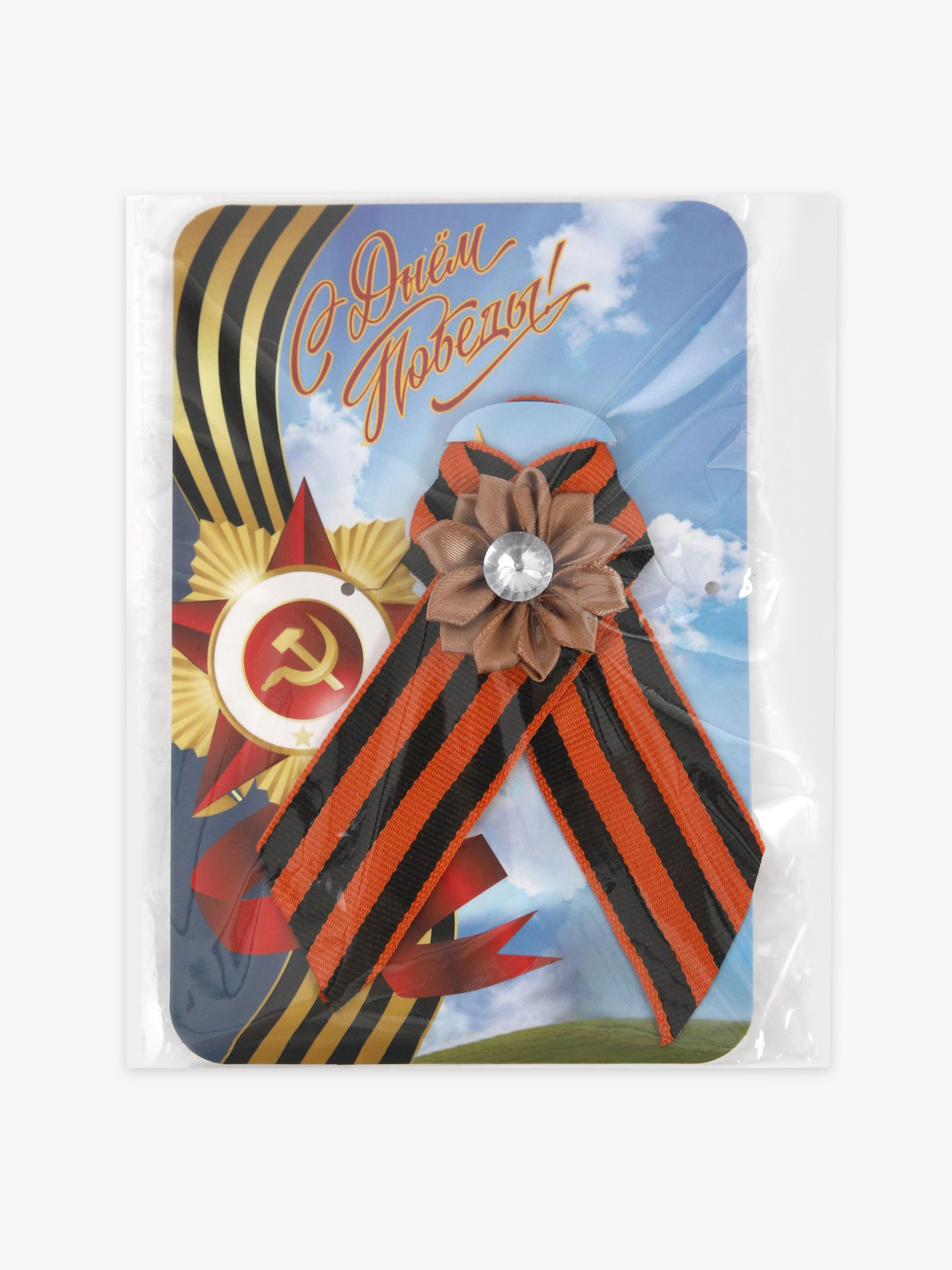 Георгиевская лента на 9 мая "С Днём Победы", на магните, коричневый цветок, 10x15x1 см., Китай