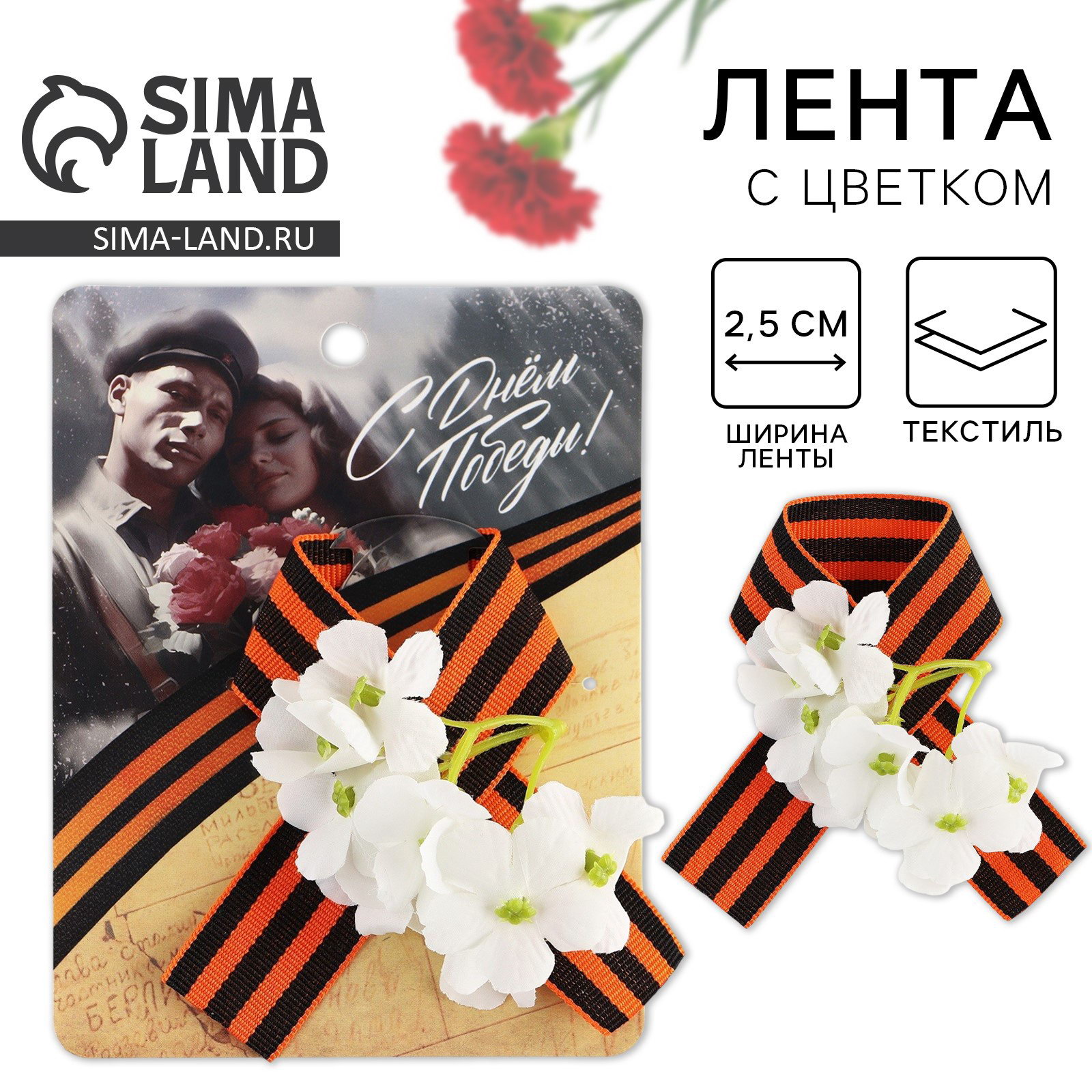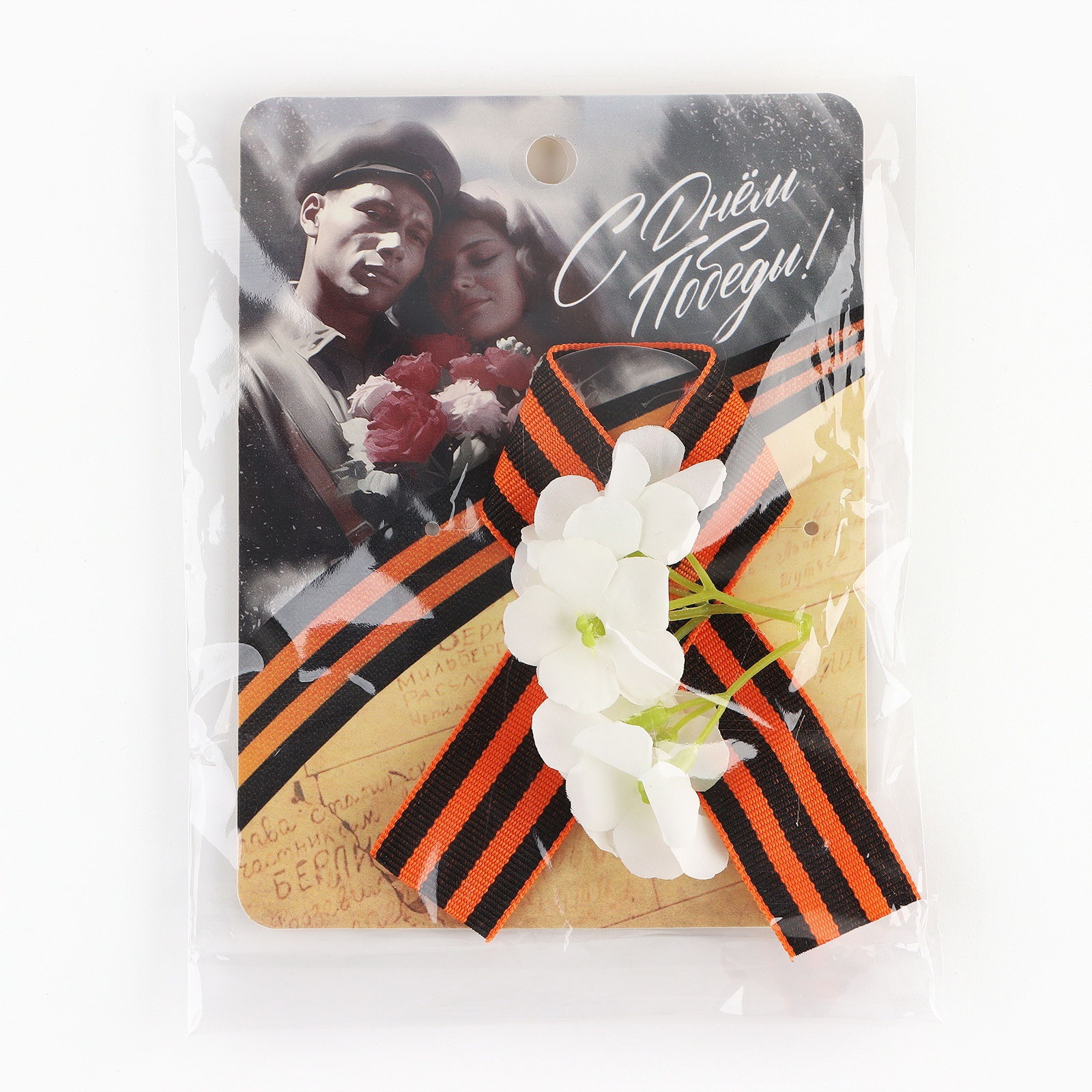 Георгиевская лента, с цветком на 9 мая "С Днем Победы", 10.5x14 см, 6x2x12 см., Сима-ленд, Китай