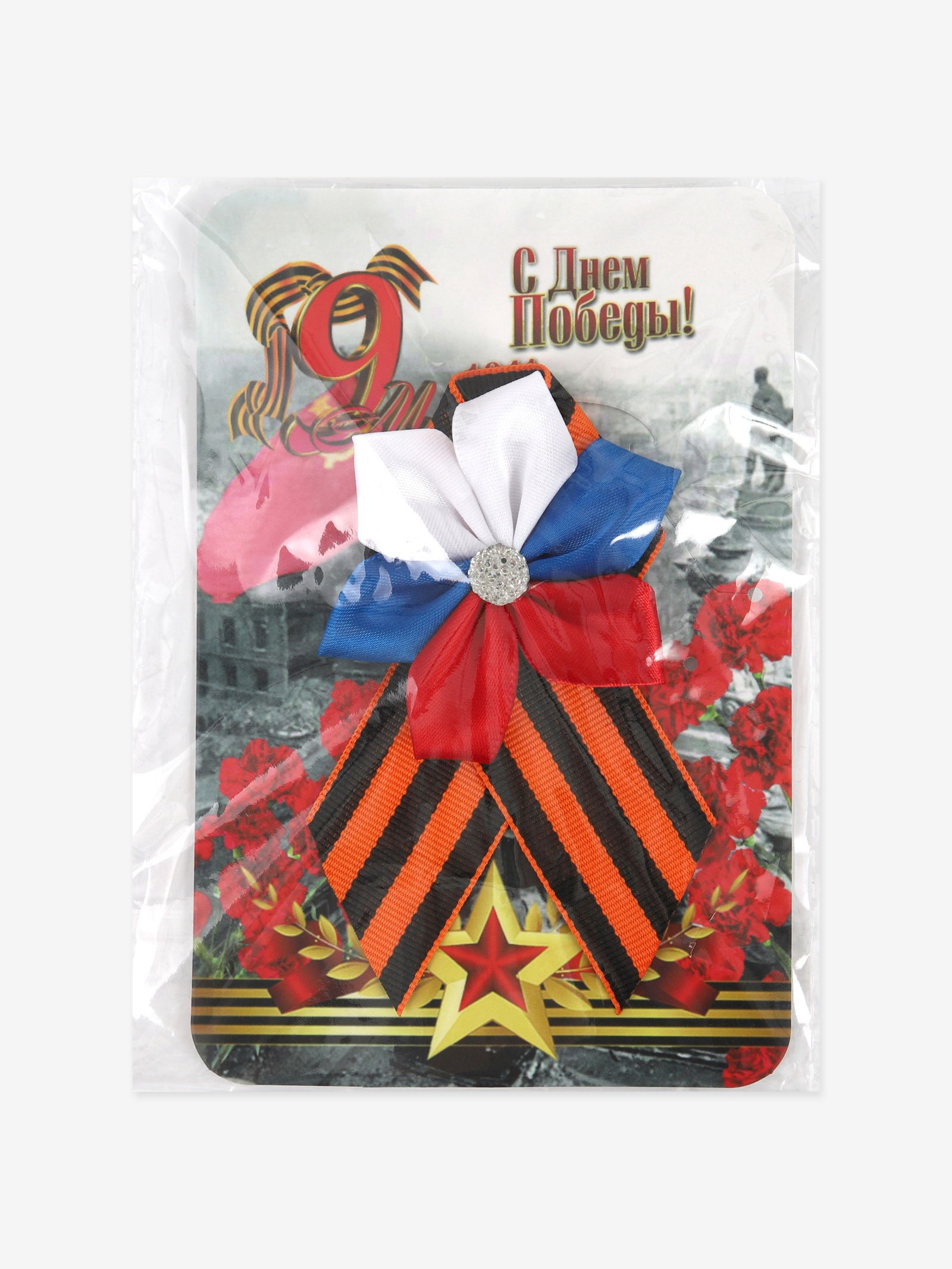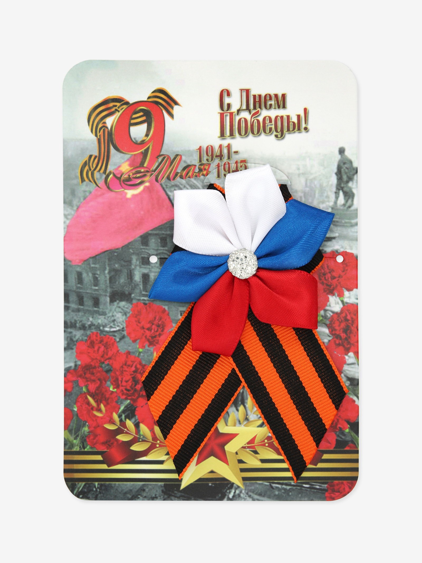 Георгиевская лента на 9 мая "С Днём Победы", с цветком триколор, 10x15x1 см., Китай