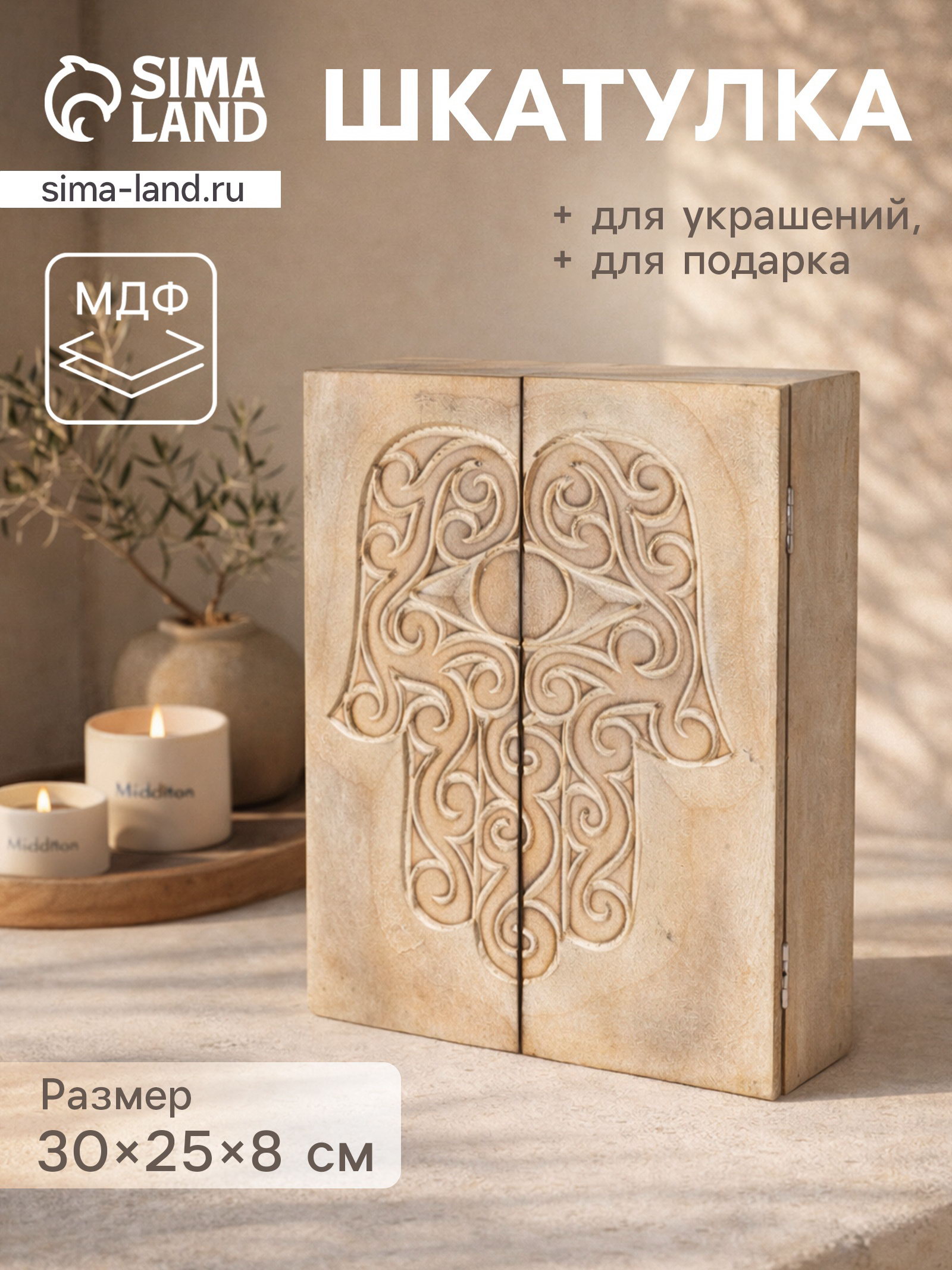 Размер упаковки: 8 x 25 x 30 см. tnved: 4420910000 Форма: Прямоугольная Тематика: Фэншуй Тематика праздника: Универсальная тематика Вид дерева: МДФ Особенности шкатулки: Для украшений Цвет: Бежевый Ширина, см: 25 Покрытие: Без покрытия Длина, см: 30 Высота, см: 8 Набор: Нет Шкатулка "Хамса" вместительная бежевая коробочка с символом защиты и гармонии. Её крупный формат и выгравированная ладонь хамсы превращают хранение украшений в осознанный ритуал: не просто убрать, а поместить в пространство, где забота и энергия часть повседневности. Без покрытия, с матовой текстурой дерева, она выглядит скромно, но говорит уверенно. Особенности