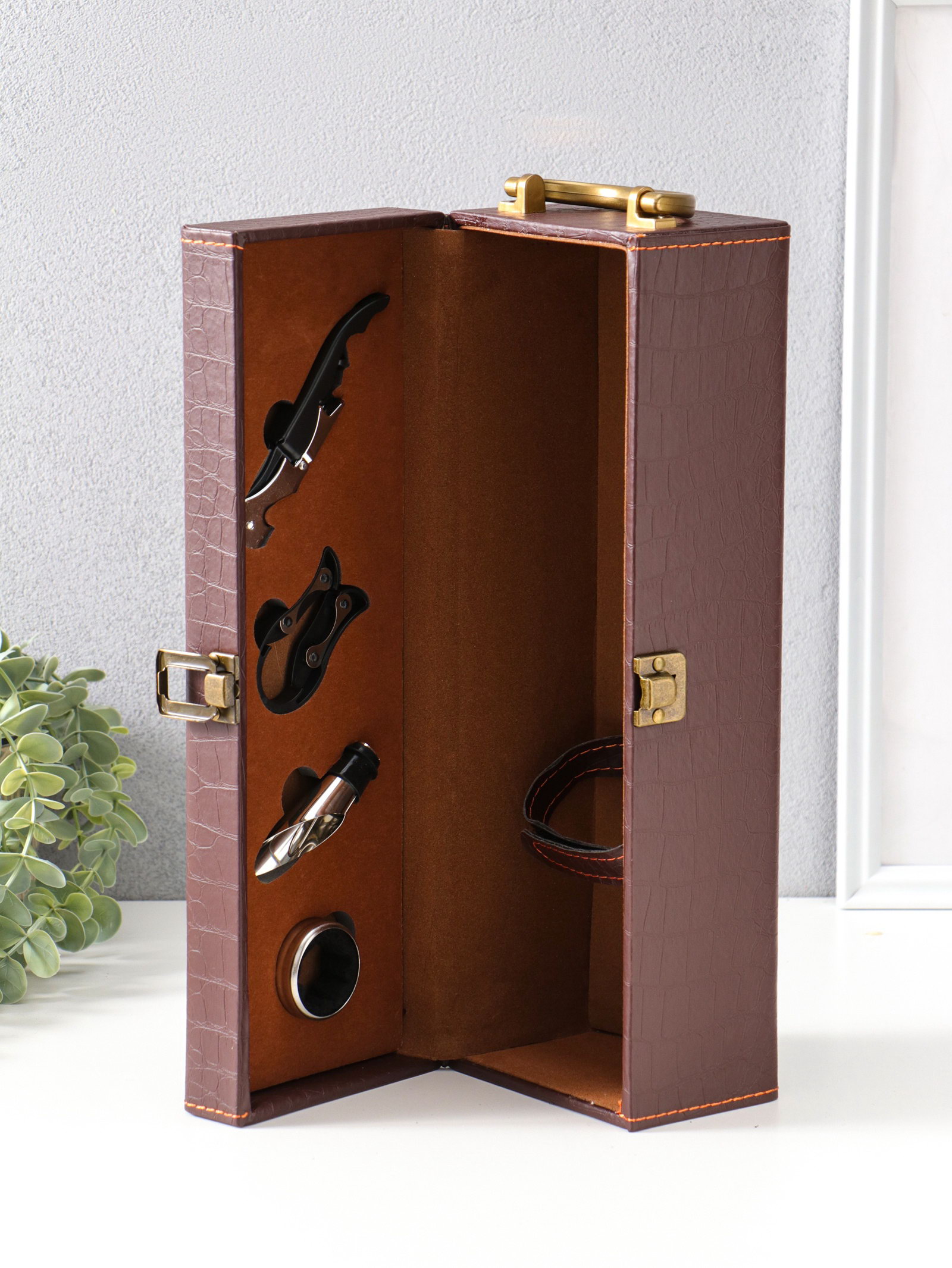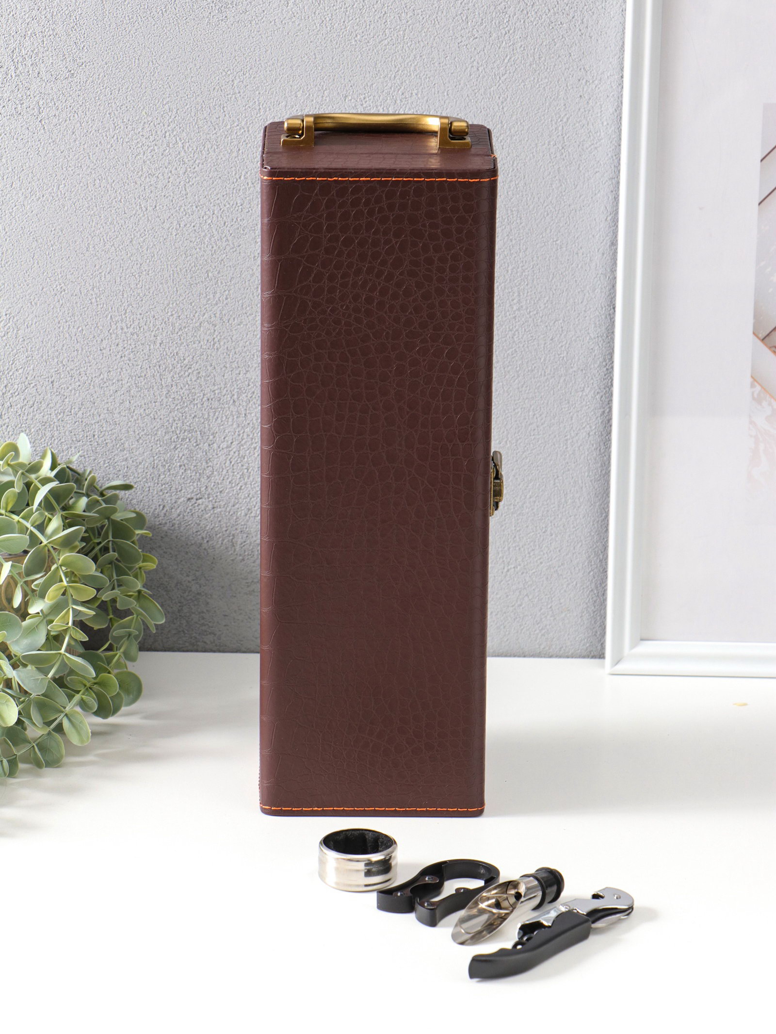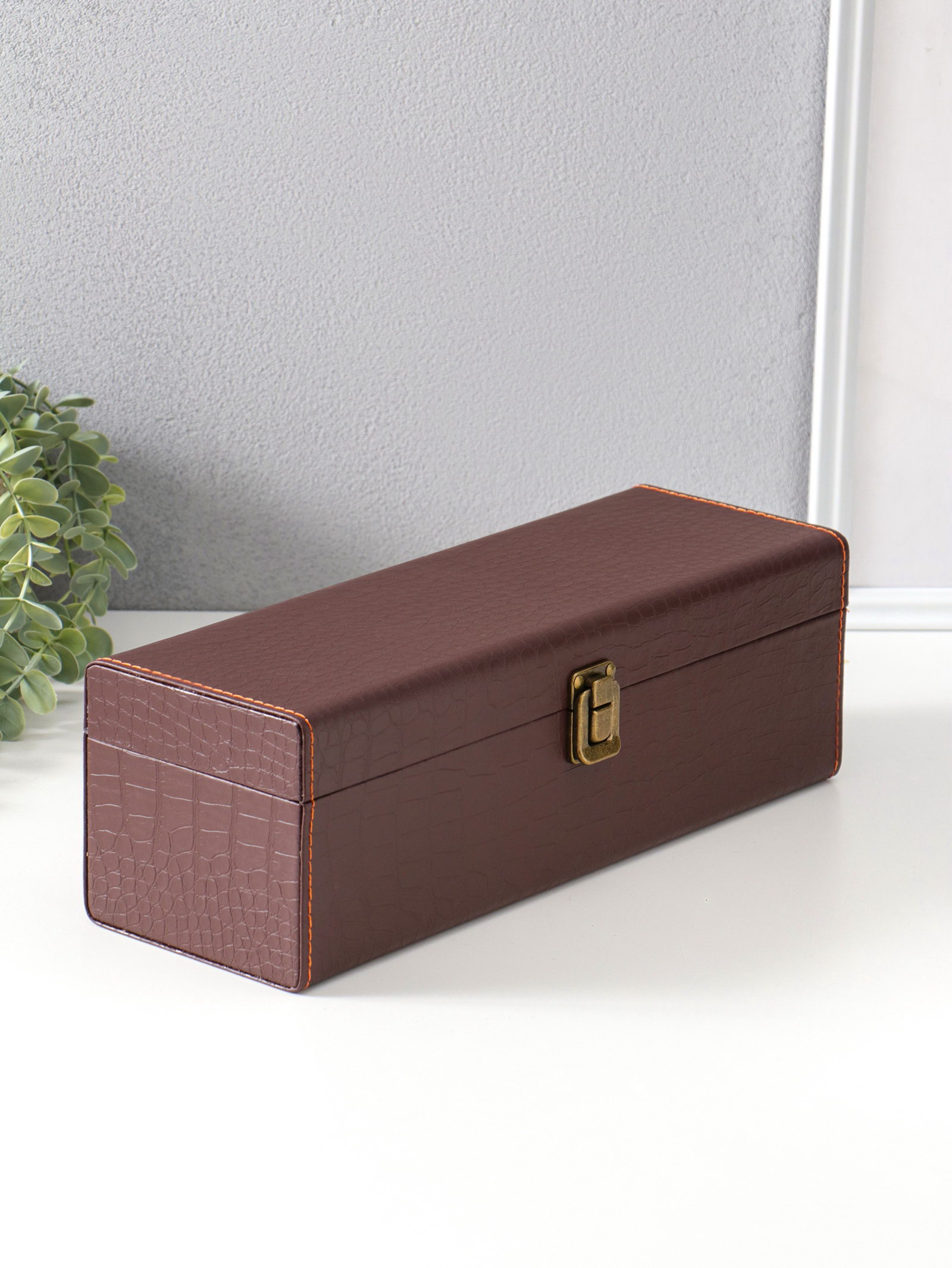 Шкатулка подарочная под бутылку "Кожа питона" и набор 4 предмета, коричневая, 35x11x12 см, 11x35x12 см., Китай