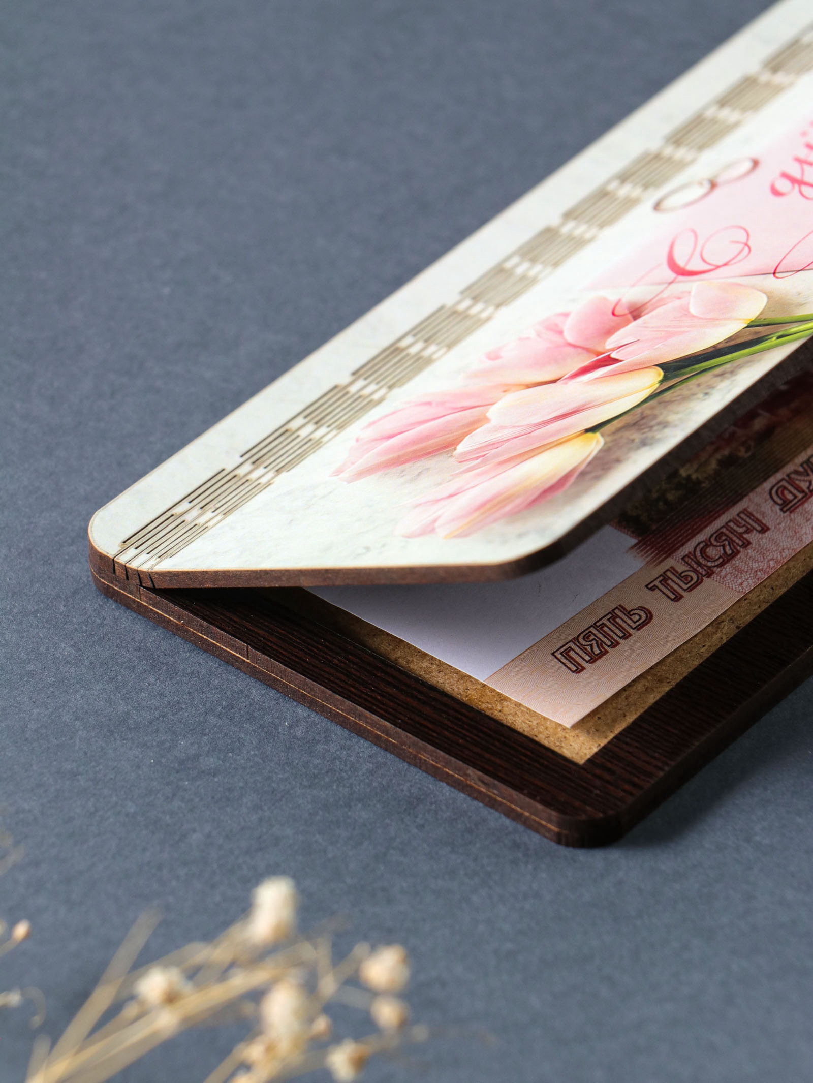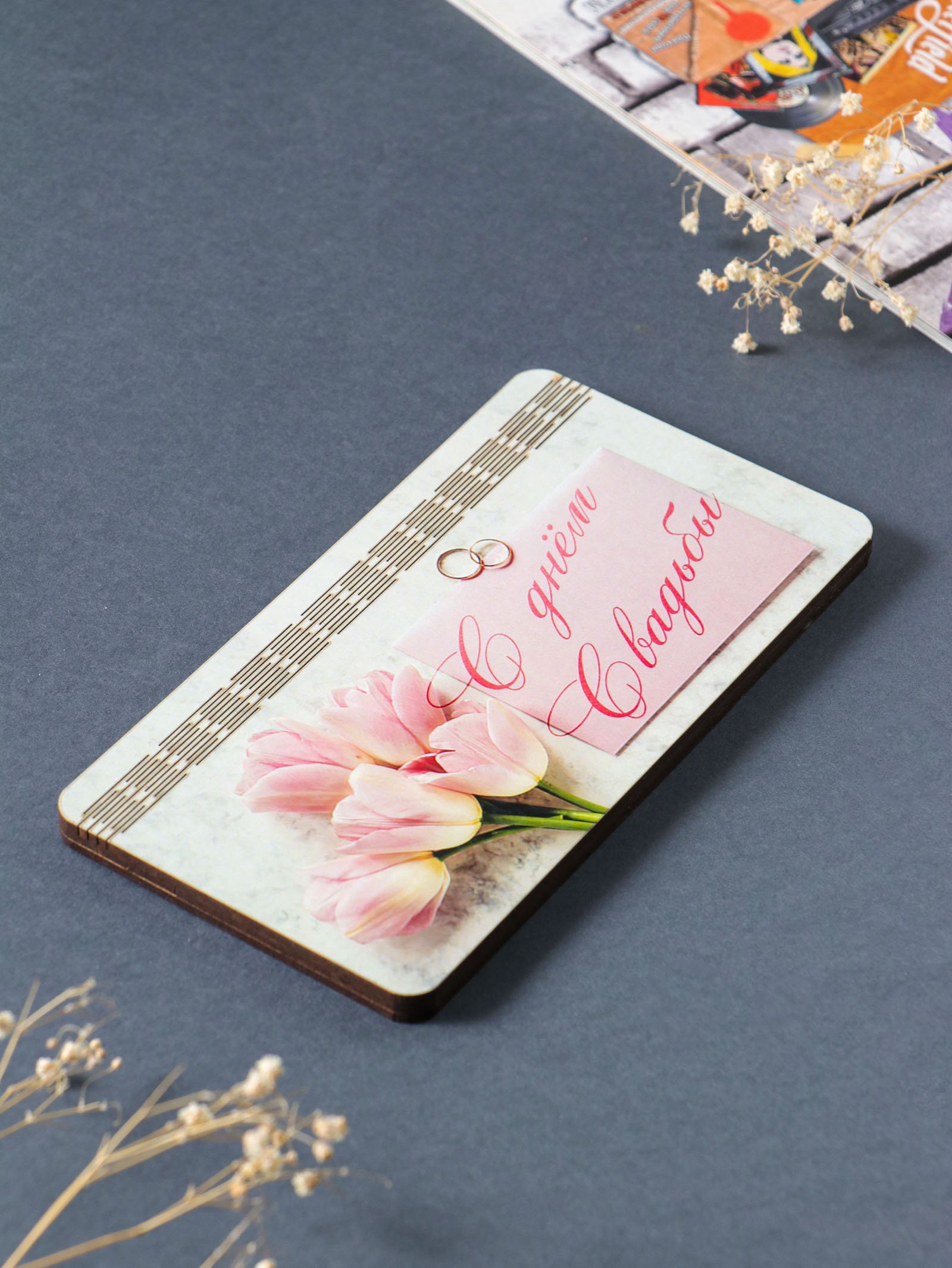Купюрница подарочная, открытка "С днём свадьбы: розовые тюльпаны", шкатулка для денег, карточек, сертификатов, 19x9.5x0.7 см, Россия