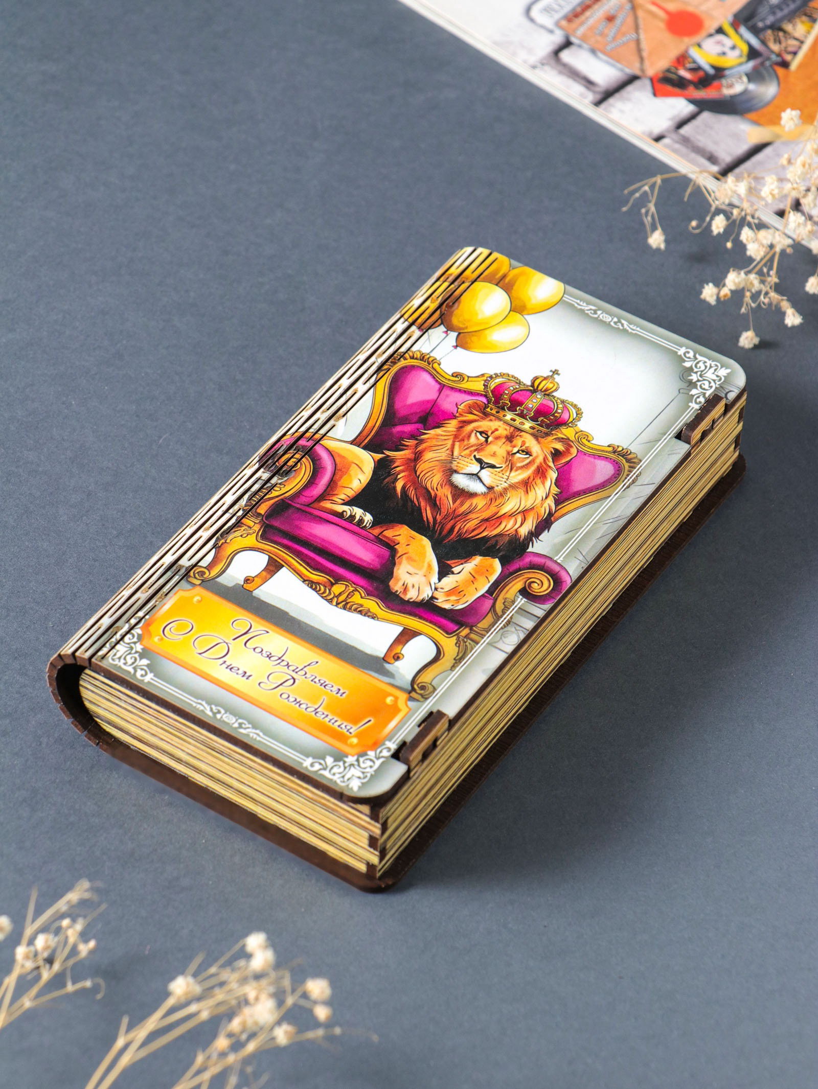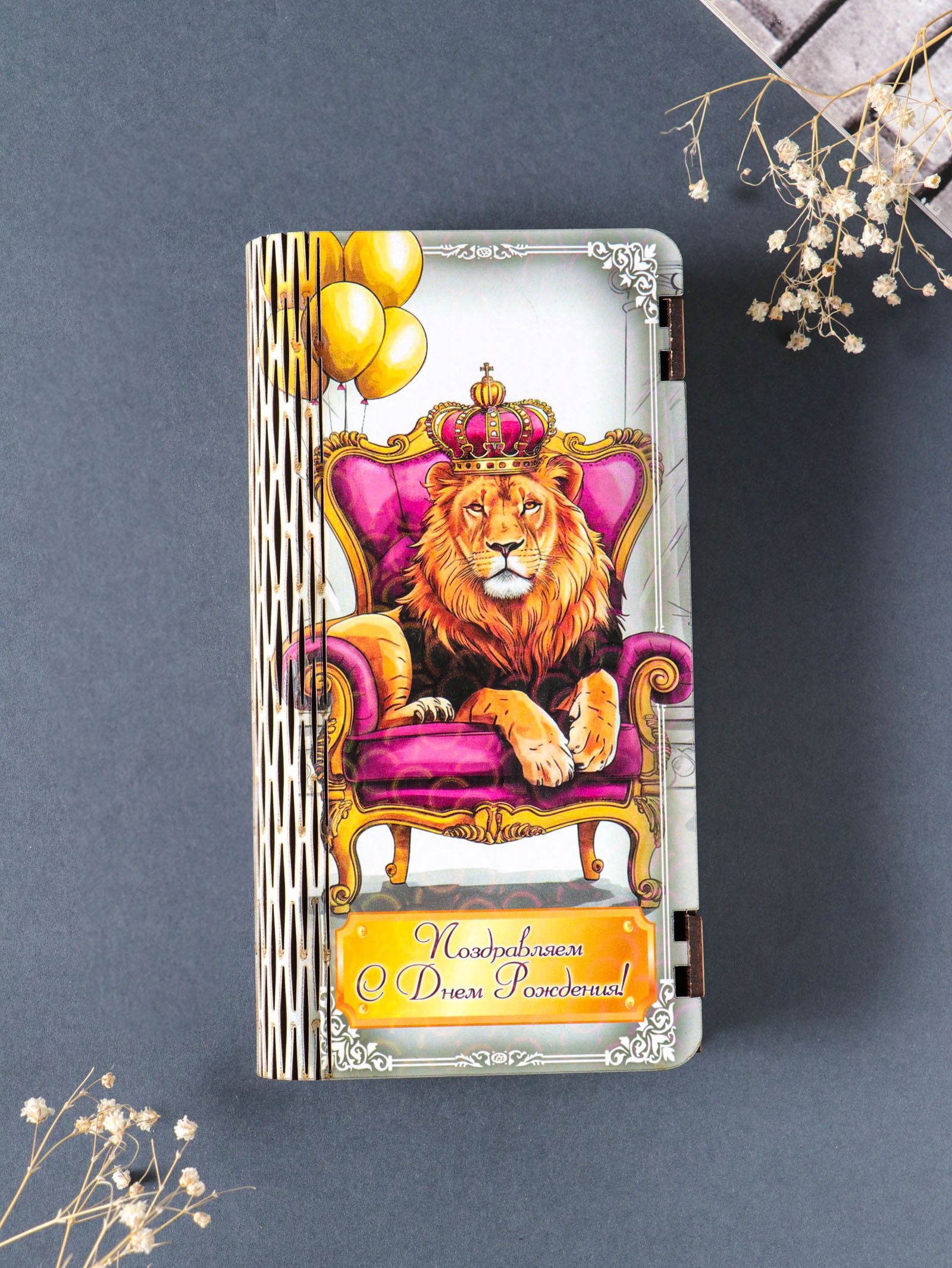 Купюрница подарочная, открытка "Поздравляем с днем рождения! Лев", шкатулка для денег, карточек, сертификатов, 19.5x11x3 см, Россия