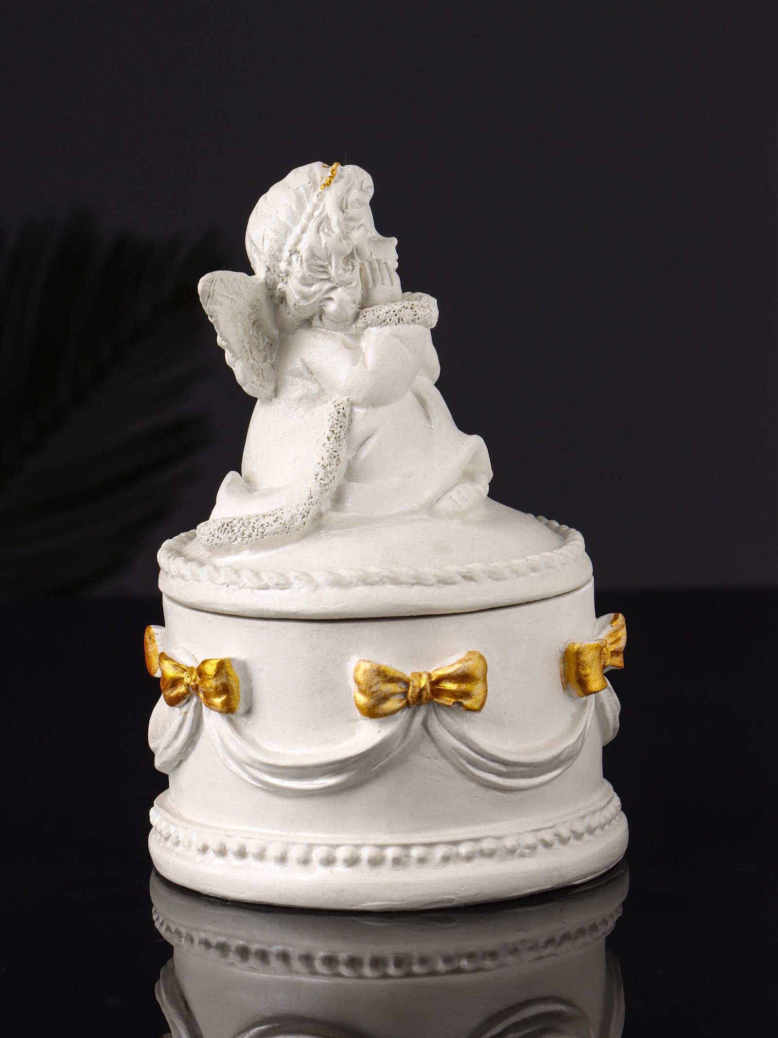 Цвет: Белый, Золотистый Размер упаковки: 9 x 12 x 9 см. tnved: 6809900000 Температурное ограничение: Нет Форма: Круглая Высота, см: 12 Длина, см: 9 Ширина, см: 9 Элегантная шкатулка, выполненная из гипса с перламутровым покрытием, воплощает утонченность и функциональность в одном изделии. Фигурная форма с изящной ангелочкой на крышке добавляет изделию особый шарм и символическую глубину, делая её не просто хранилищем украшений, а настоящим украшением интерьера. Размеры 12x9x9 см оптимальны для комфортного размещения колец, серёжек и других мелких аксессуаров, а круглая форма способствует удобству использования. Бело-золотистые оттенки с перламутровым блеском создают эффект лёгкости и праздничности, подчеркивая индивидуальность и стиль владельца.