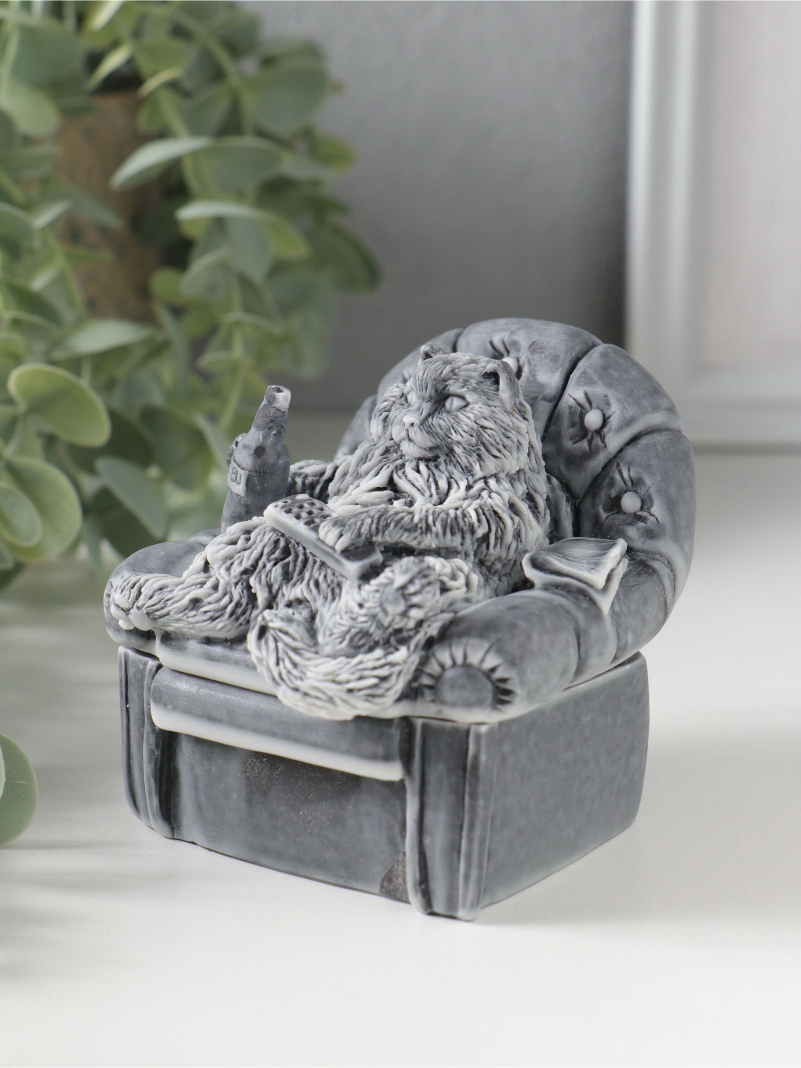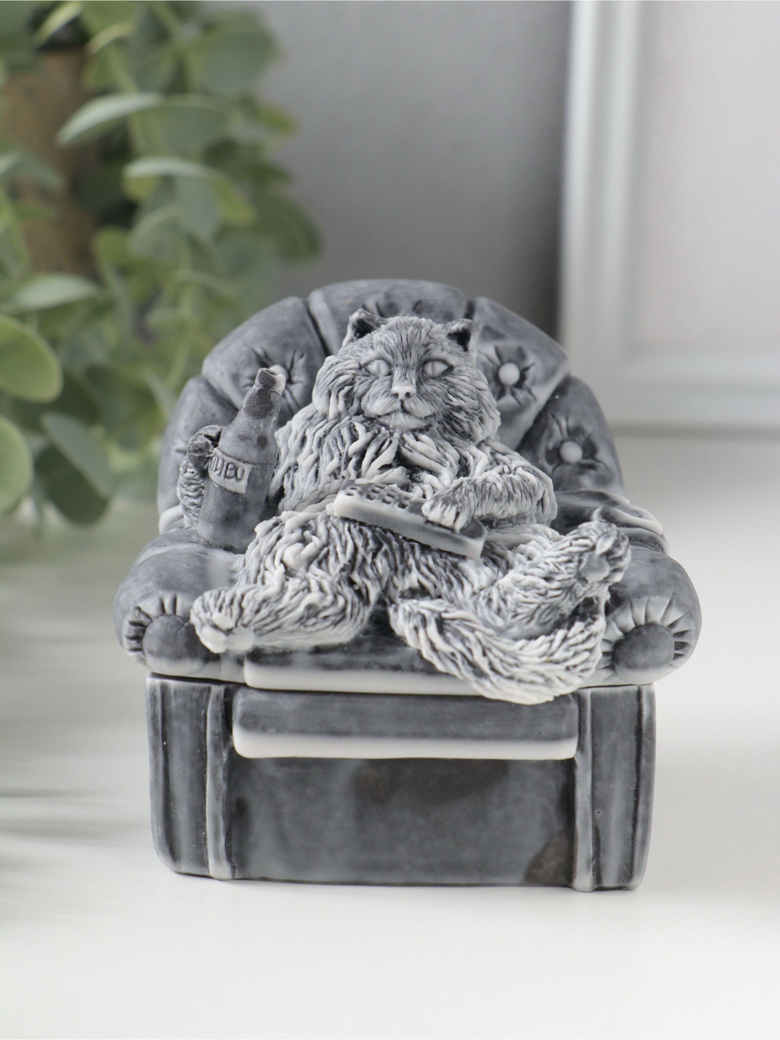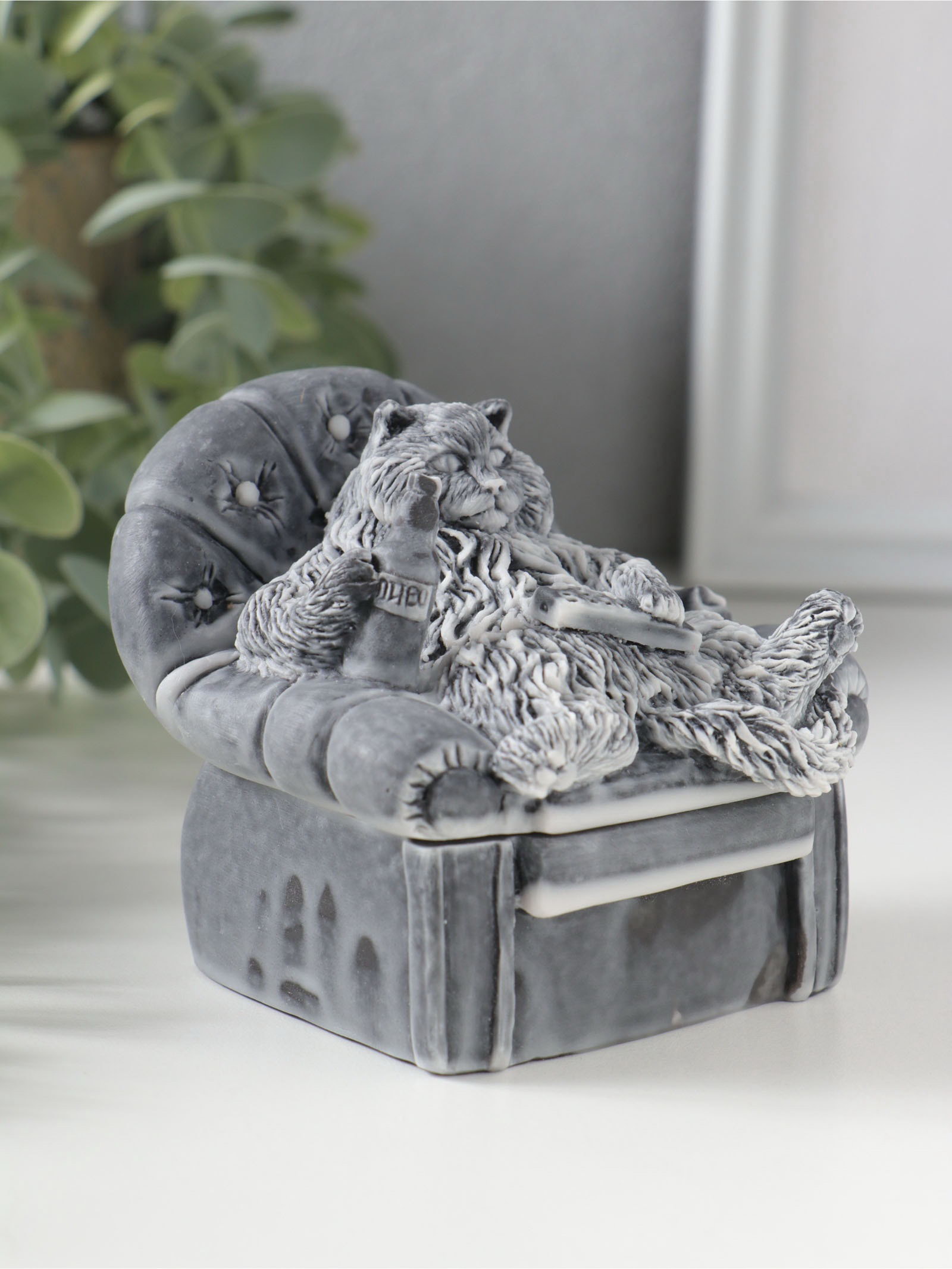 Шкатулка для украшений "Кот в кресле на крышке", 8 см, Сувениры из мраморной крошки, Россия